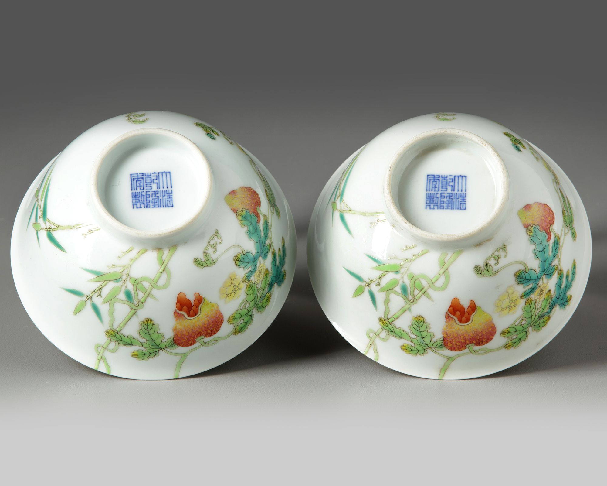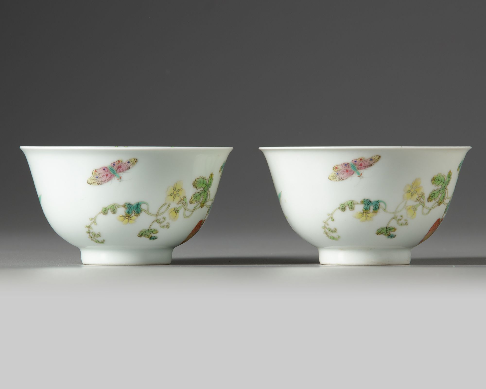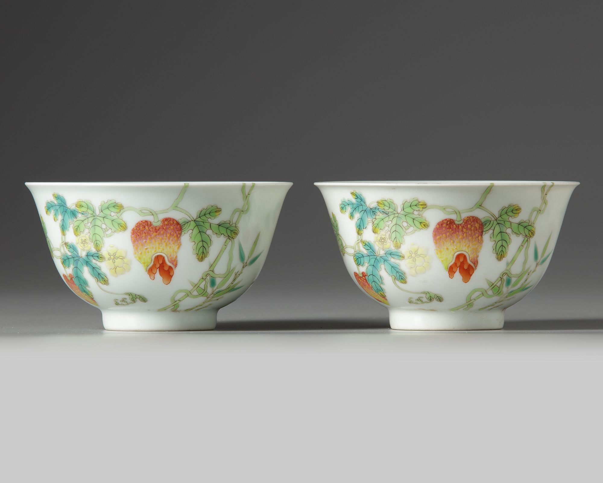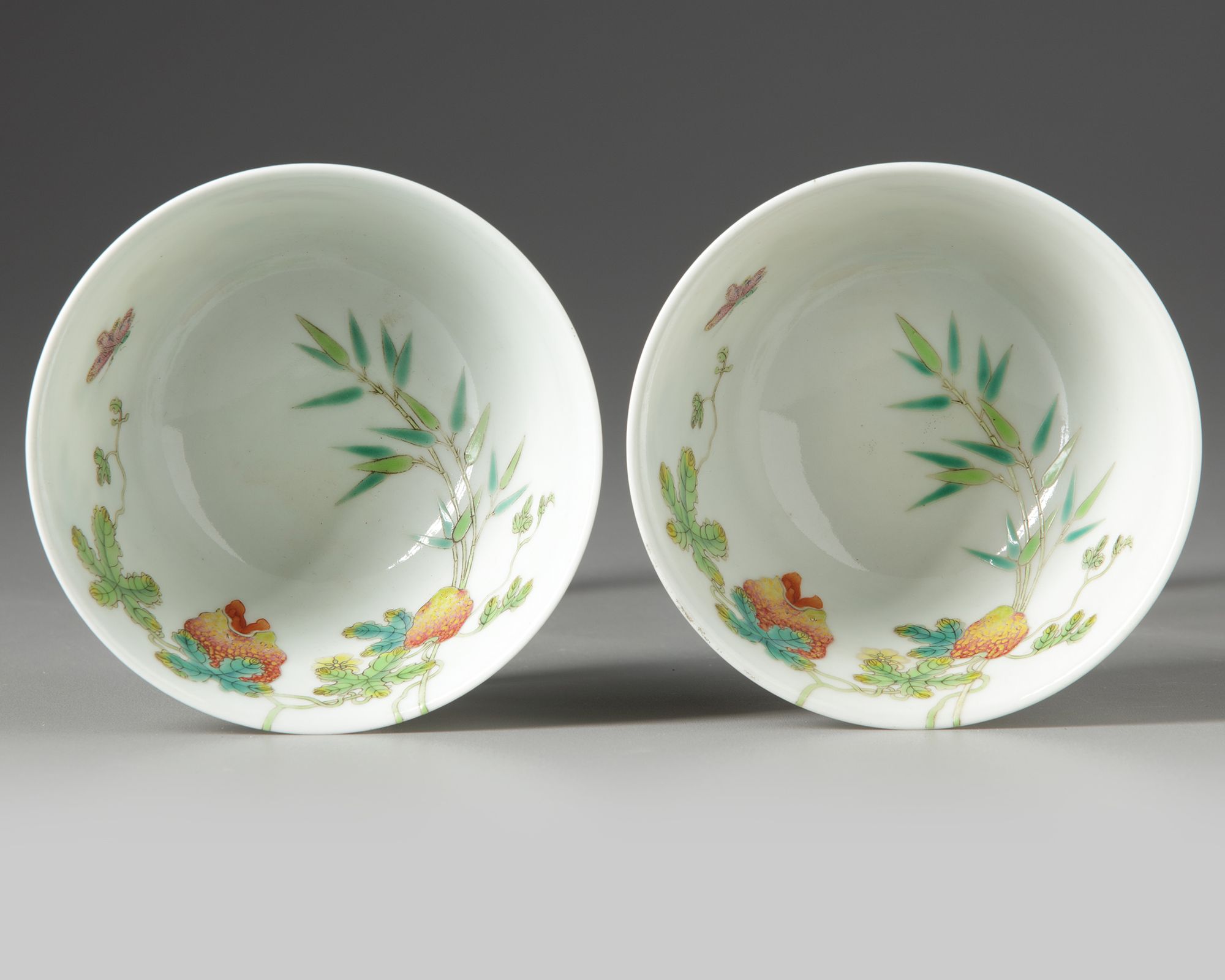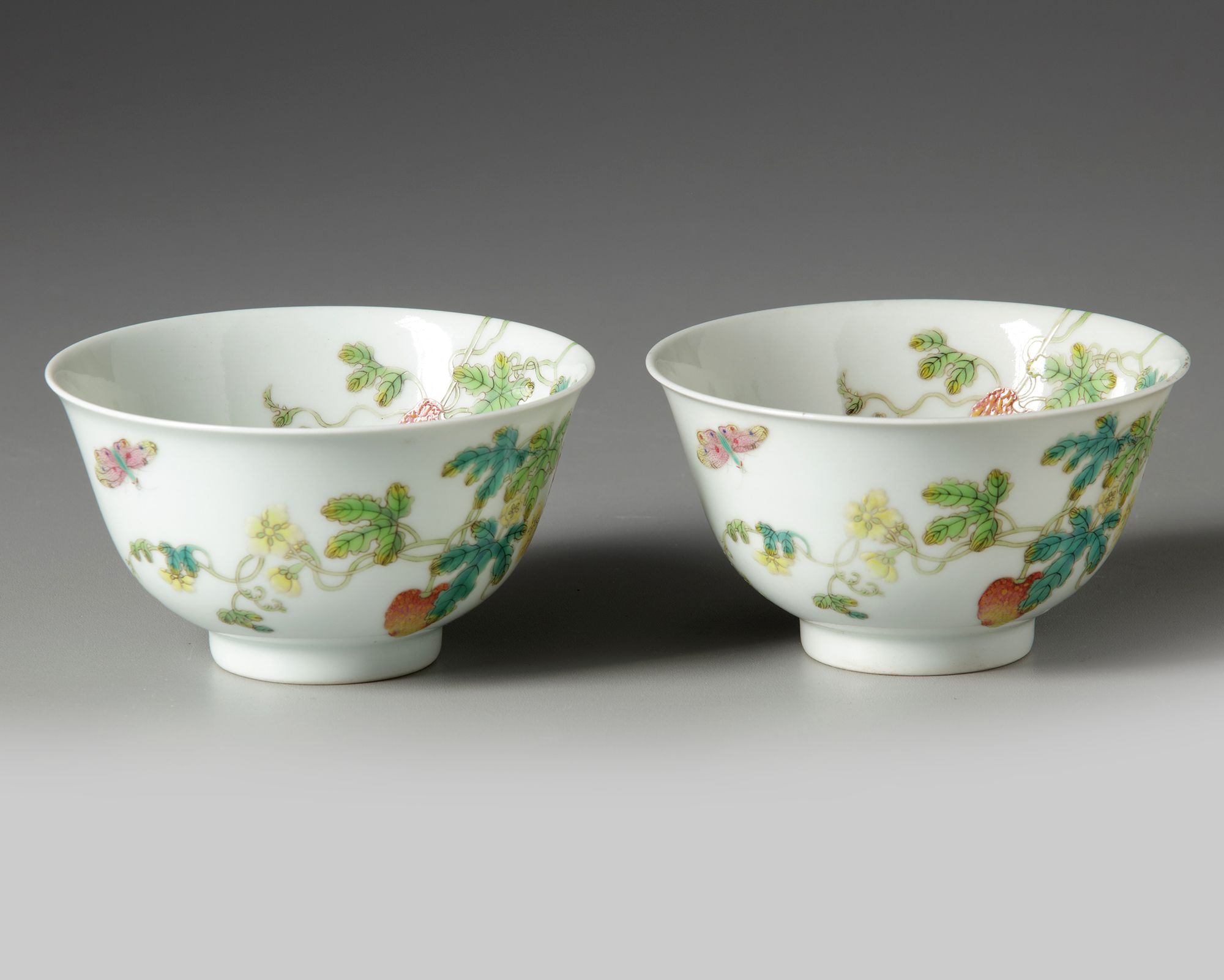 The bowls are each decorated on the exterior with a fruiting and flowering vine bearing ripe bitter melons and bamboo which continue over the everted rim into the interior, all below butterflies.