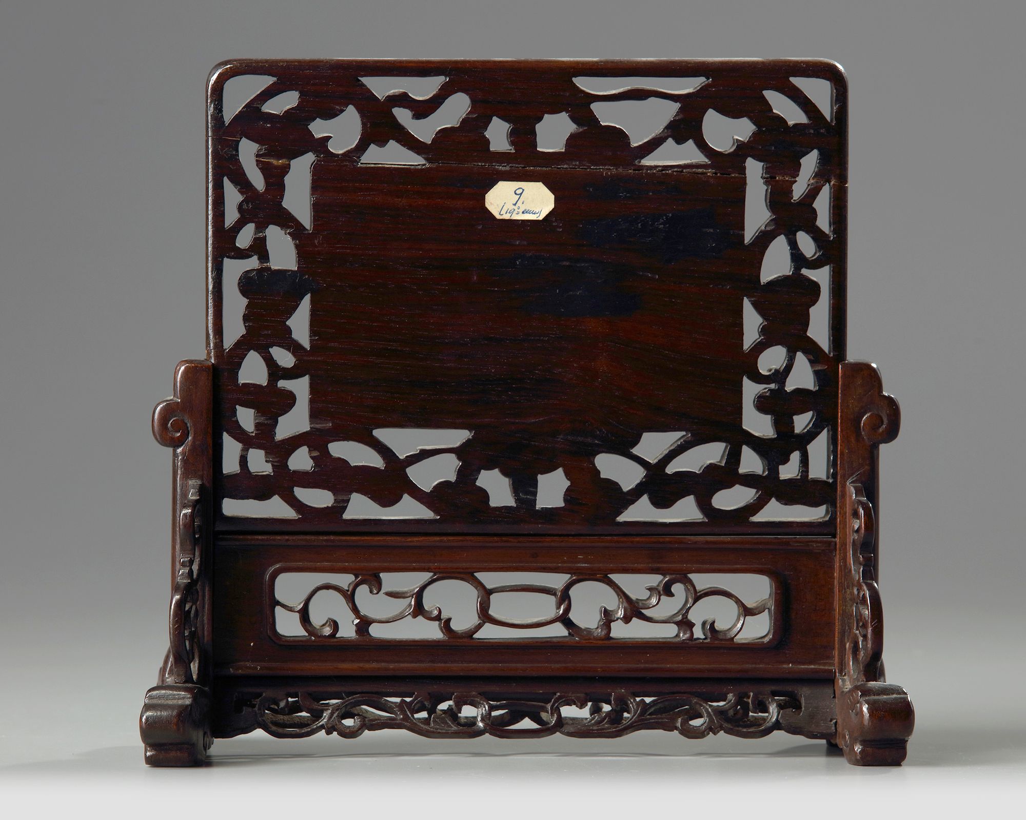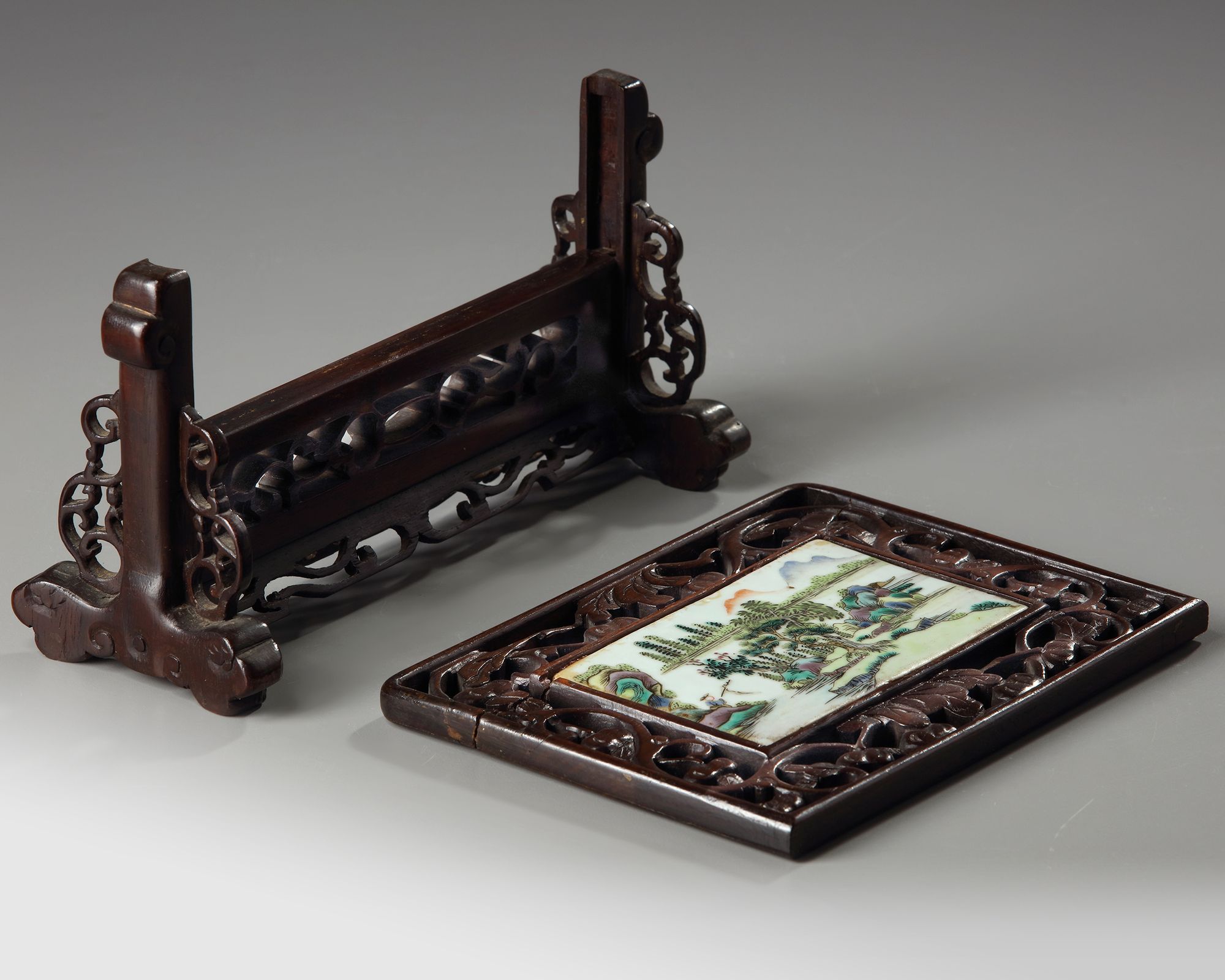 The plaque is enamelled in green, blue, and purple enamels with a figure fishing amongst the rocks in a mountainous river landscape. The wood frame is carved in openwork with double gourds.