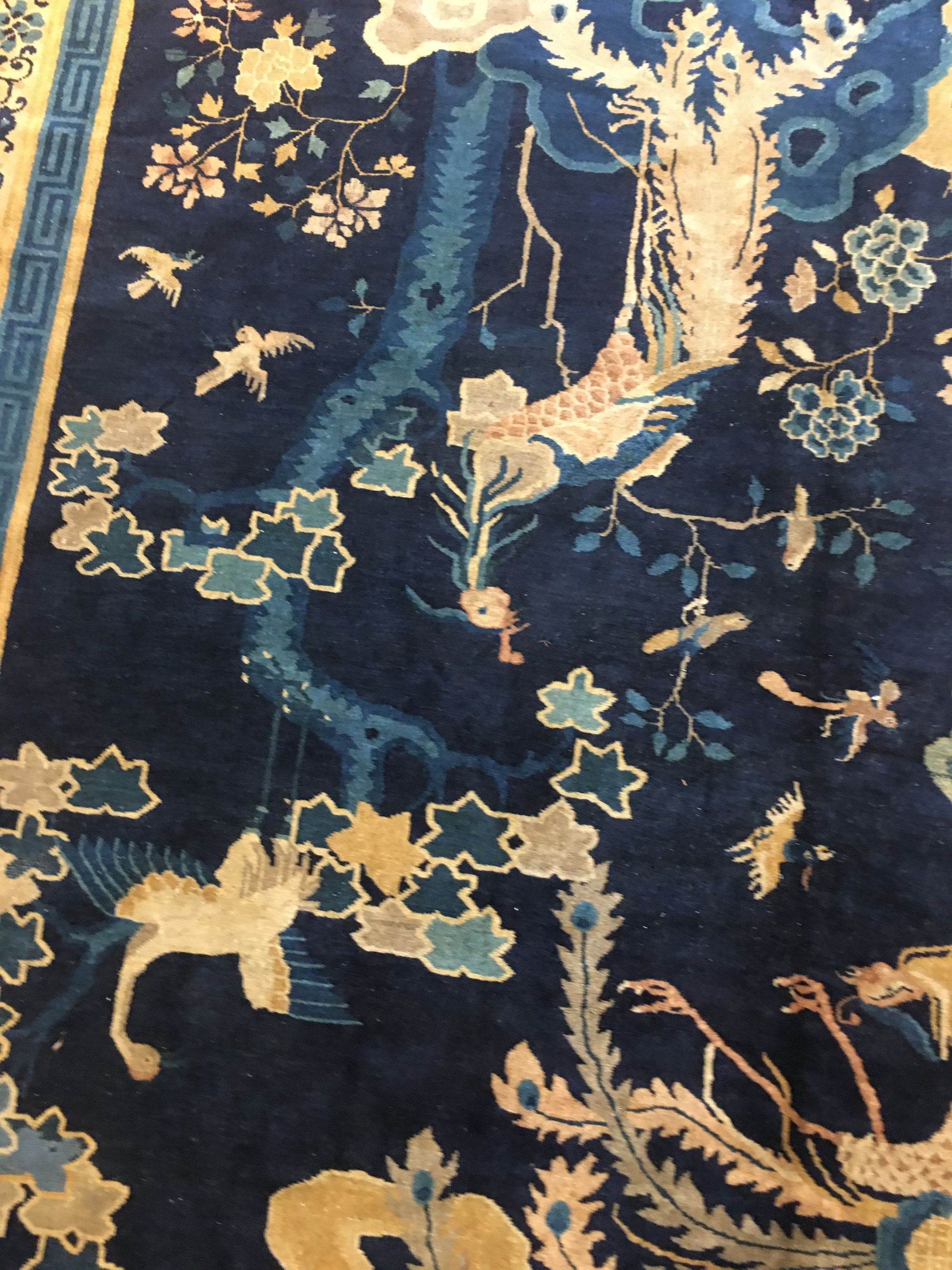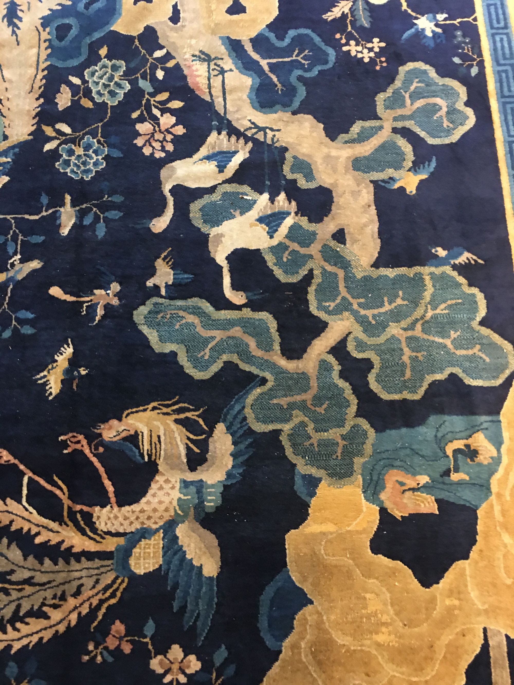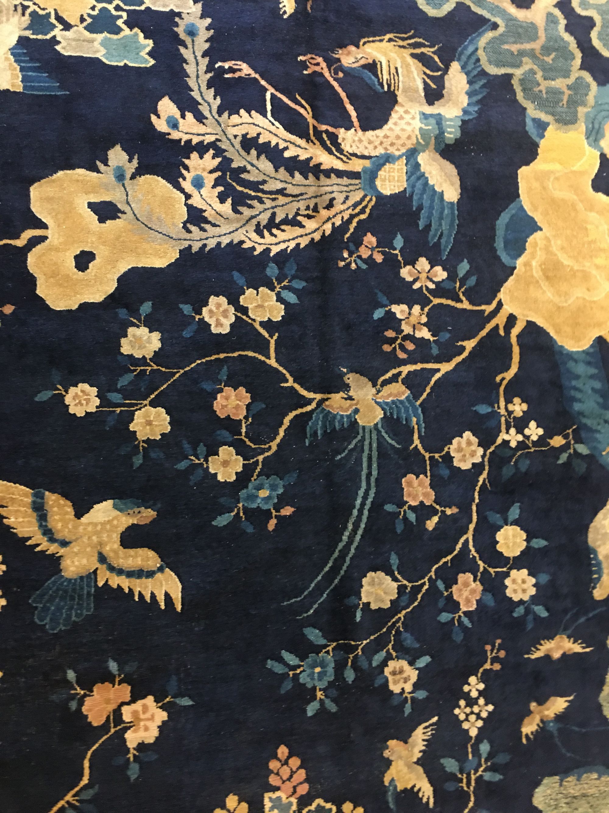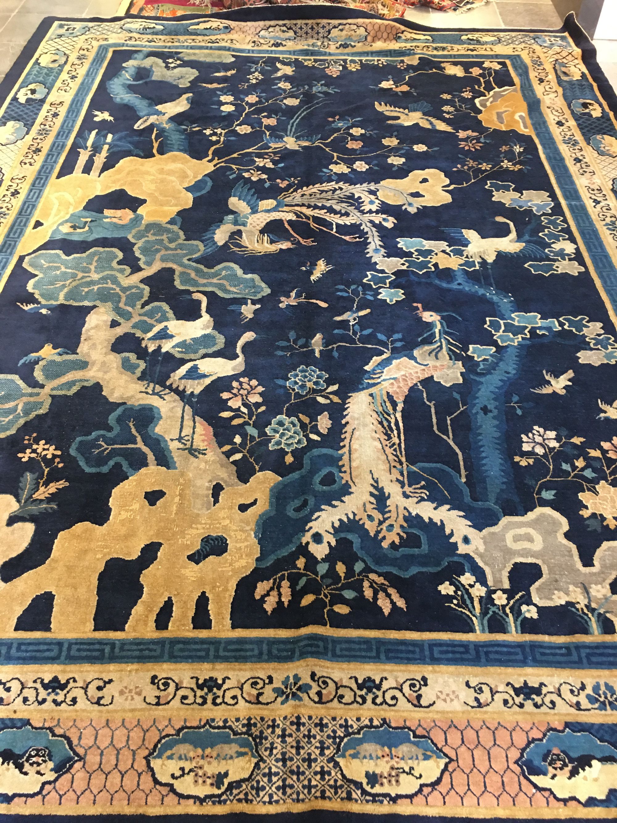 A large Chinese carpet hand knotted with pheasants, cranes and other birds amongst flowers on a blue ground.