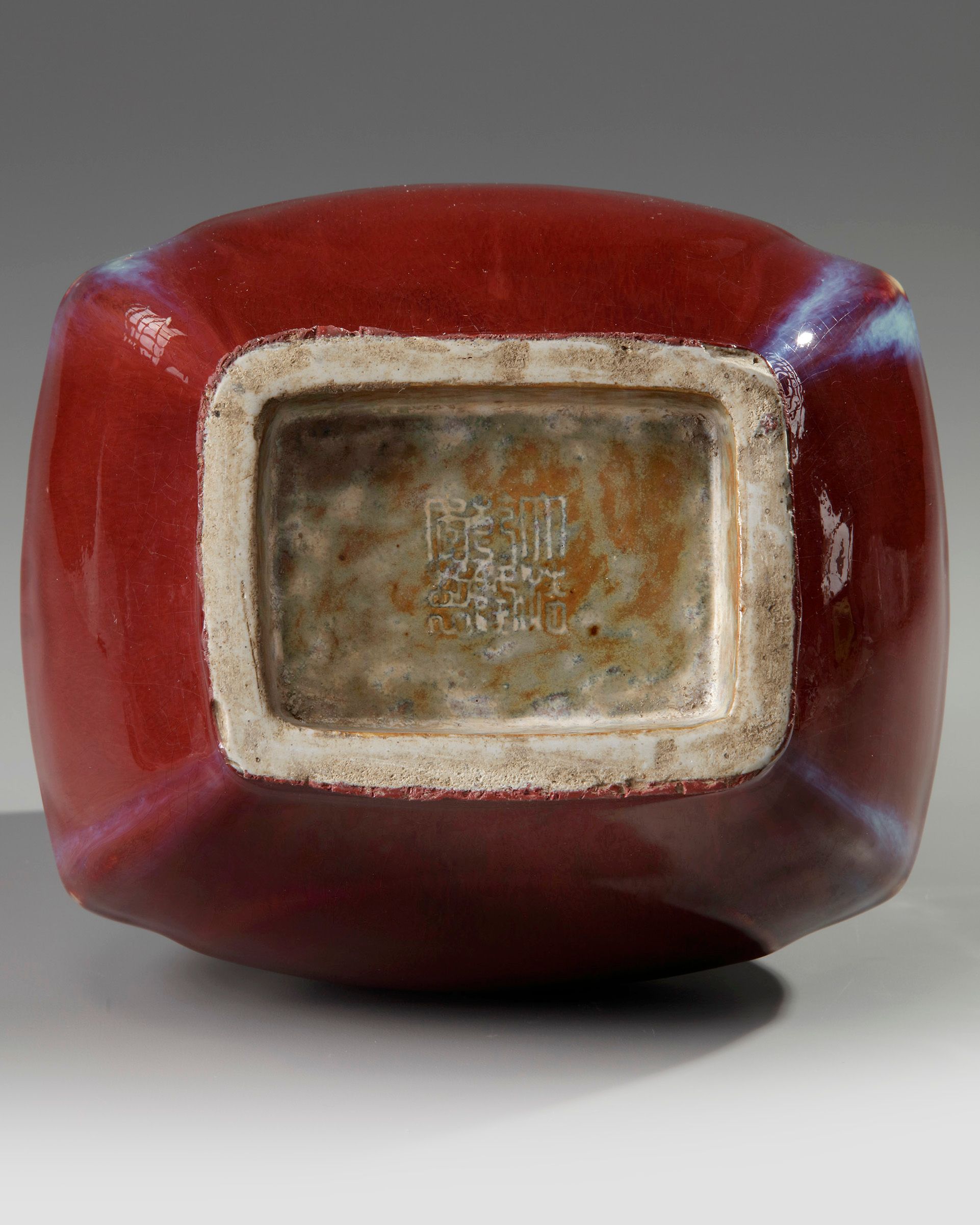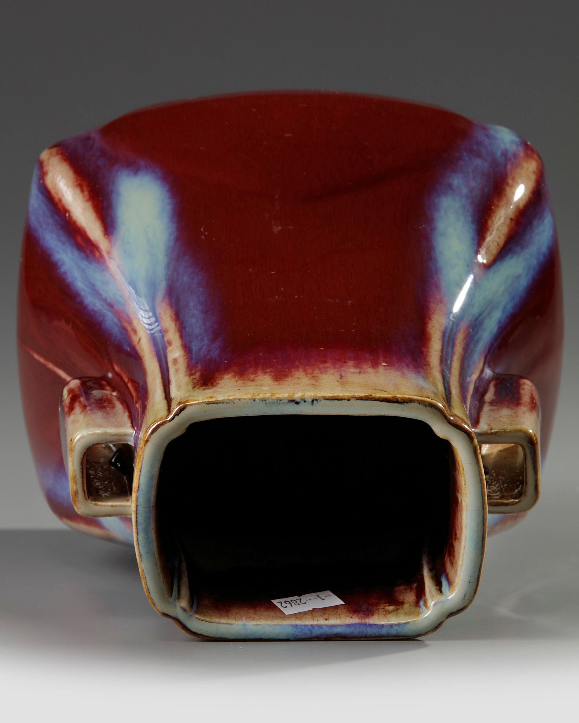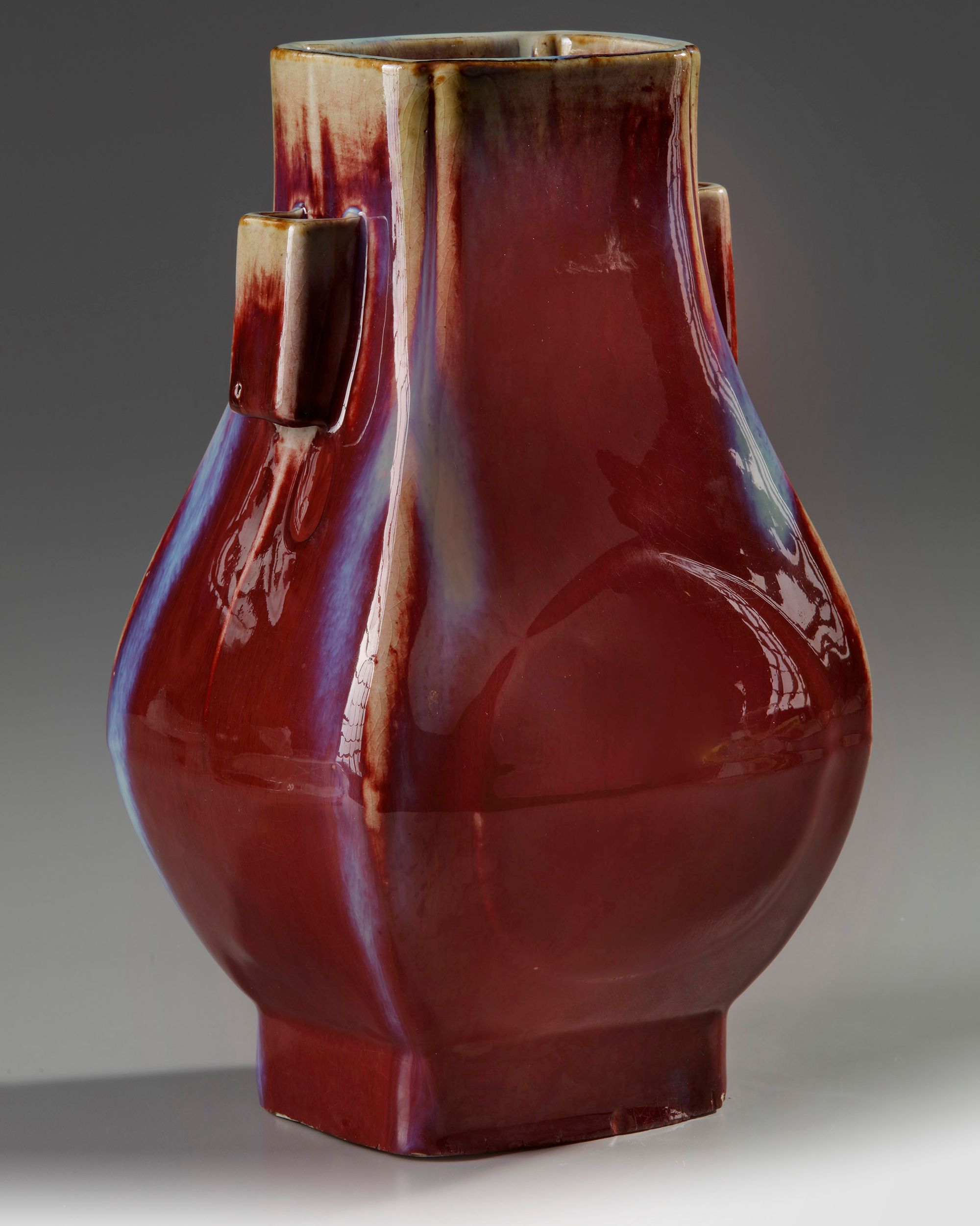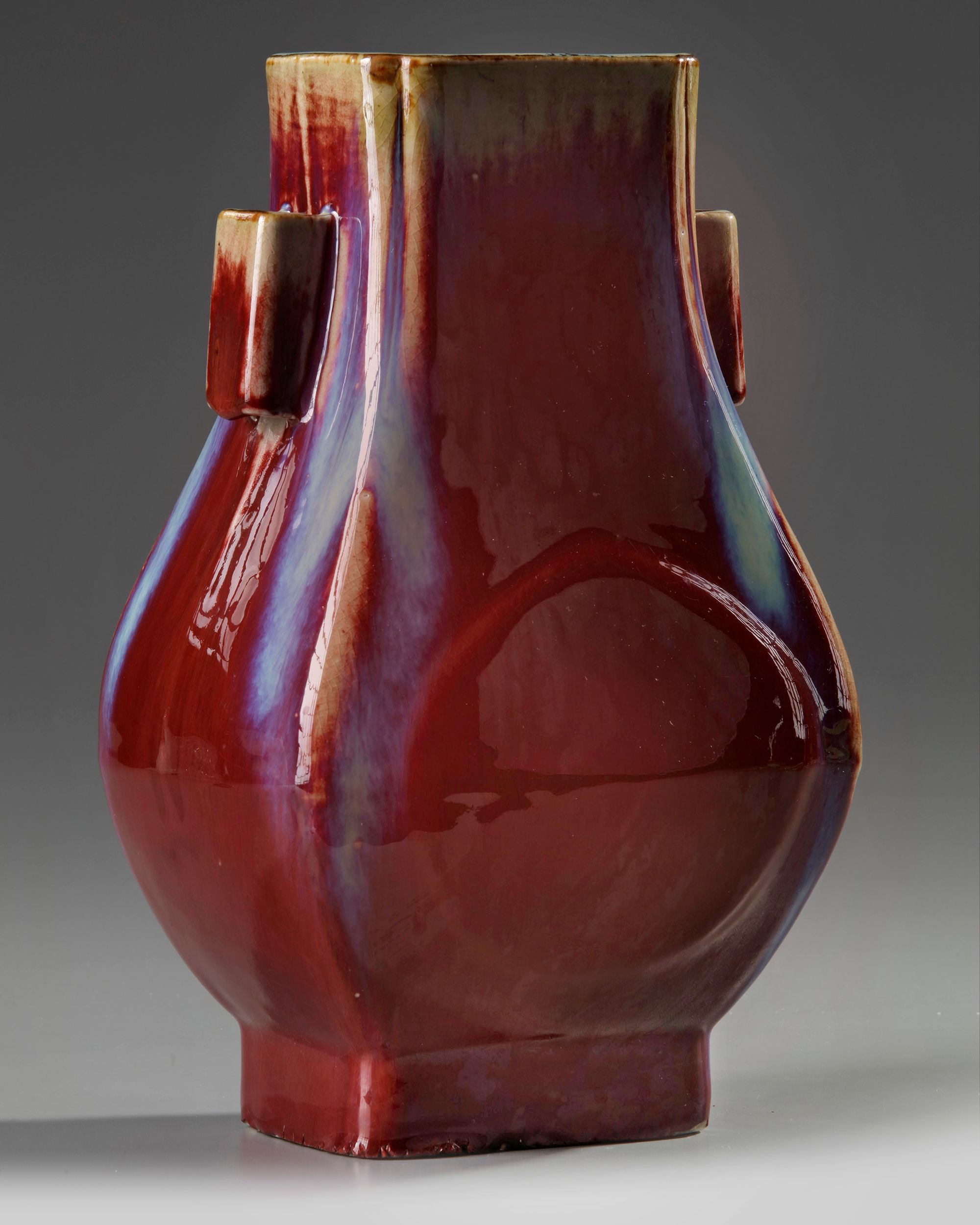 The pear-shaped vase is decorated with moulded peach-shaped panels and a pair of applied tubular handles to neck. It is covered in a finely crackled thick strawberry-red glaze ranging streaked with sky blue and purple, thinning to beige on handles and edges. The base is covered with a mottled cafe-au-lait glaze and an incised apocryphal Qianlong mark.