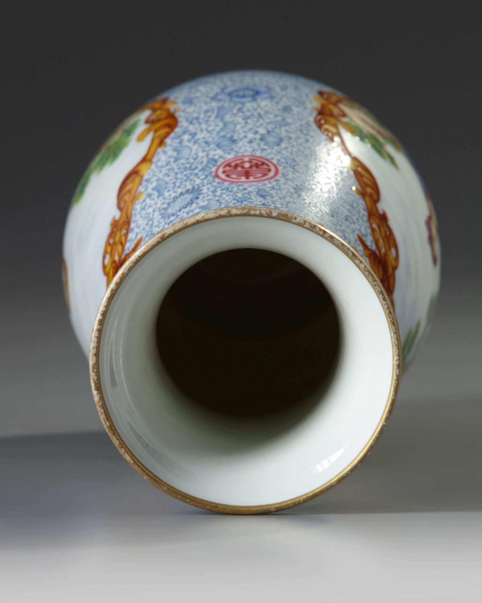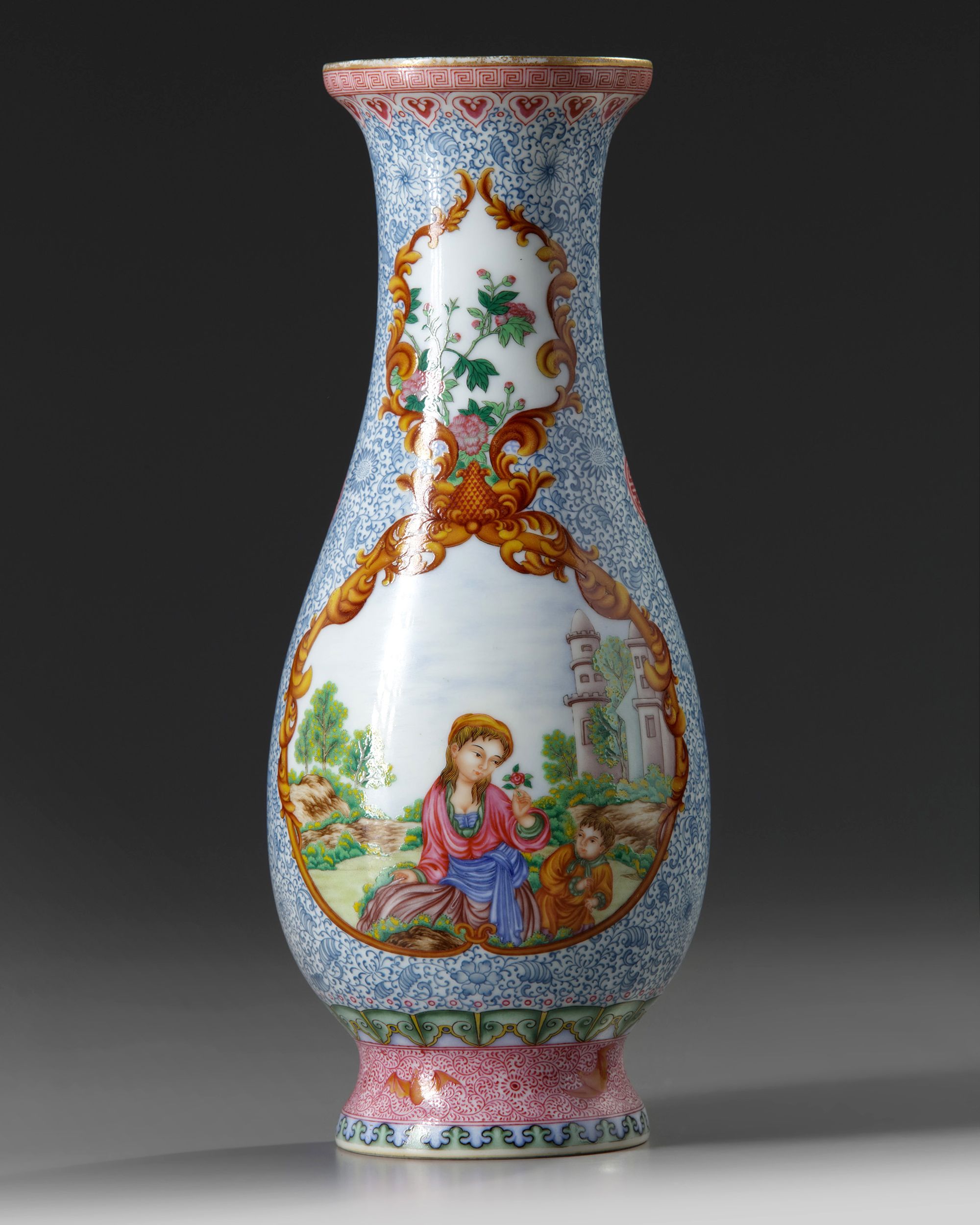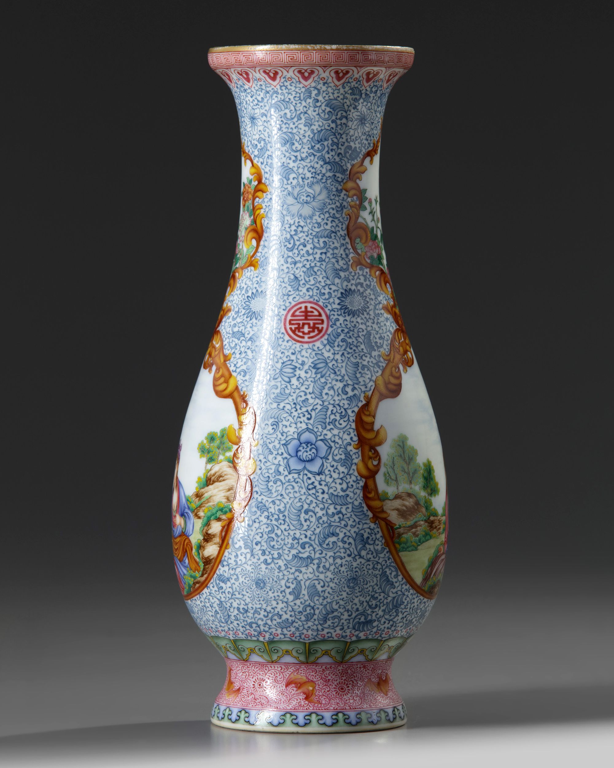 The vase is finely decorated to both sides with panels shaped by acanthus leaves, one side with a lady holding a flower and a boy below a smaller panel of peonies, and to the other side with a further lady and a boy below a panel of roses, all reserved on a blue-enamelled floral ground with a puce-enamelled shou character. The foot decorated with further flowers in puce enamel and iron-red bats. The base with an apocryphal Qianlong mark.