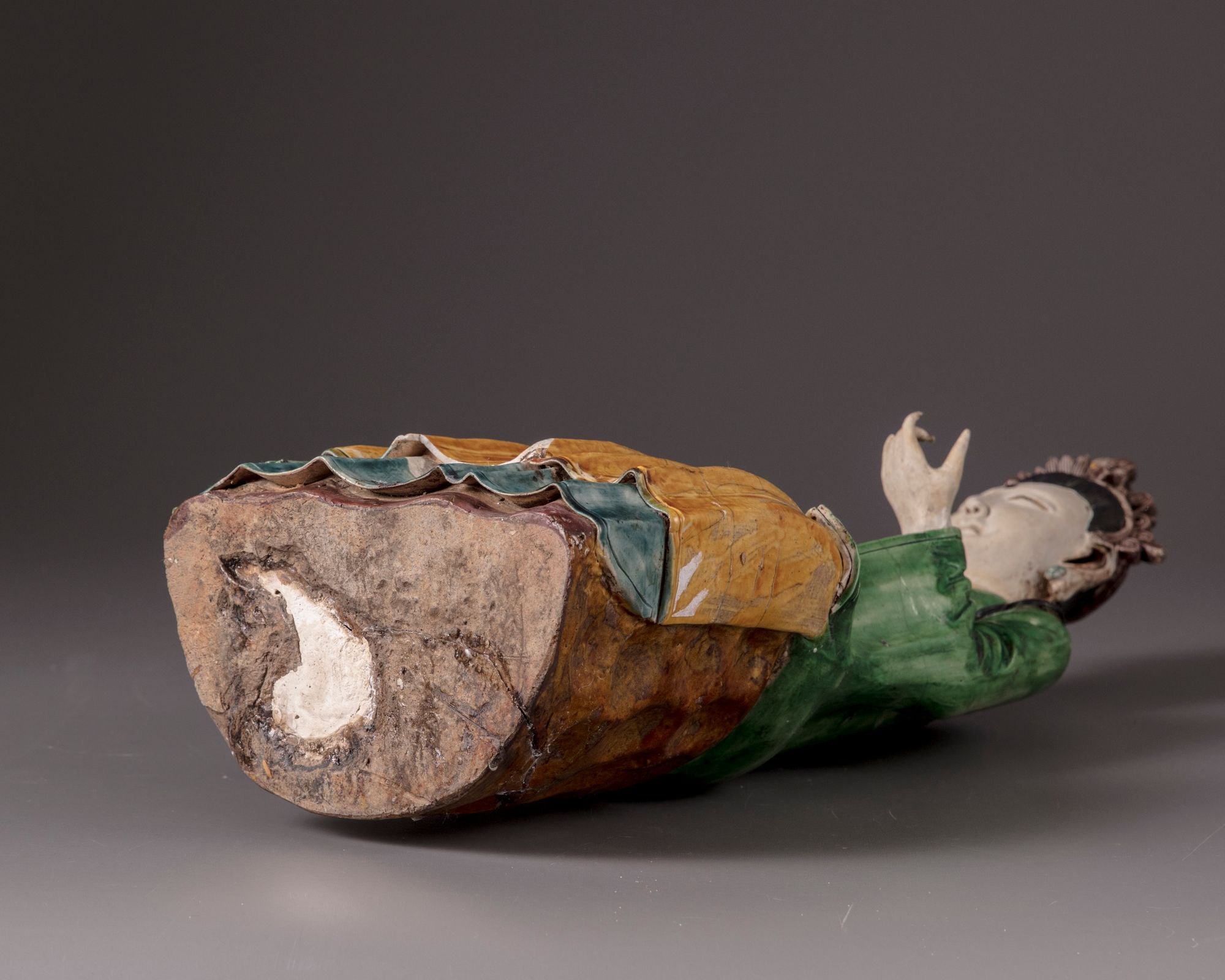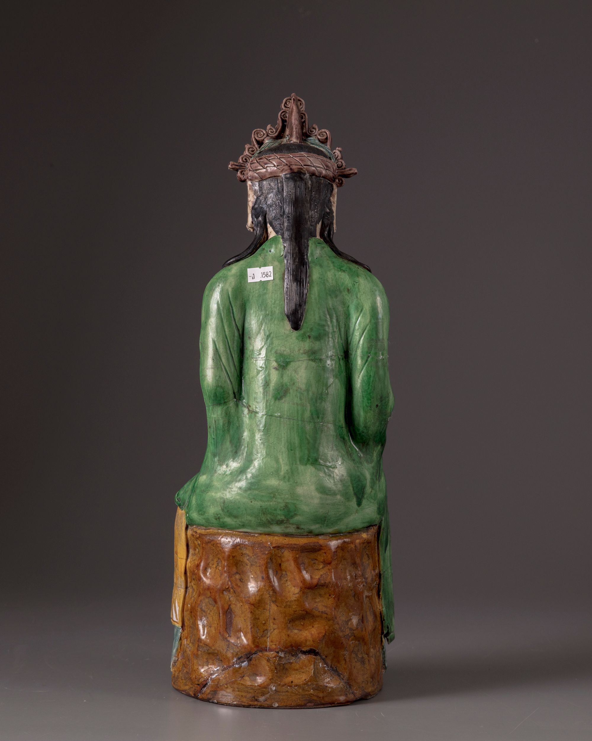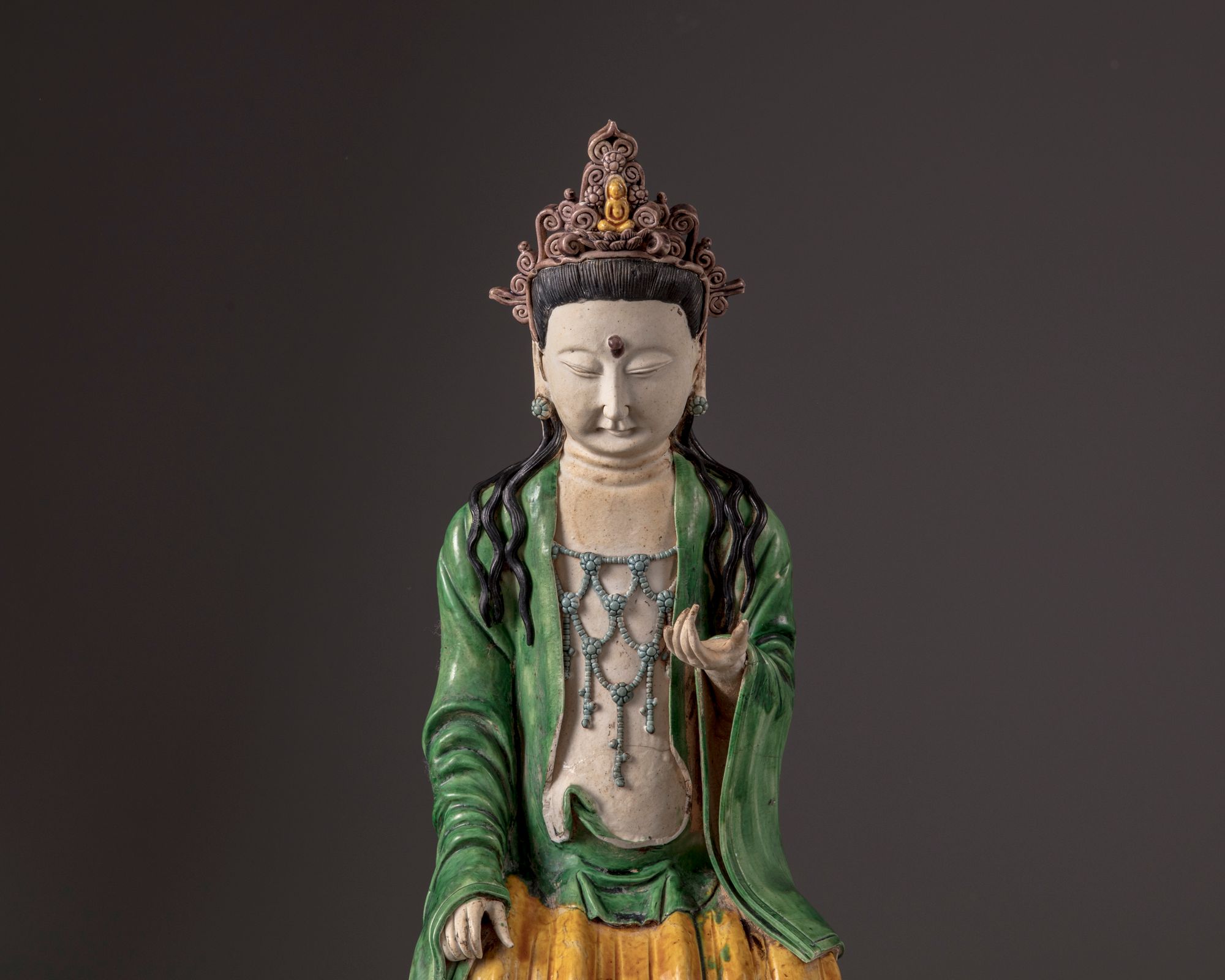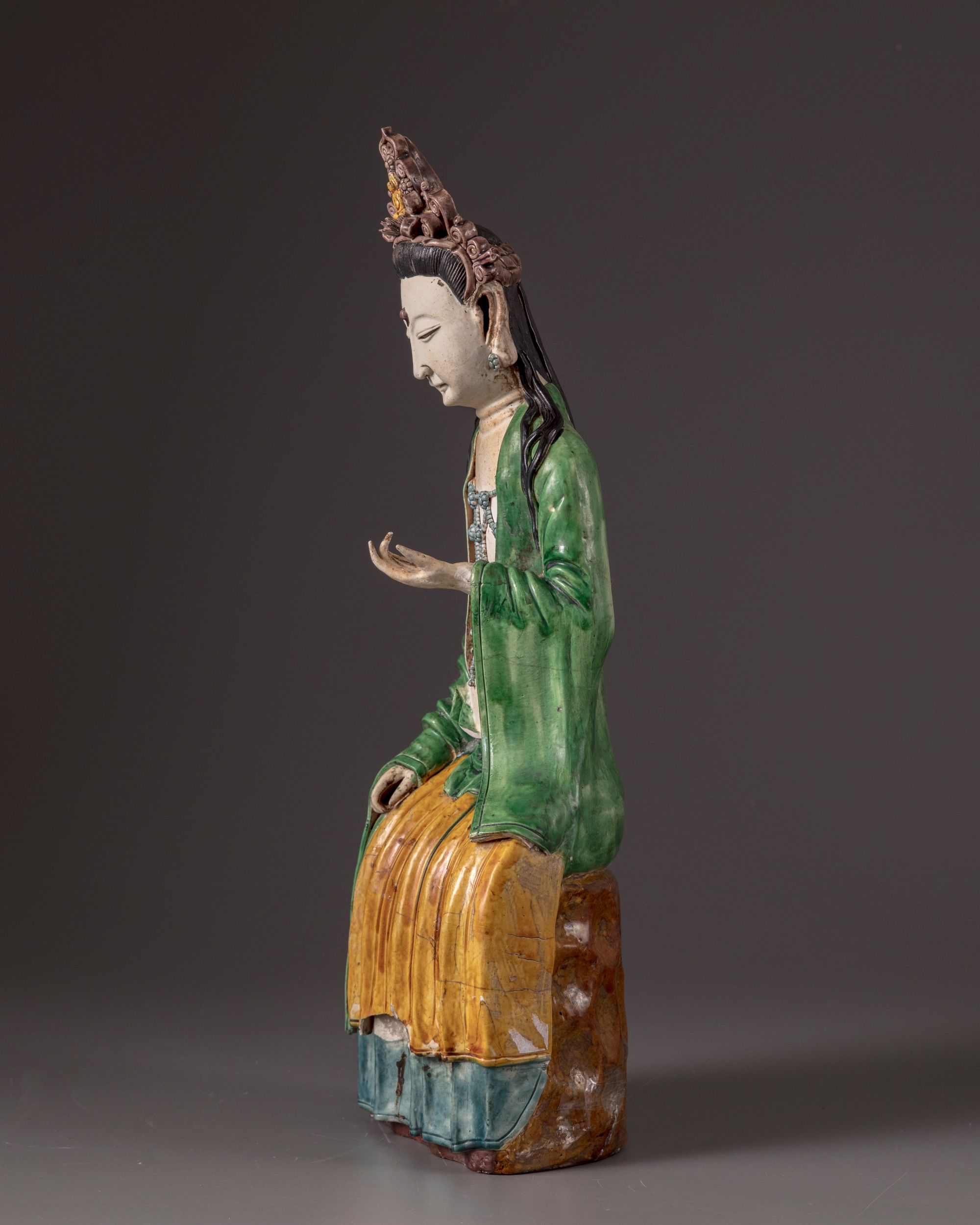 The figure is modelled with the upper body gently leaning forward, seated on a stand with the right hand resting on the knee. She wears with a finely decorated crown with floral designs on her head with braids over the shoulder and the back. The upper body with a network of beaded jewellery, suspended above the multi-folds of the green glazed robe, pooling in recesses.