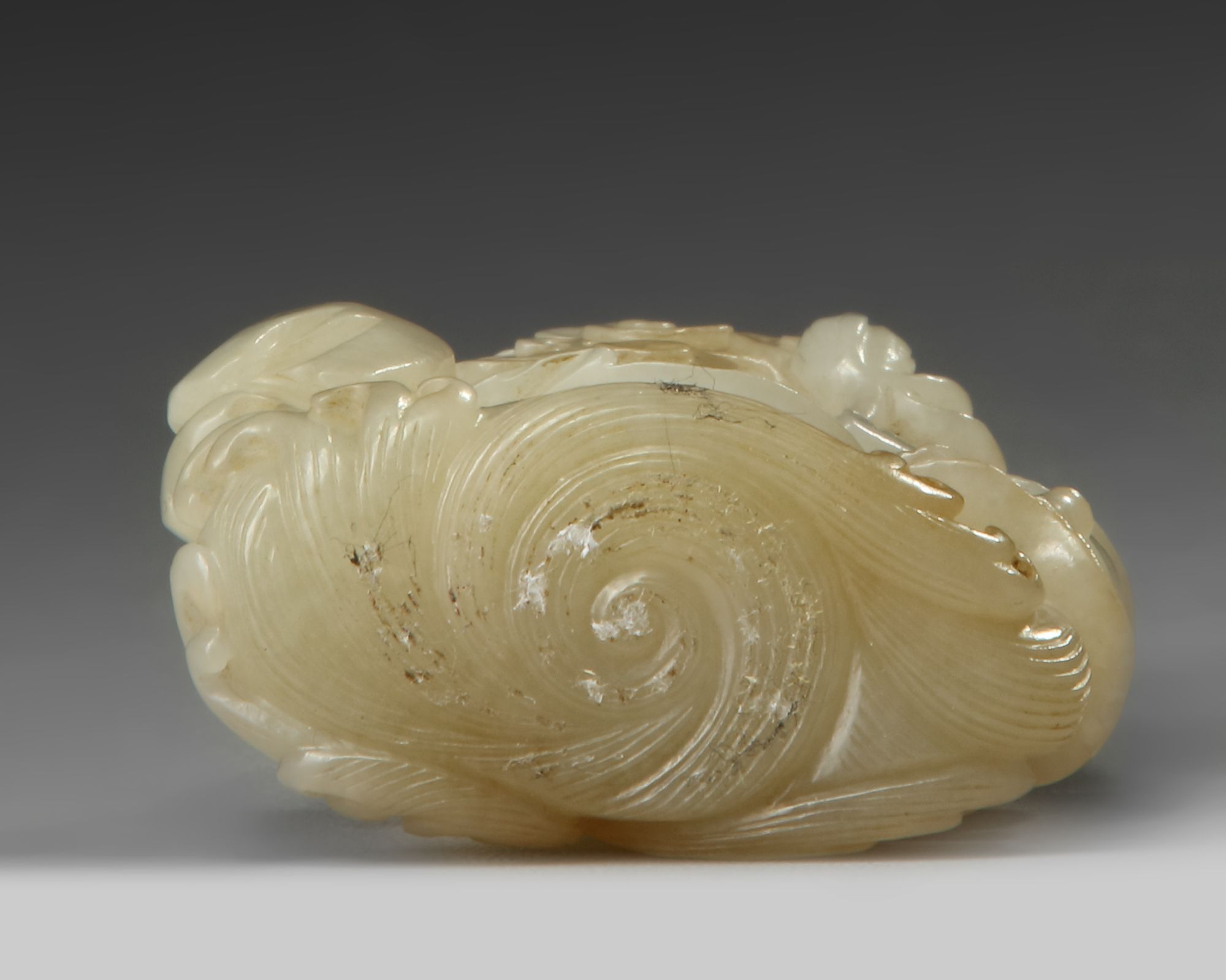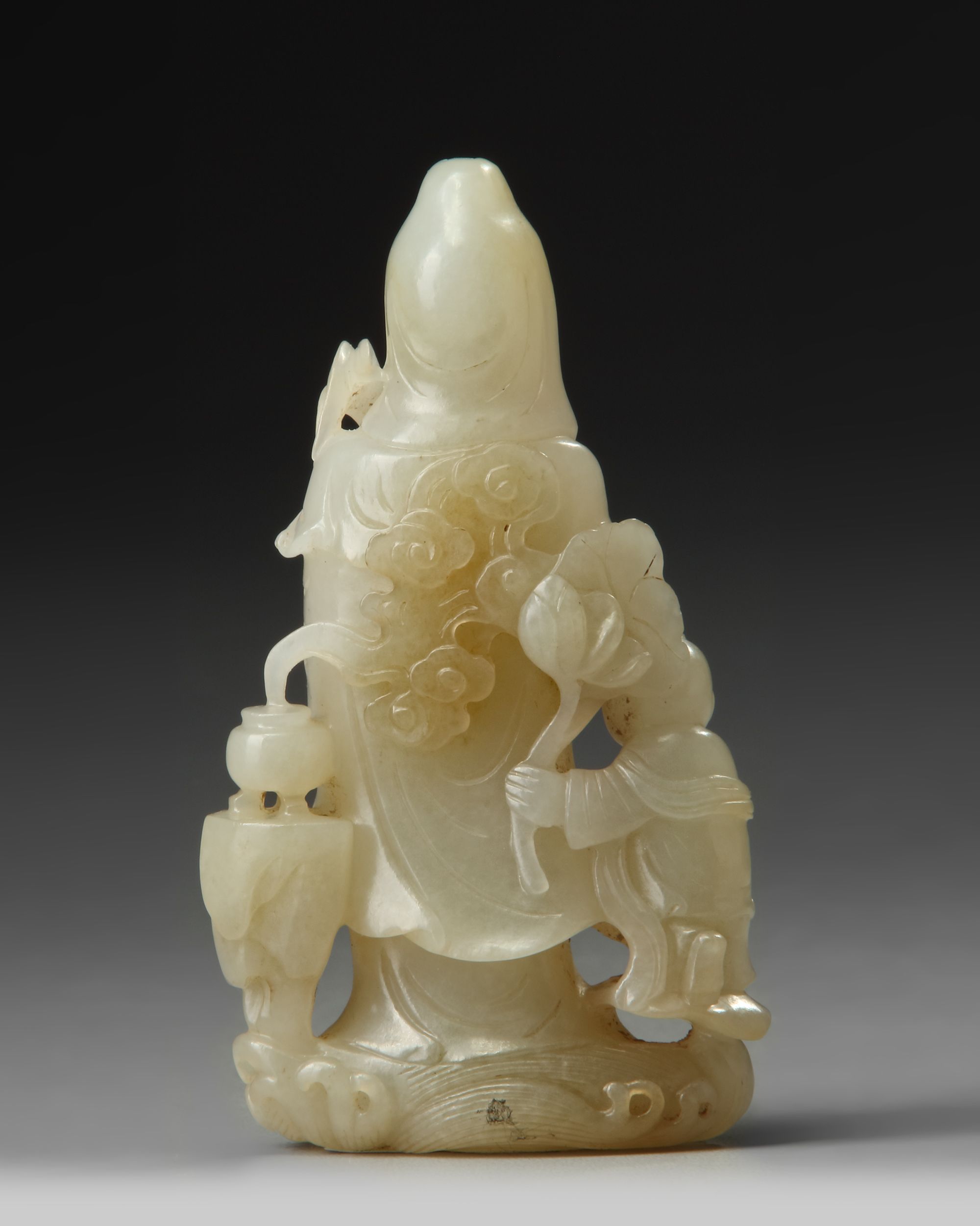 The jade of an even pale tone. The carving depicts Guanyin and a boy, the Guanyin is pouring water from a bottle, behind her a burning censer. The boy is holding a lotus-flower .