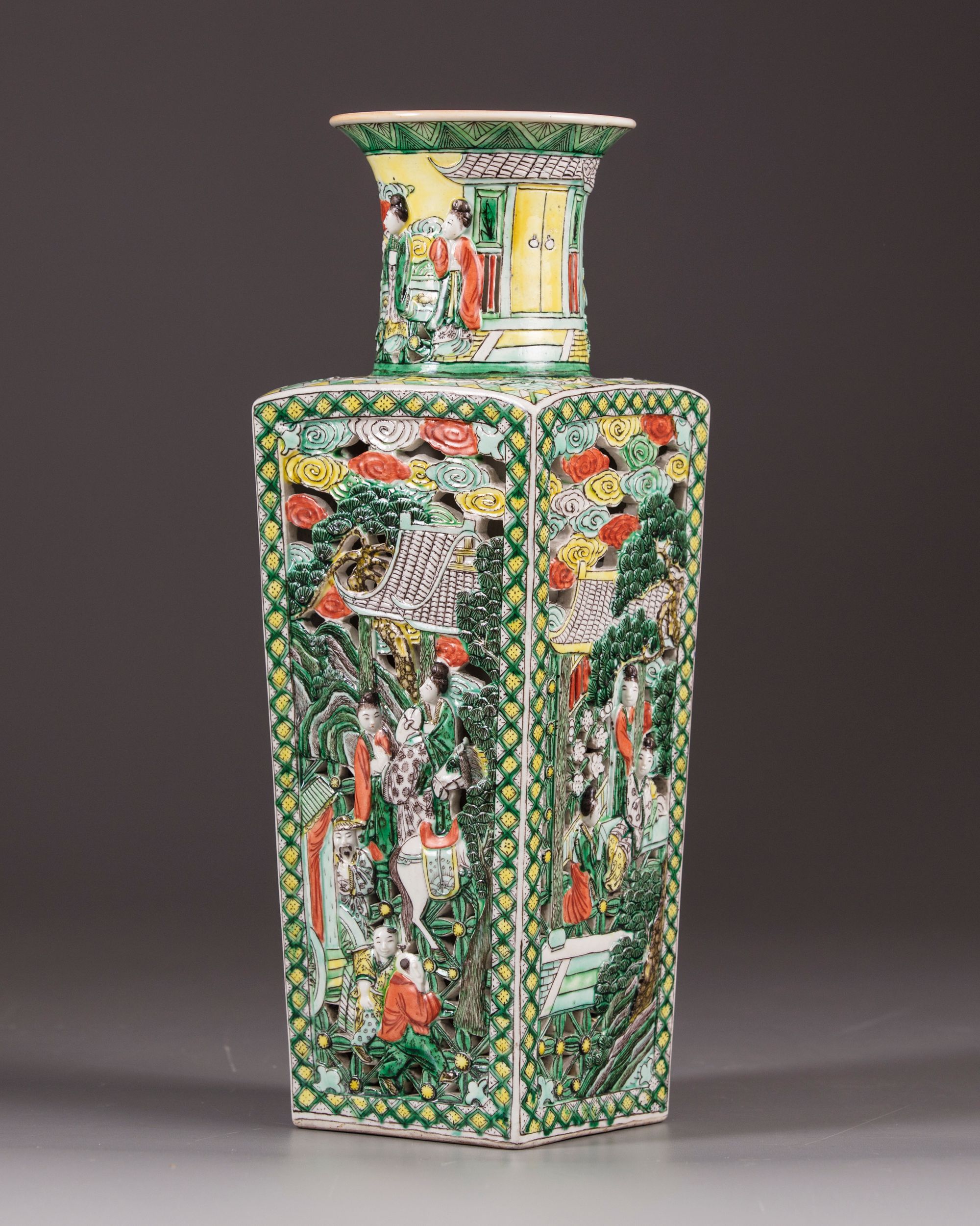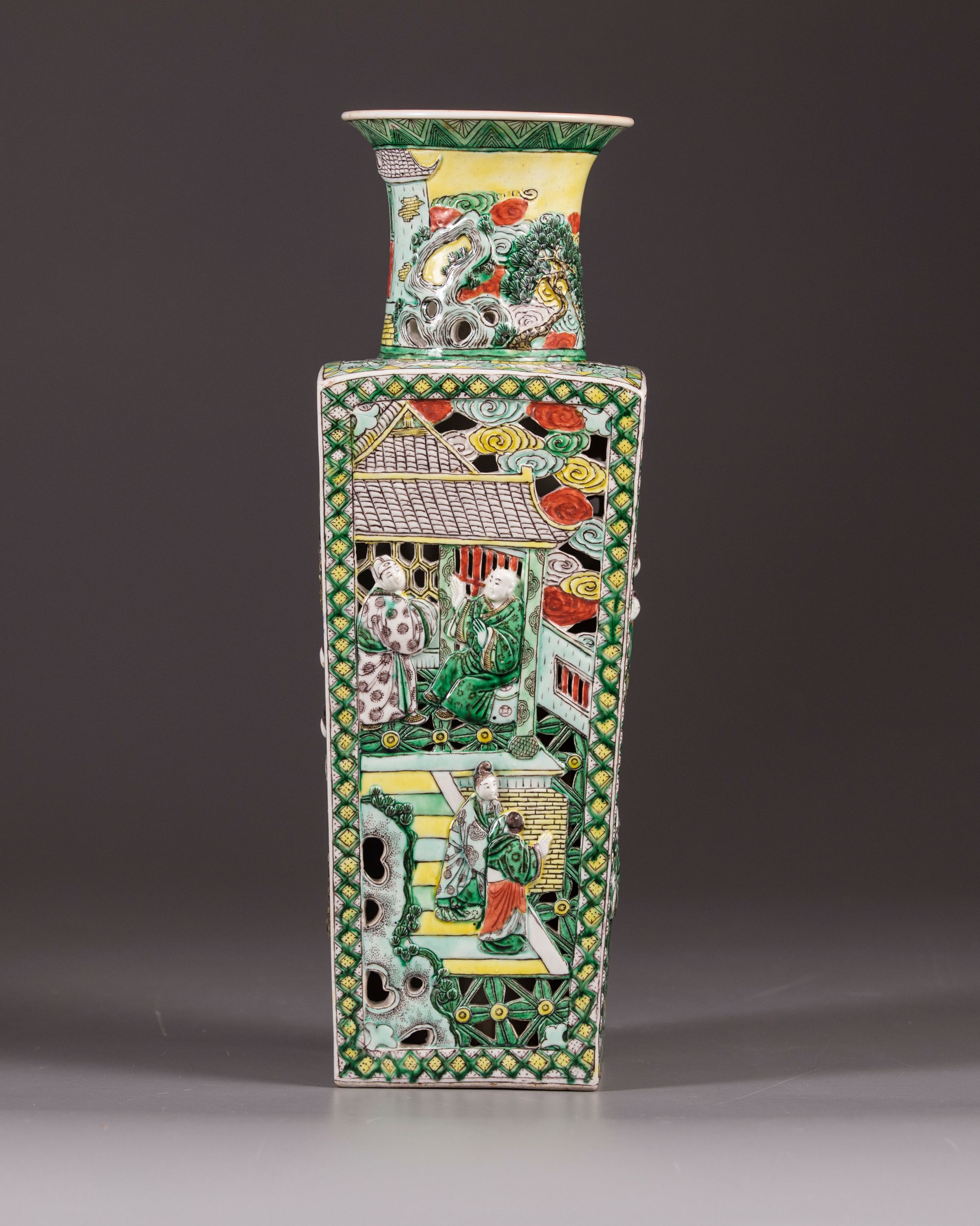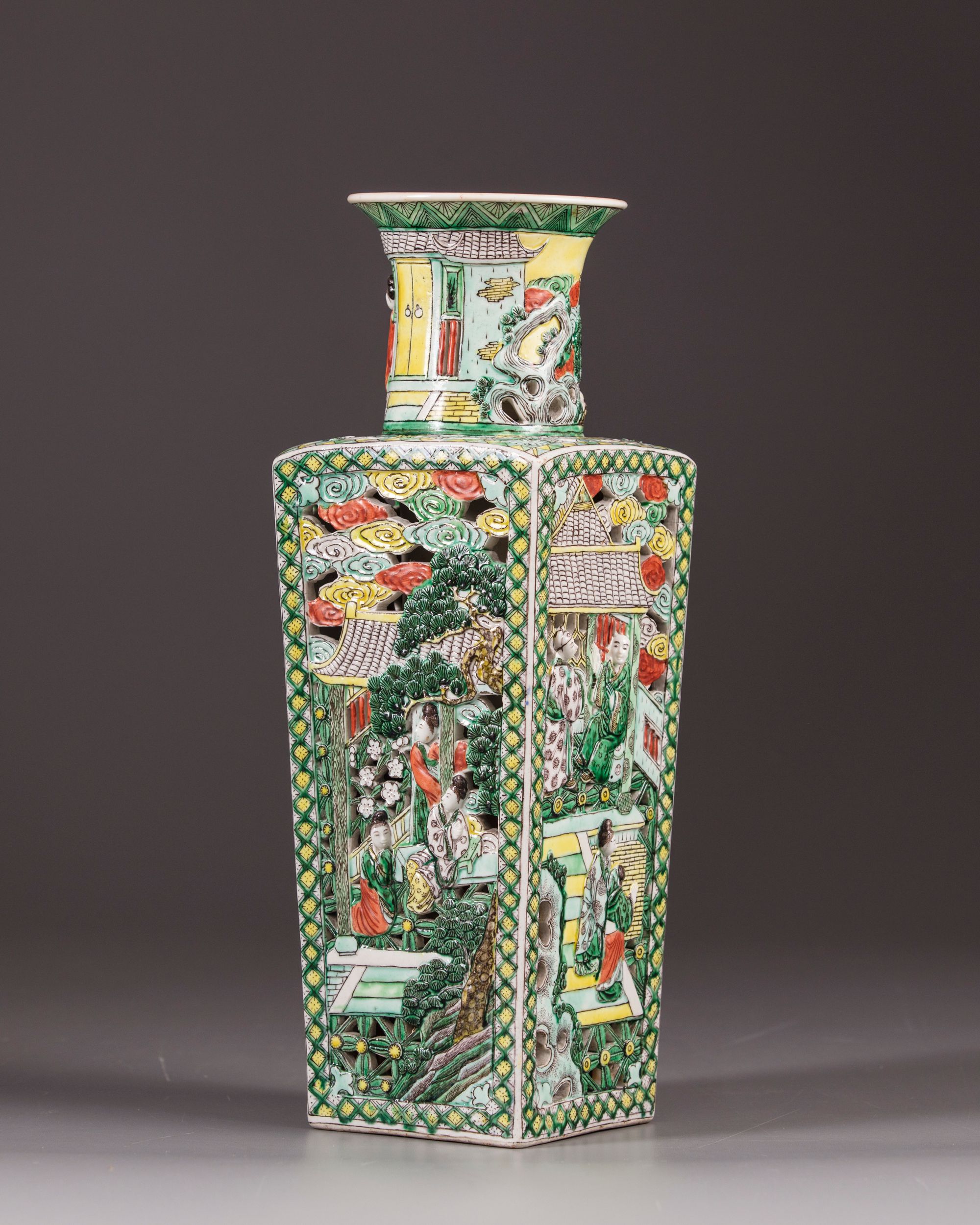 Of square section with a short flaring neck, each side moulded with openwork panels depicting various figures in gardens.