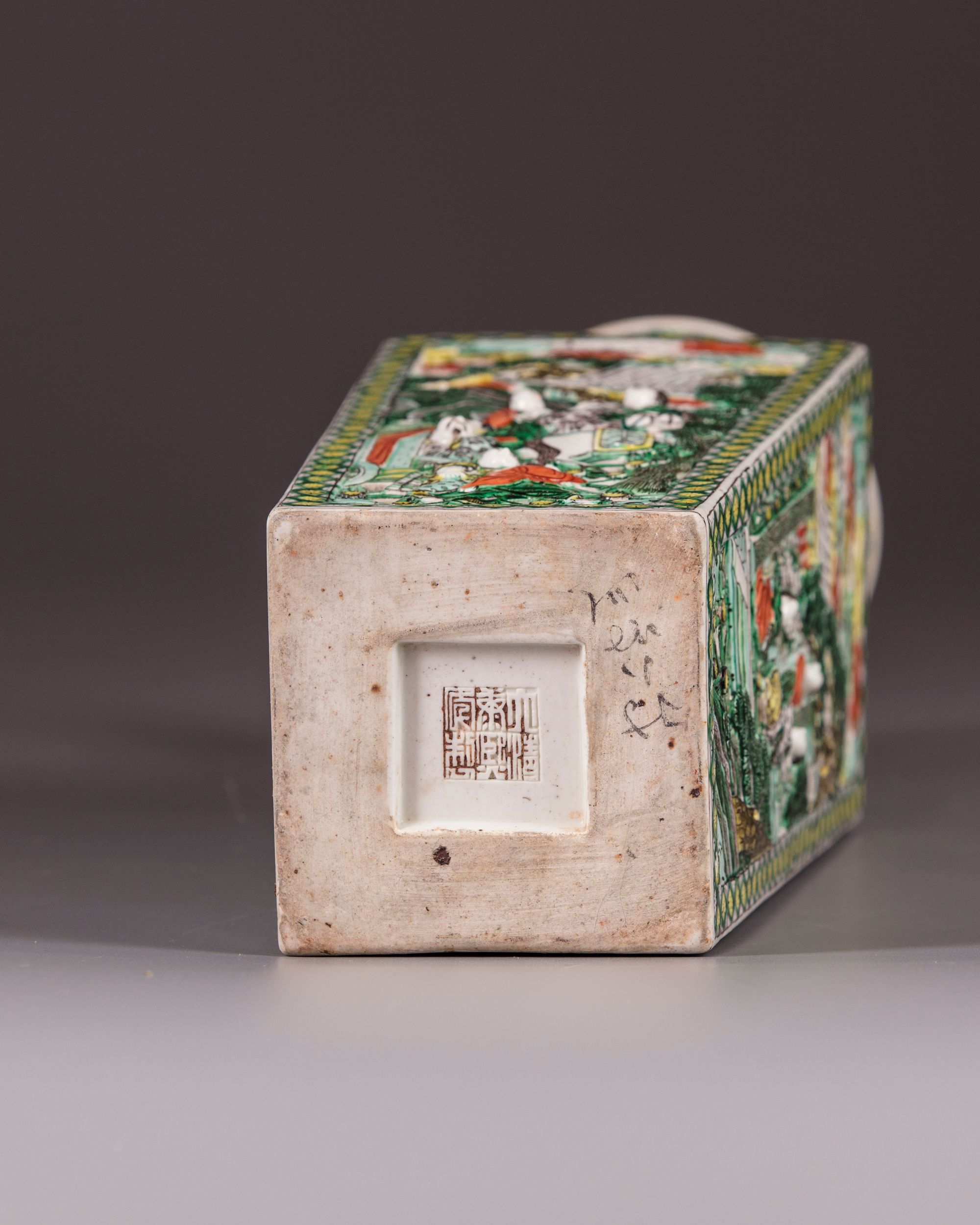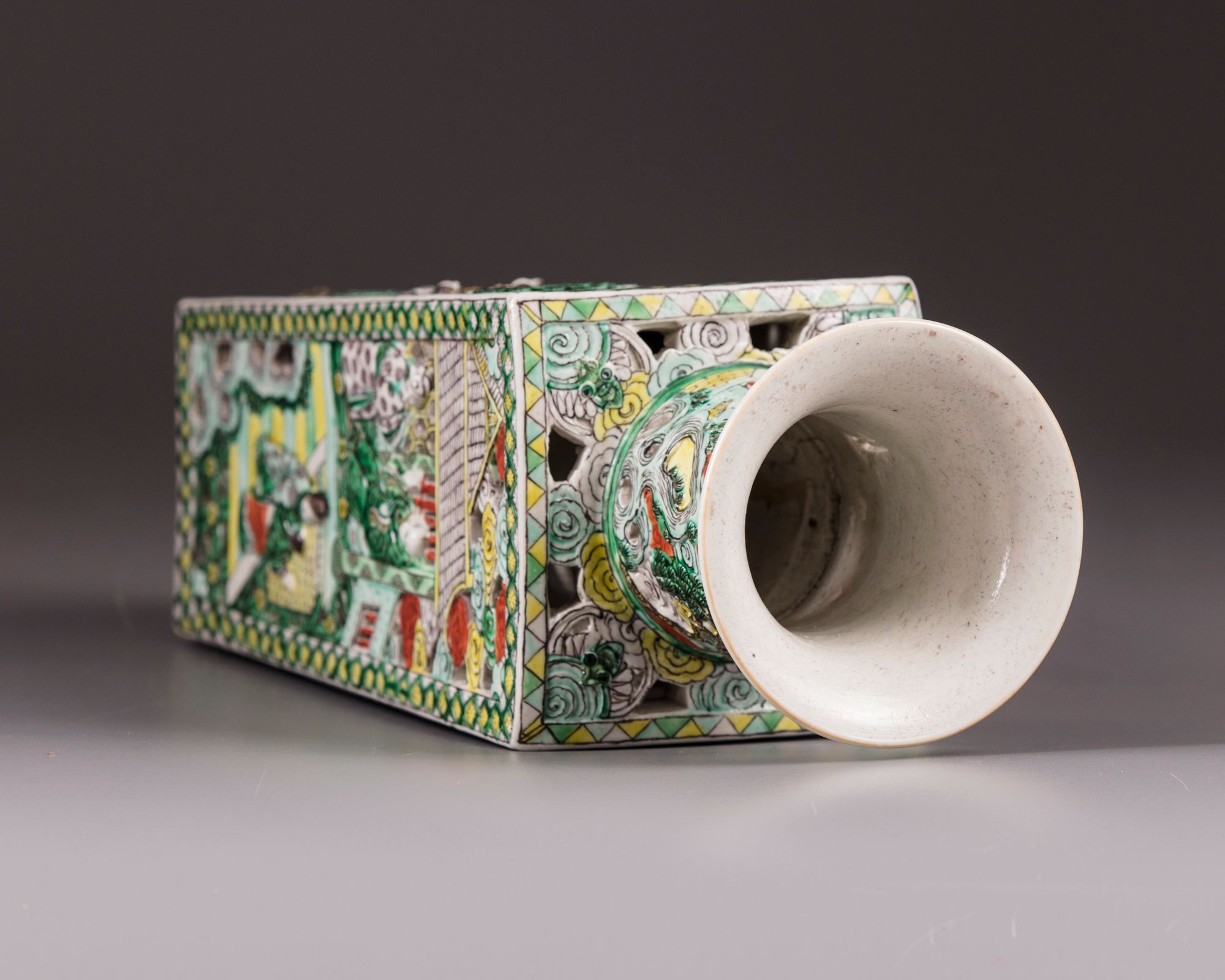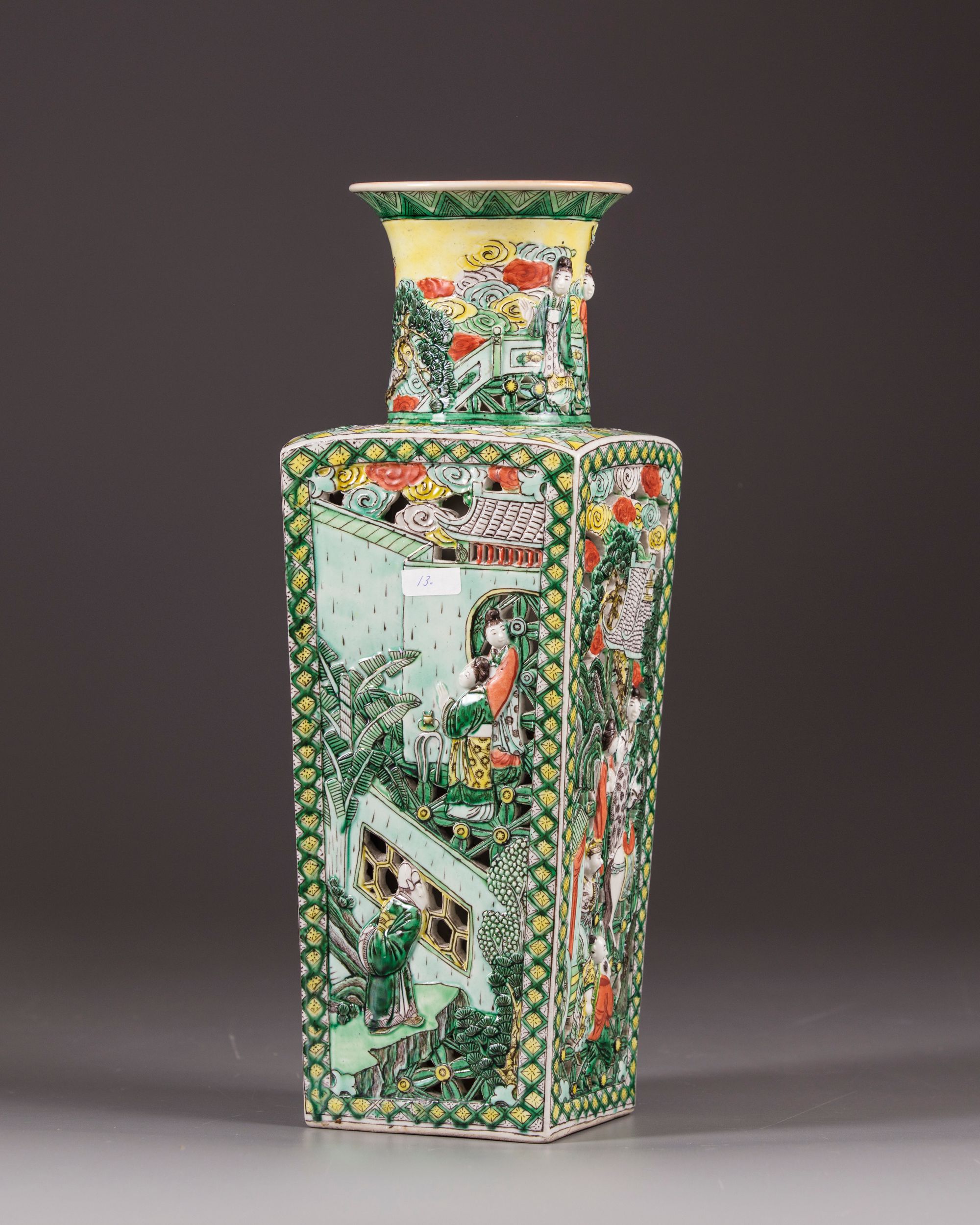 Of square section with a short flaring neck, each side moulded with openwork panels depicting various figures in gardens.