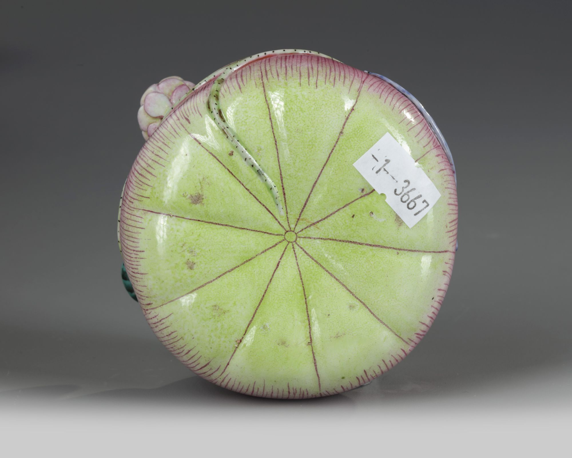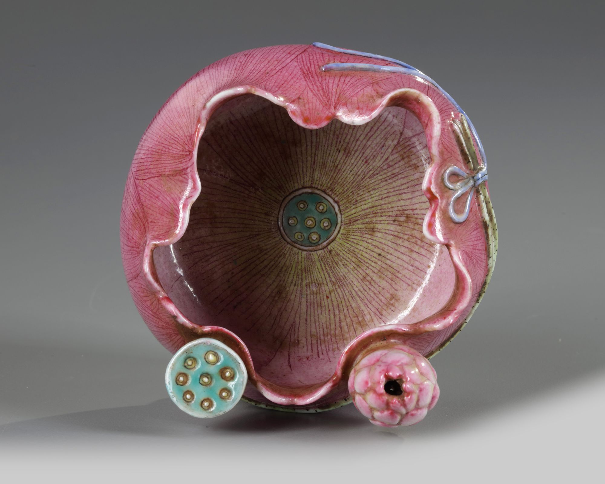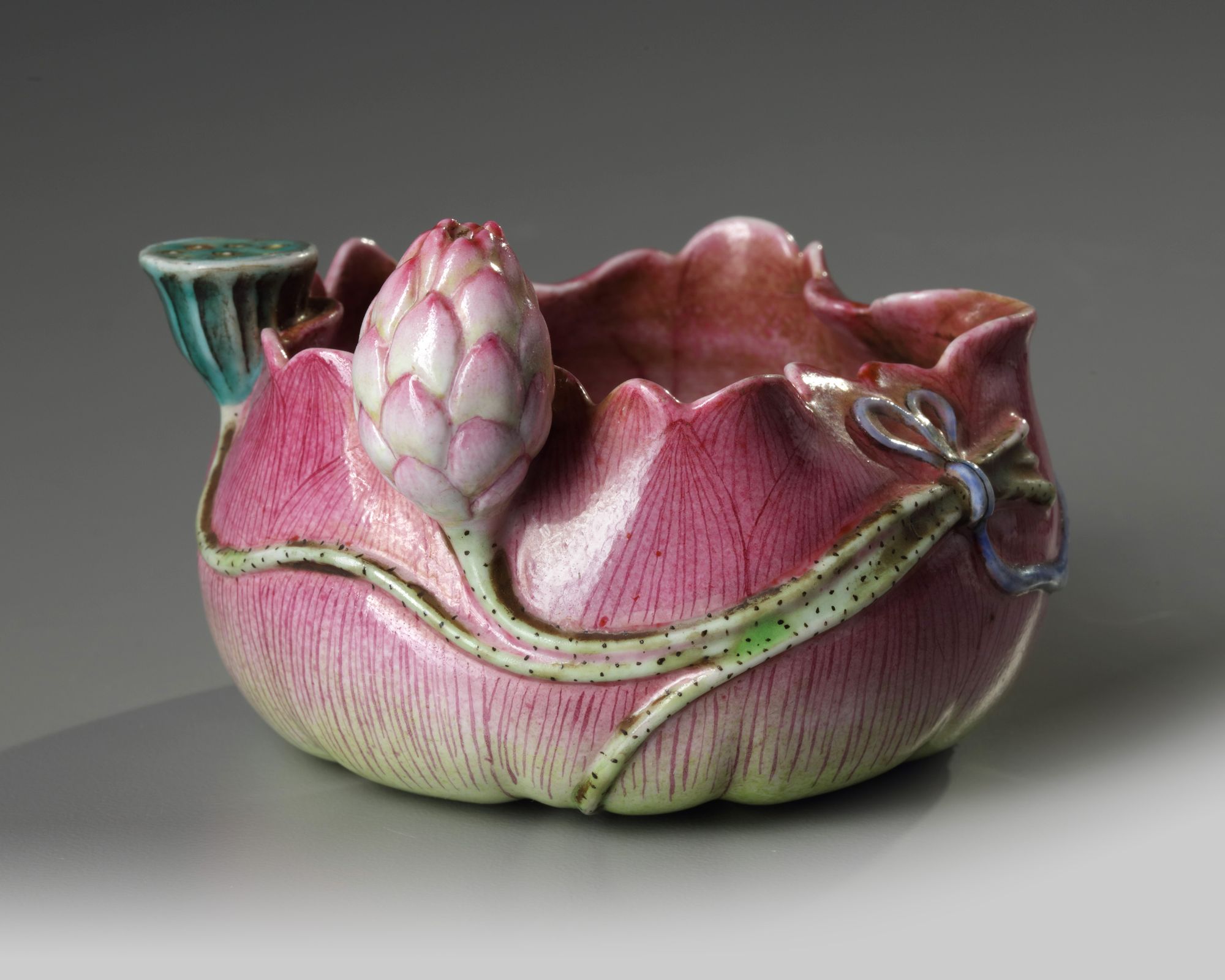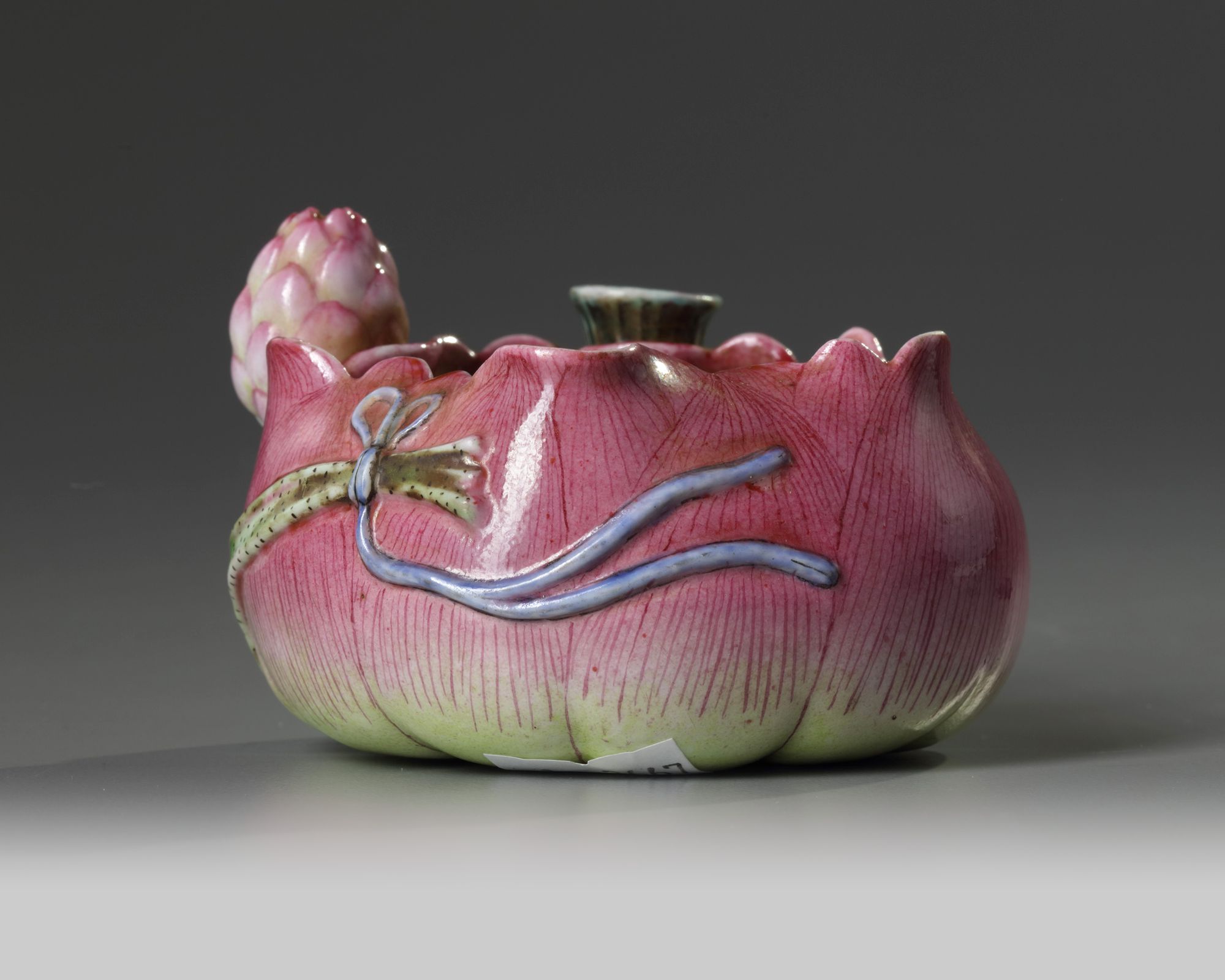 A famille rose lotus-shaped waterpot is decorated in high relief with a peony flower .