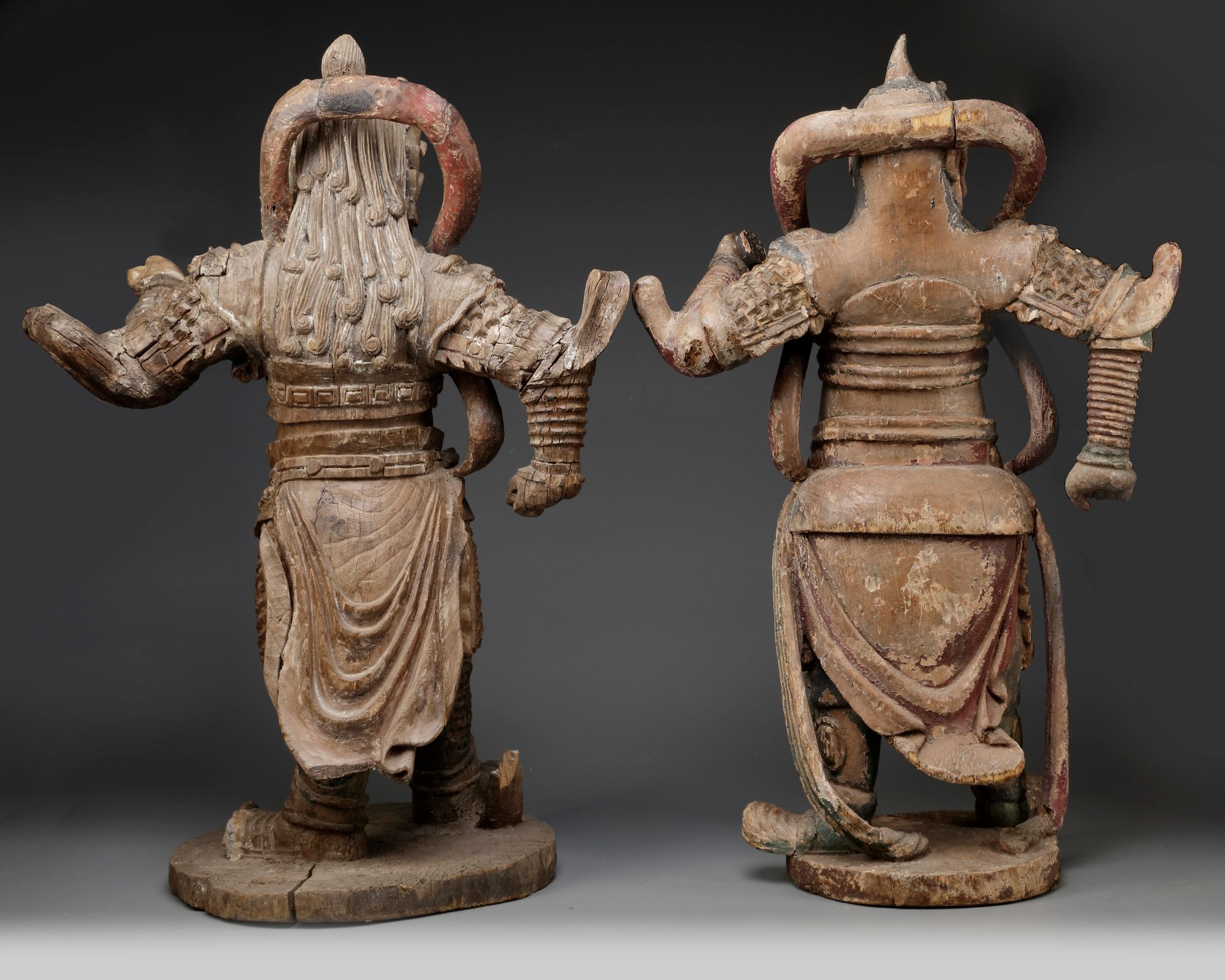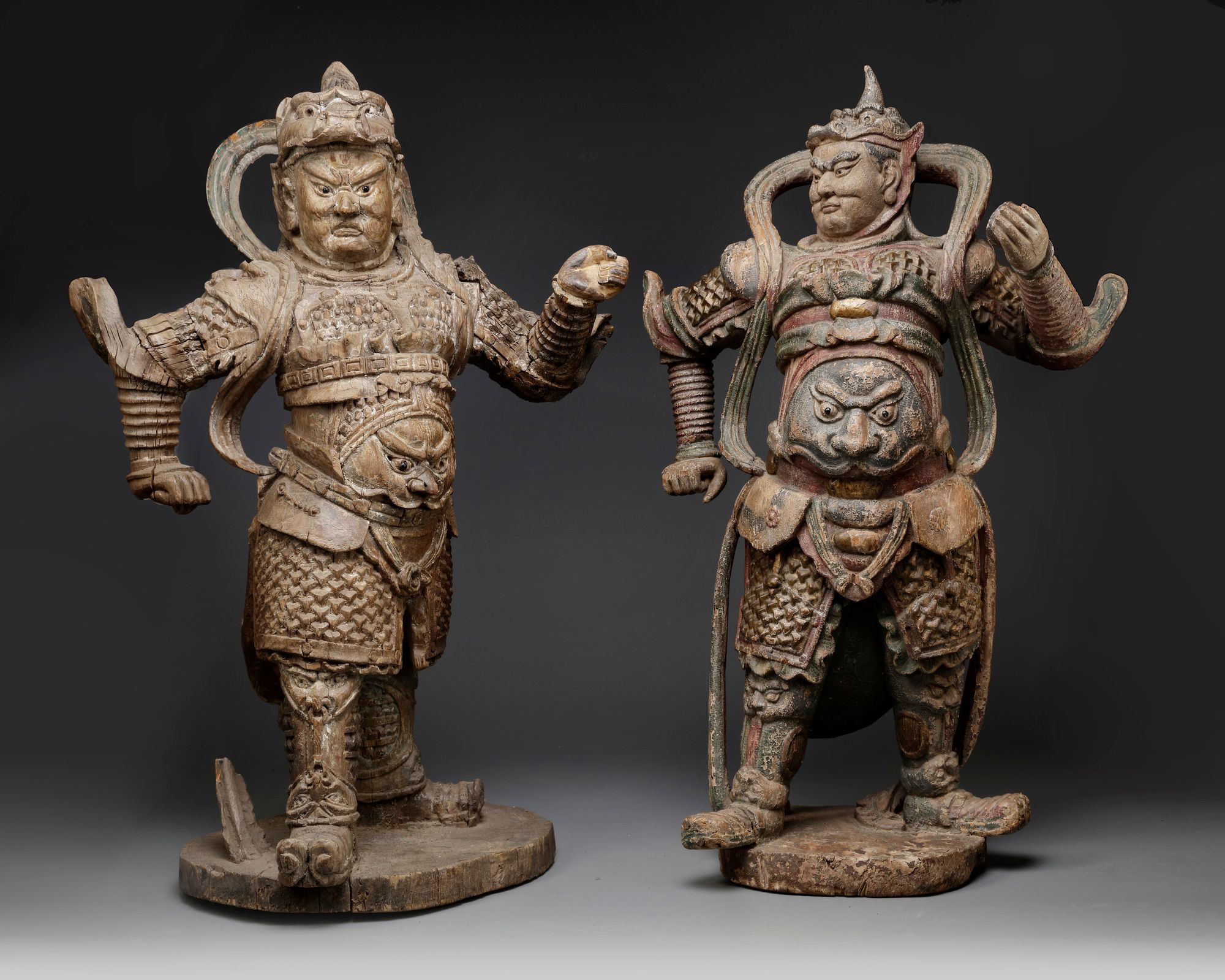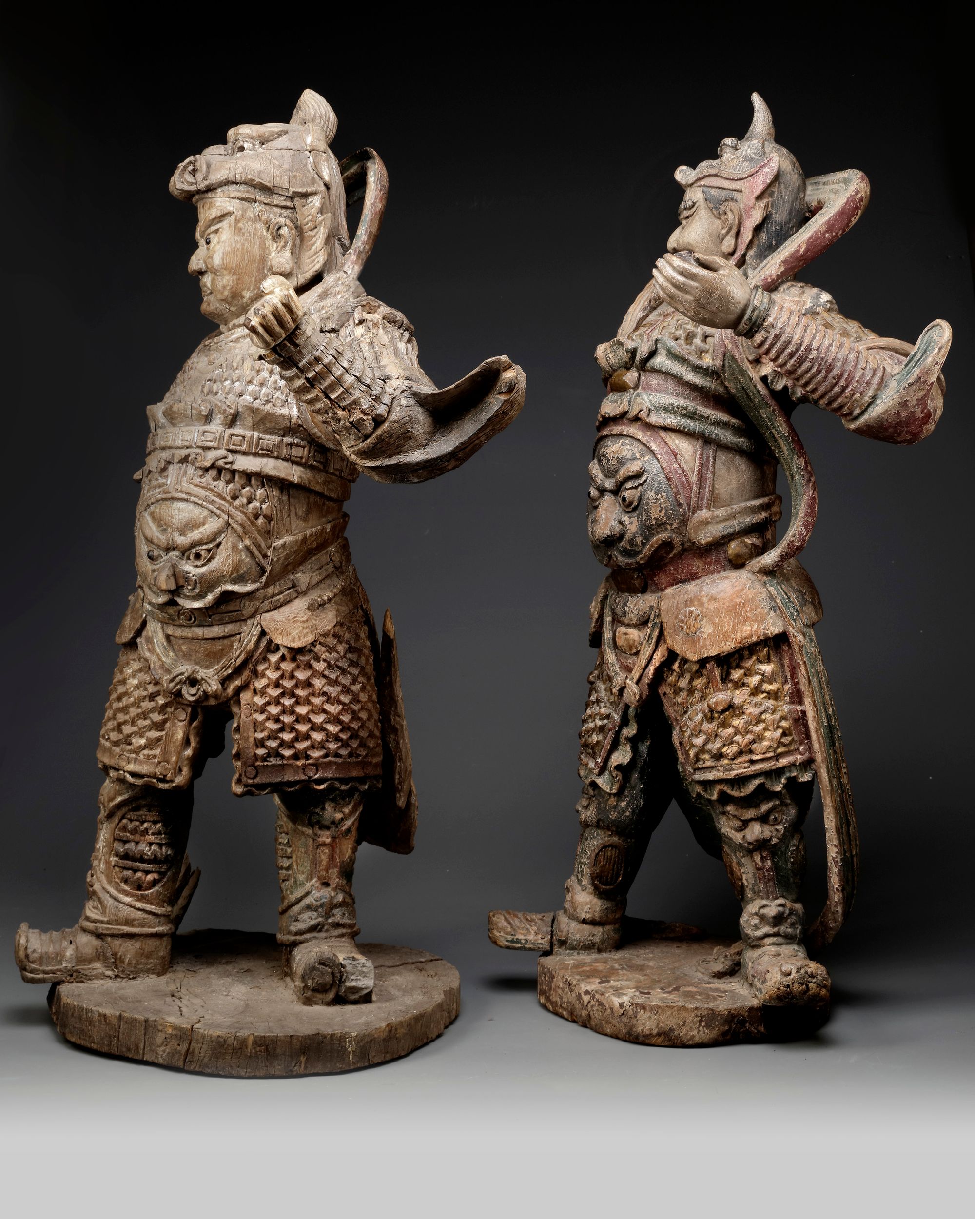 The figures are each impressively carved with a fierce expression, wearing a qilin helmet, openwork celestial scarves and armour decorated with a beast mask. The stand with one hand up and the other won, and their feet slightly spread and chest proud. They each are carved on a circular stand.