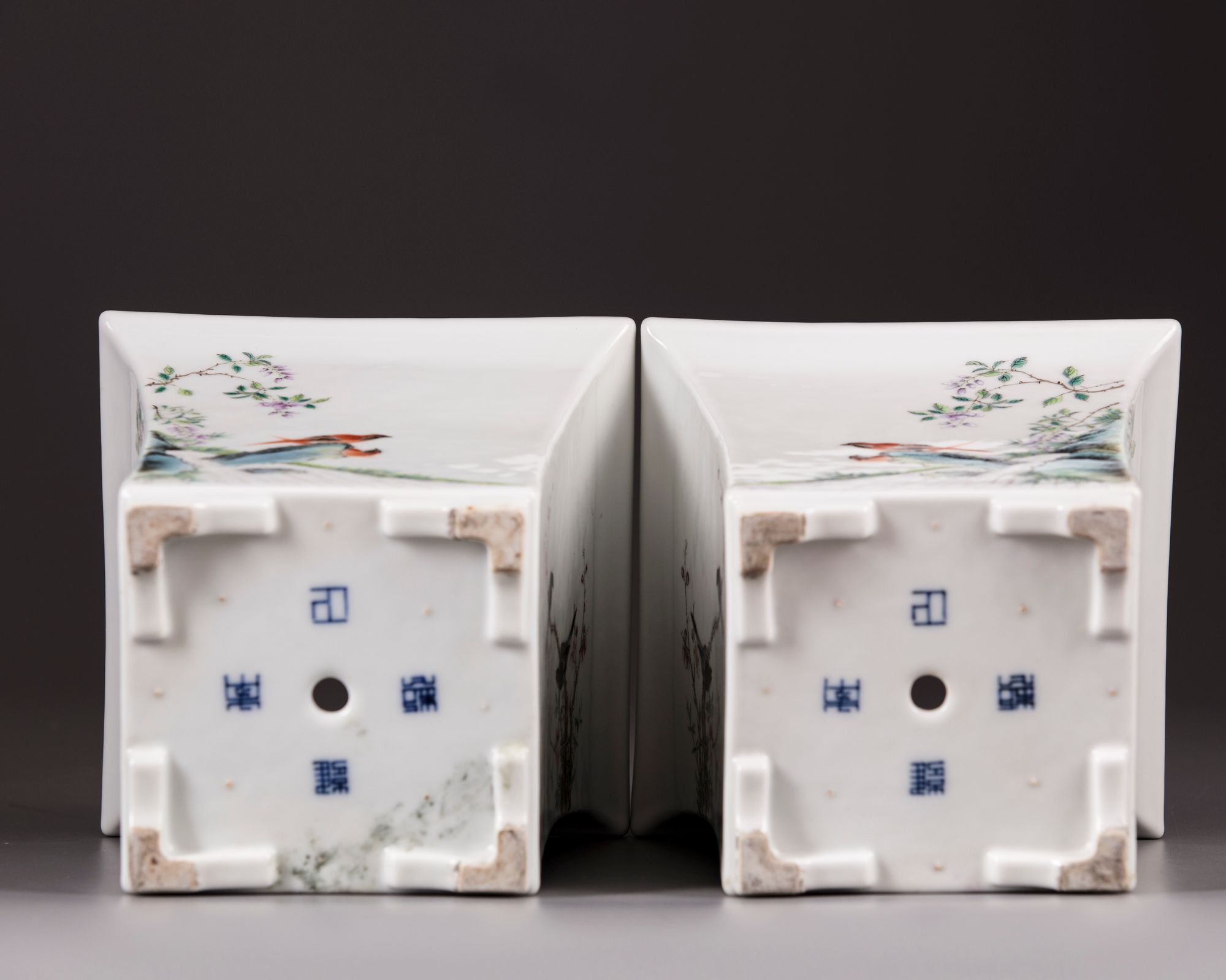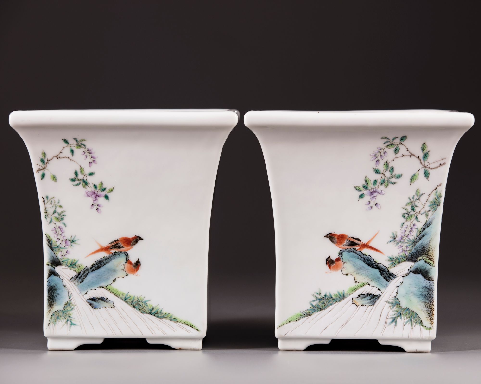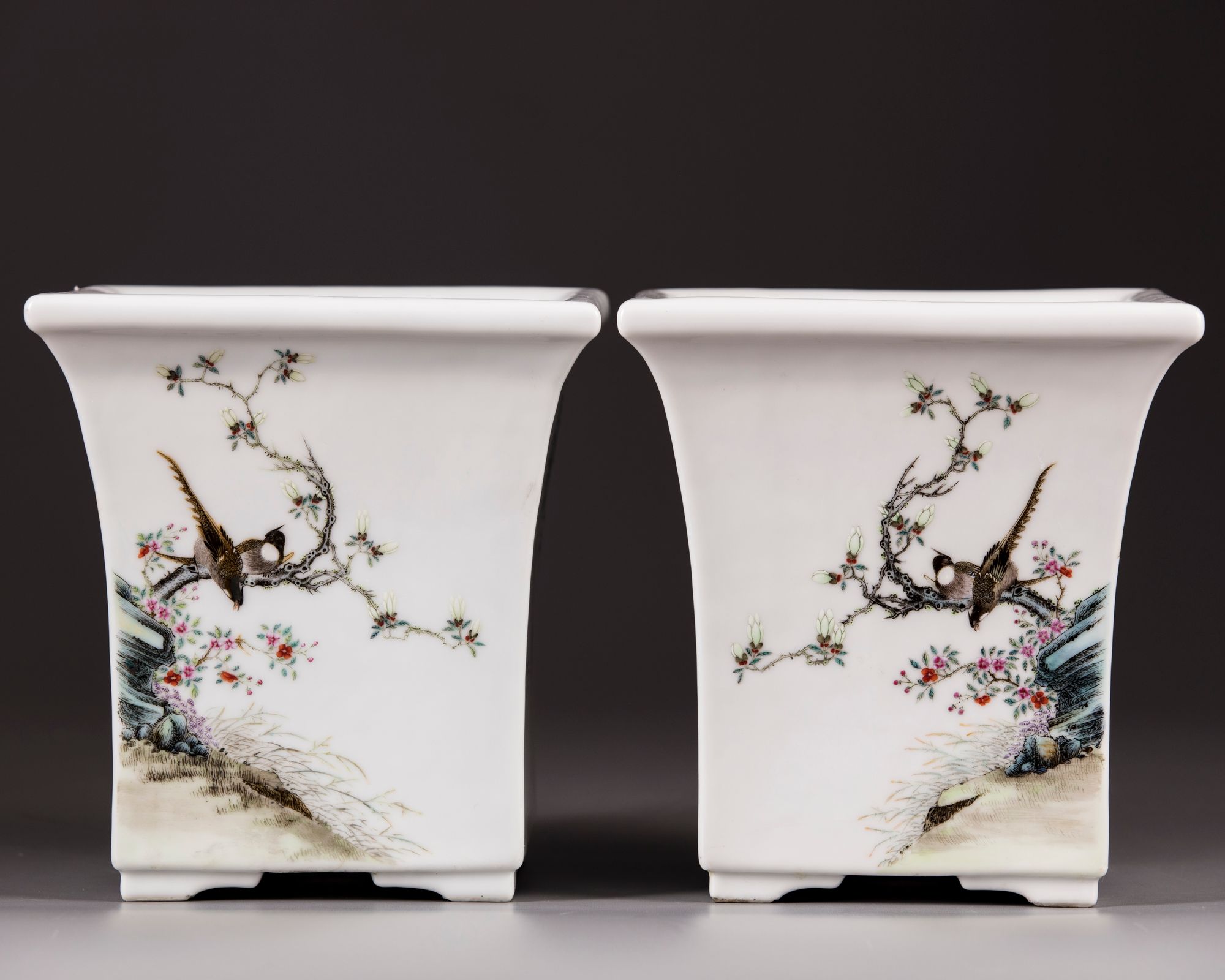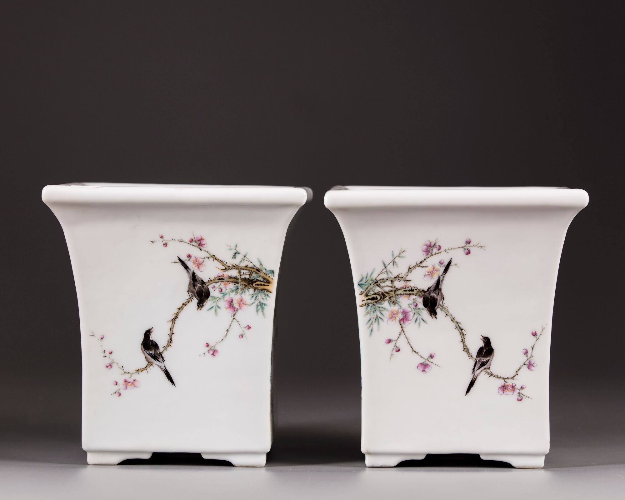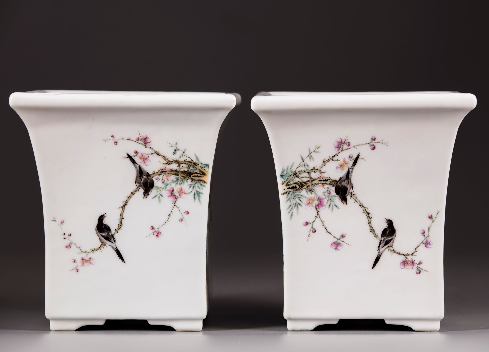 Each side is decorated with birds perched on a flowering branch, the base with an apocryphal Yongzheng mark.
