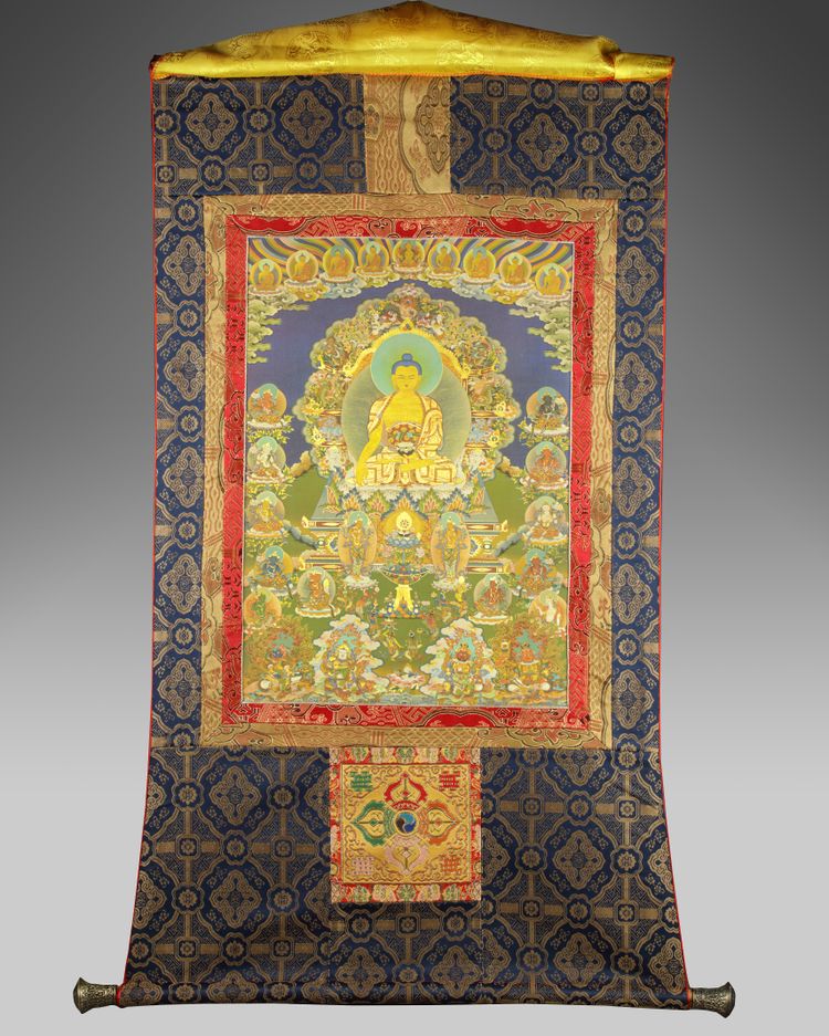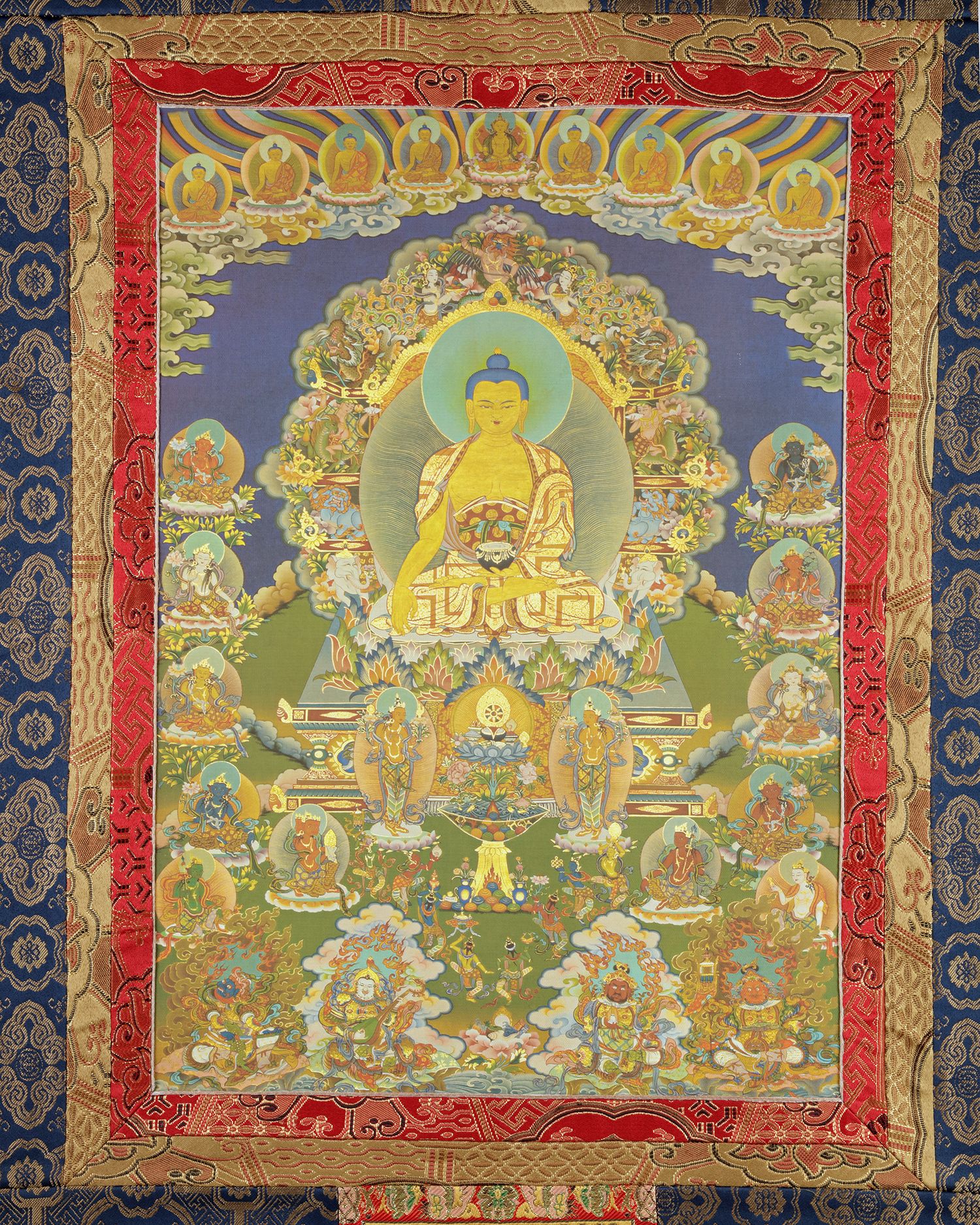 The thangka features Shakyamuni seated in dhyanasana before a flaming mandorla on a lotus base, with one hand holding an alms bowl and the other hand in bhumiparsamudra. He is surrounded by various further buddhas, bodhisattvas, including Taras and the Four Heavenly Kings.