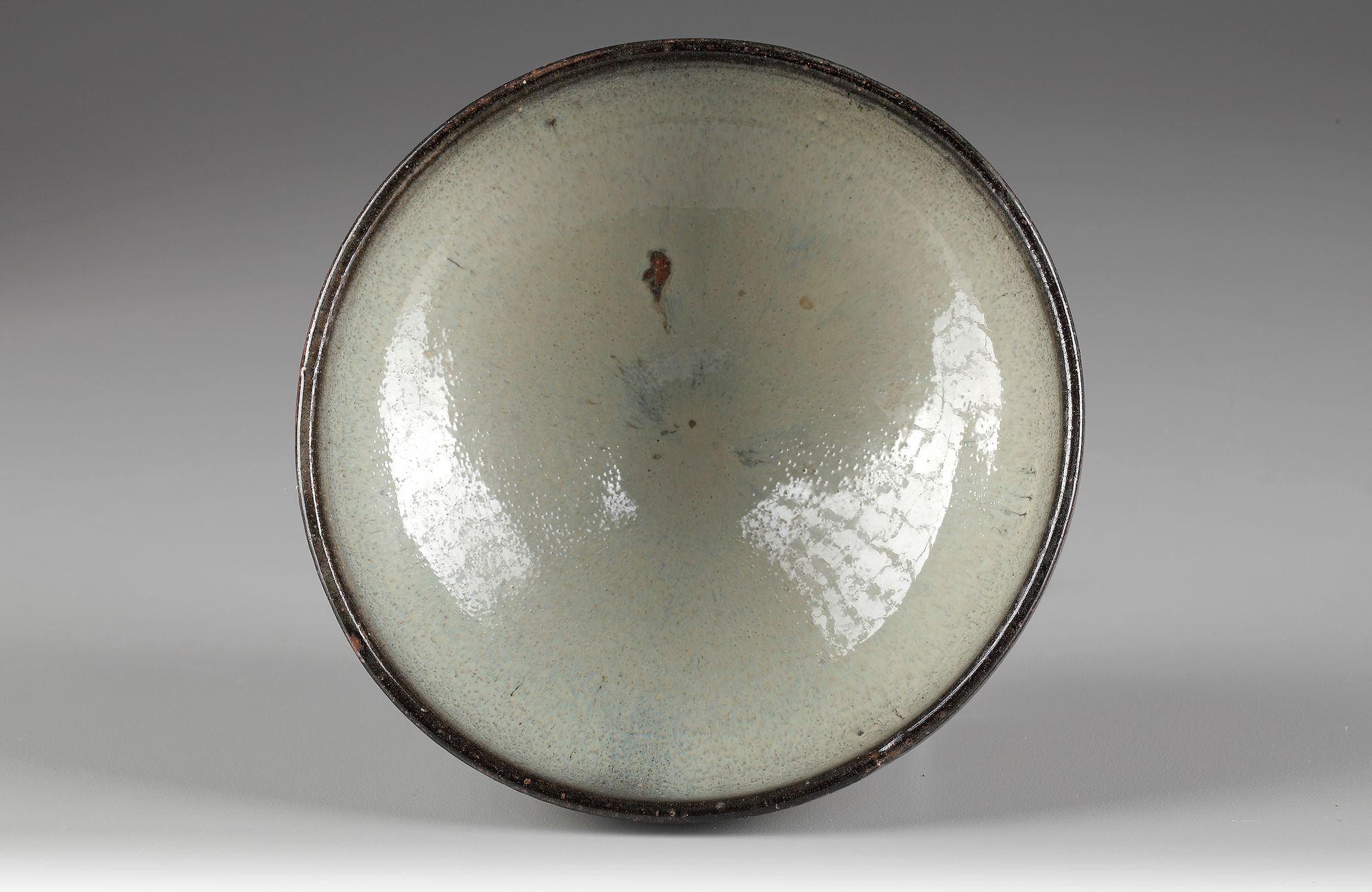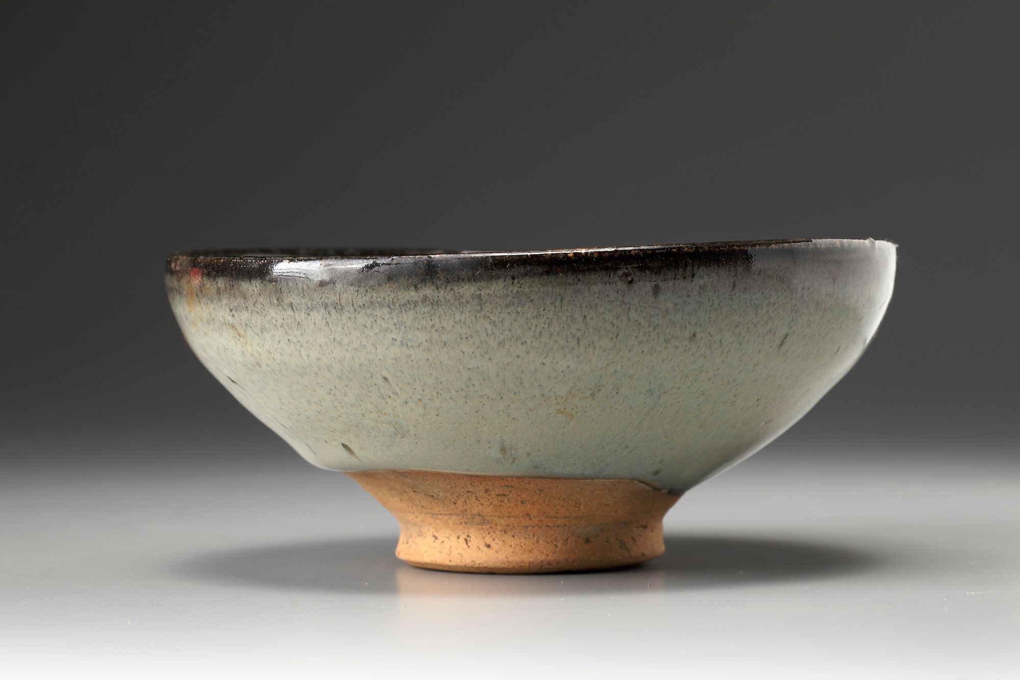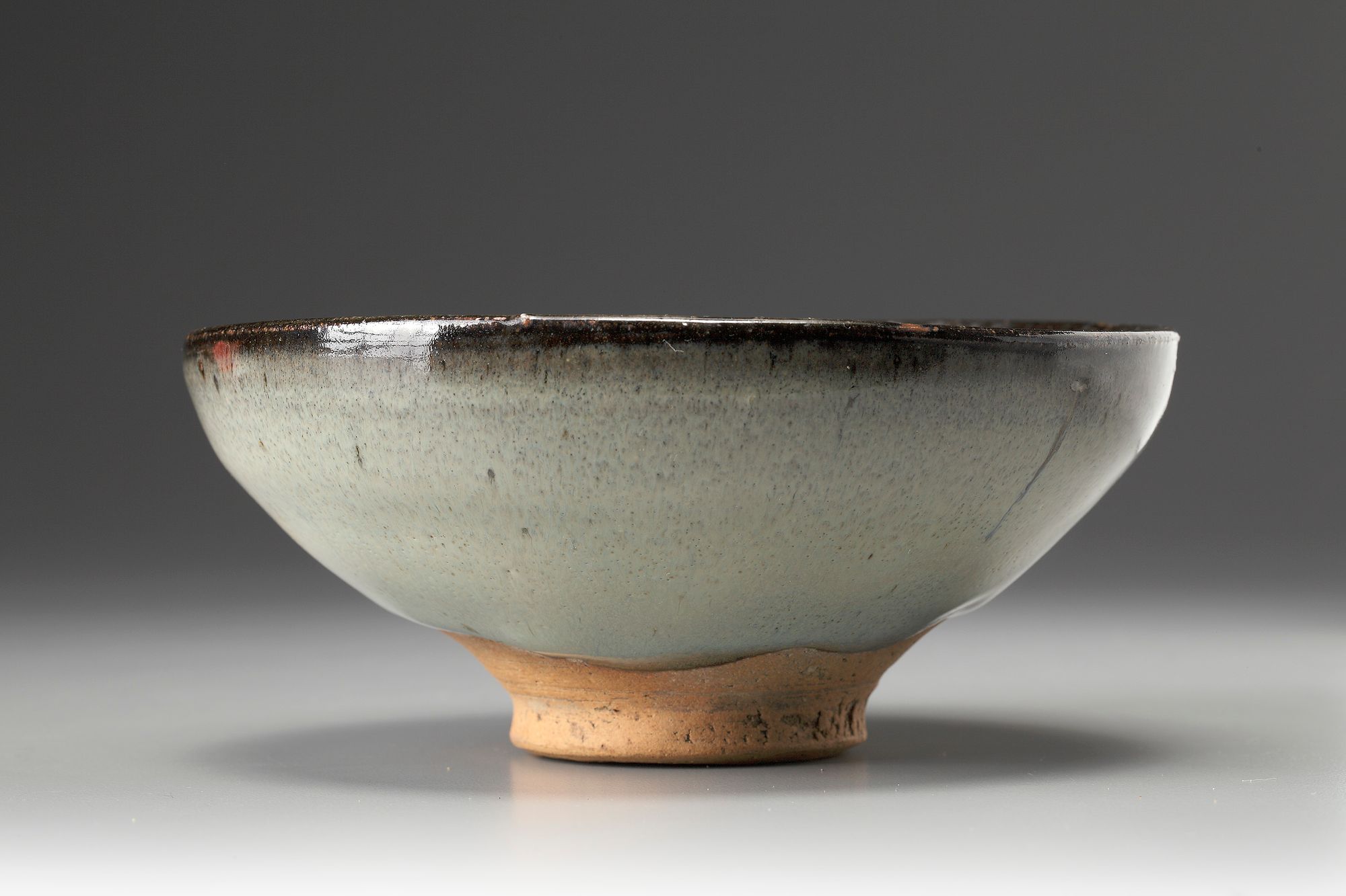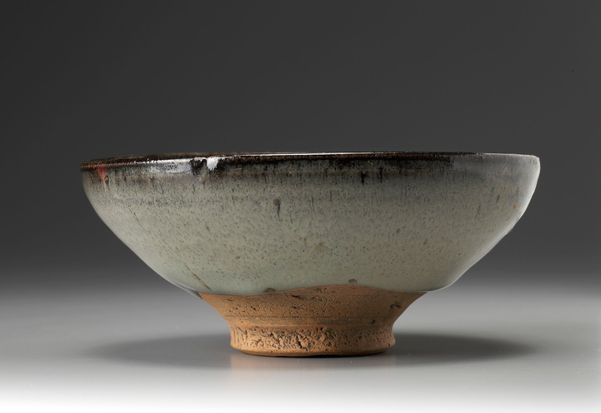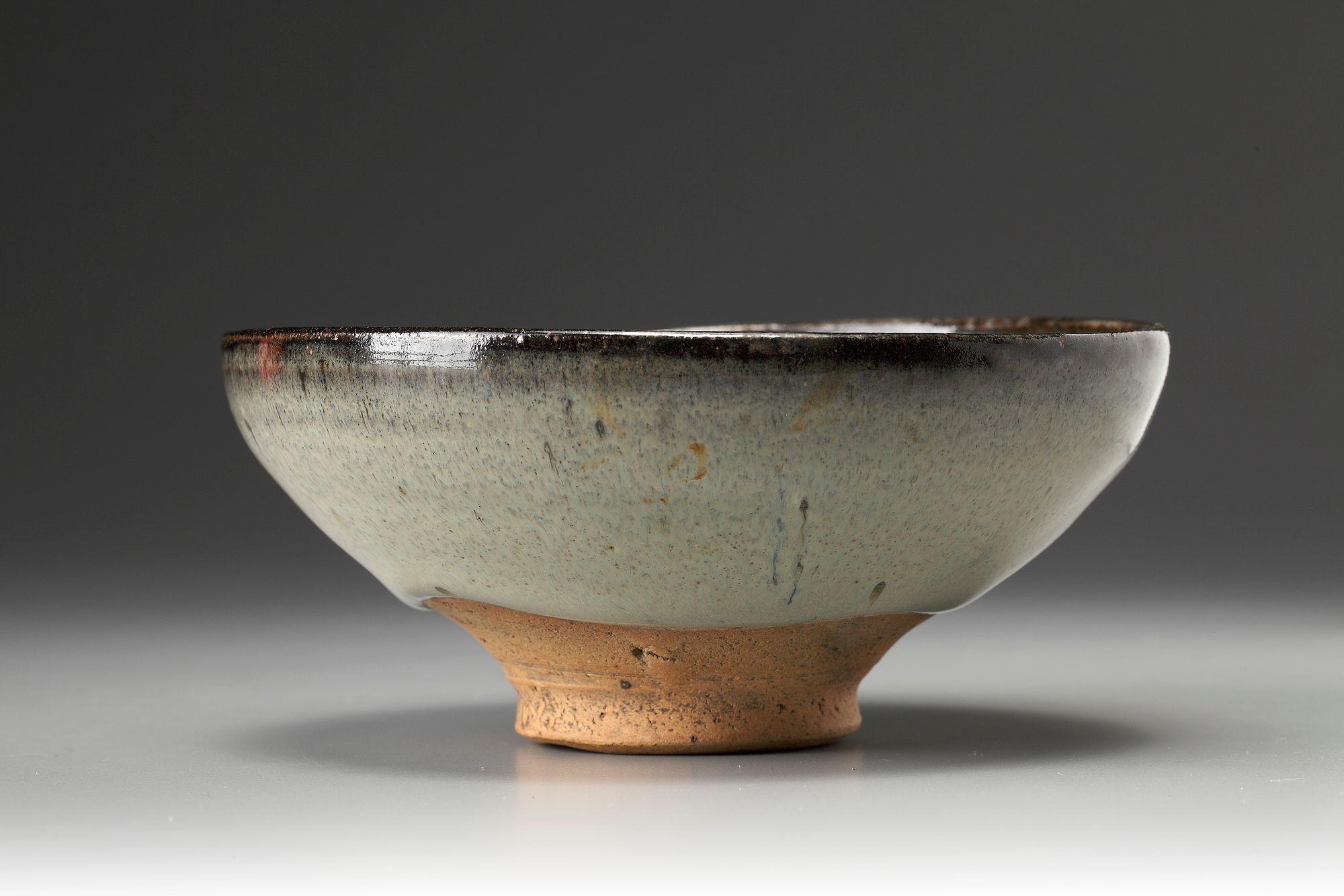 well potted with rounded sides and slightly inverted rim, supported on a short, splayed foot, covered with a moon-white glaze stopping short of the foot to reveal the orange-buff body, the rim with a black glaze.