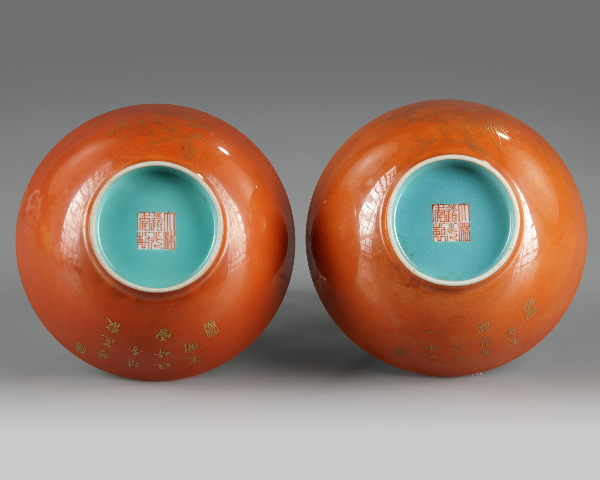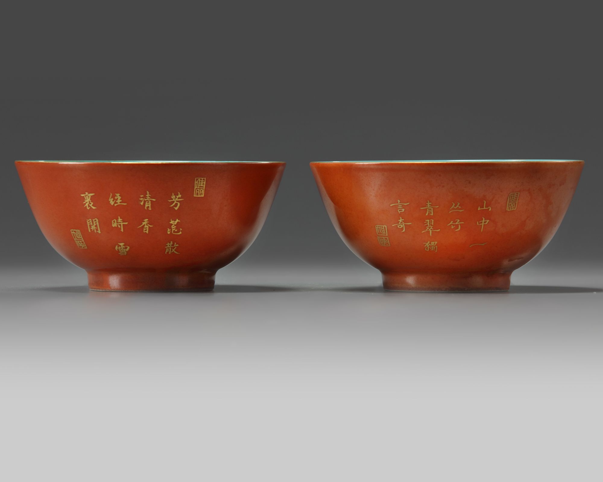 One bowl is decorated in gilt with prunus and the other with bamboo, each accompanied with a poem referring to the particular plant and two seal marks all on an iron-red ground. The interior and base are glazed turquoise with apocryphal Daoguang marks.