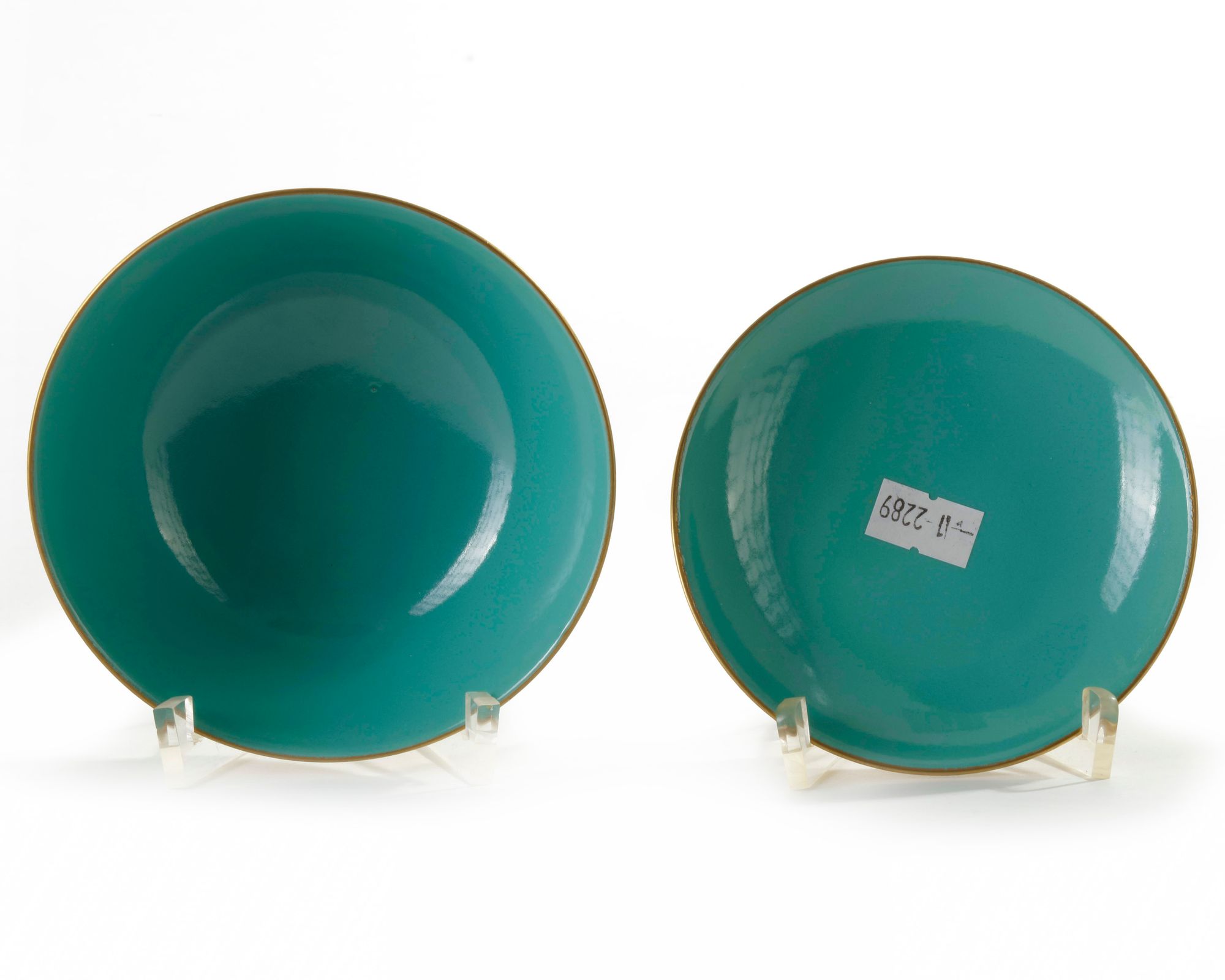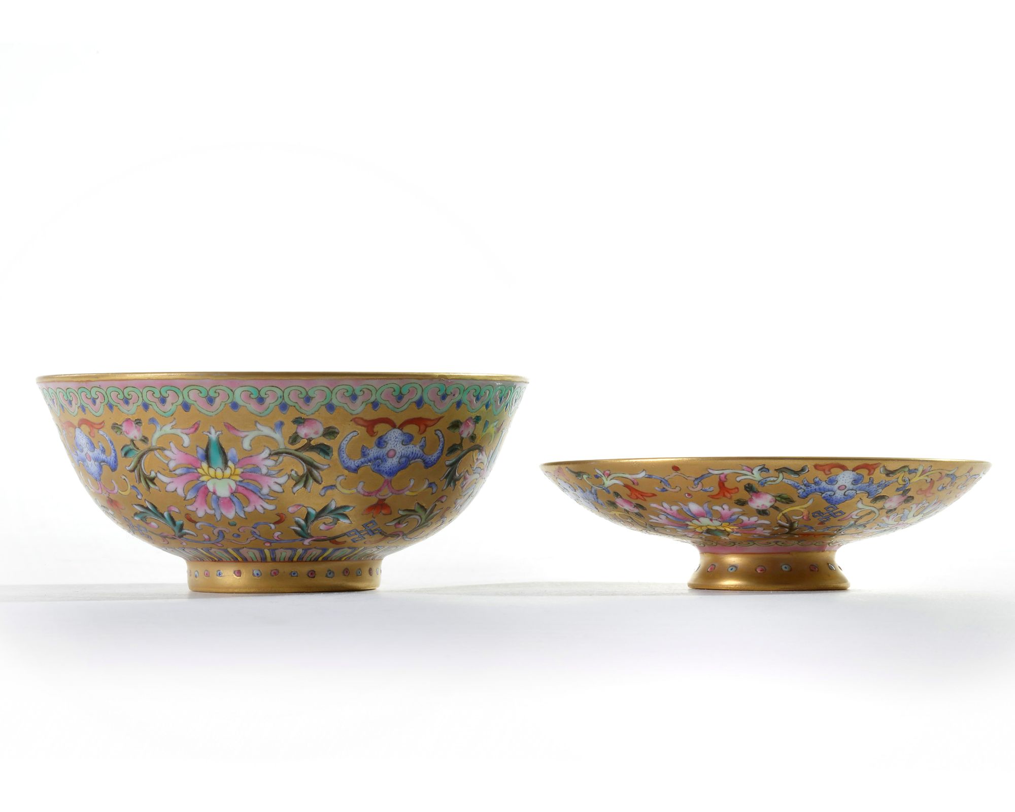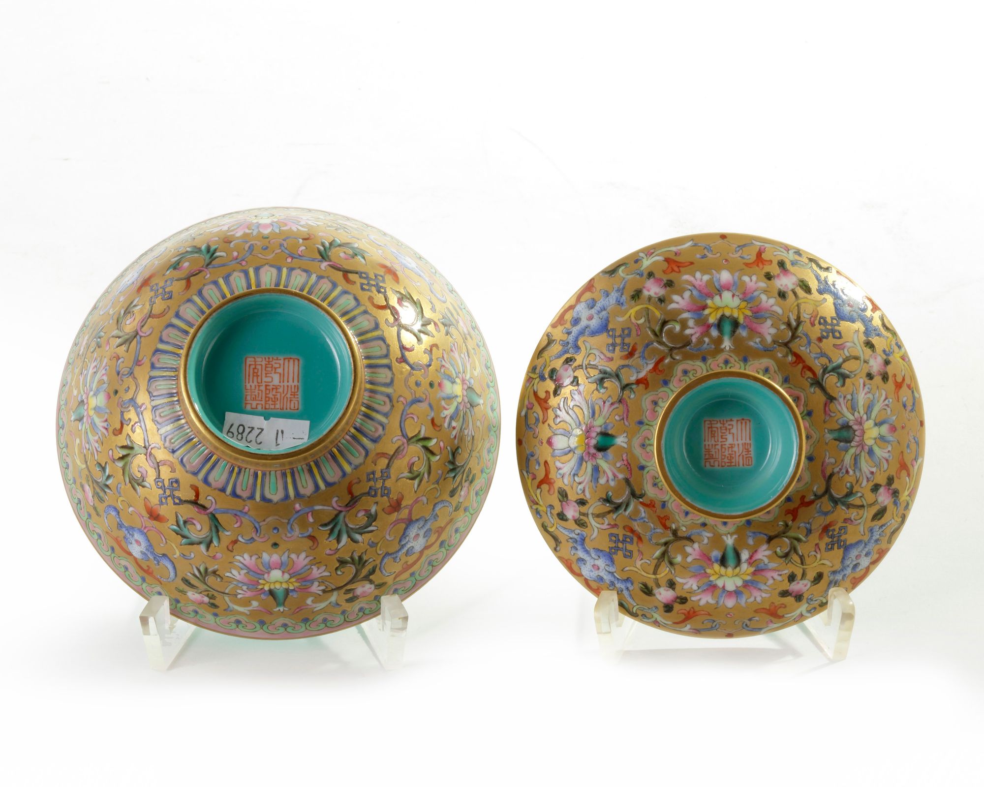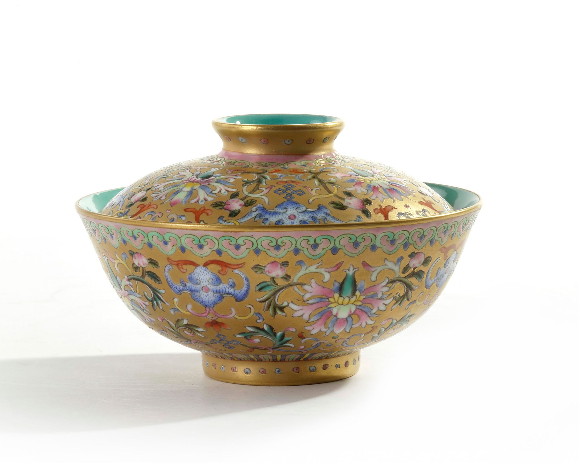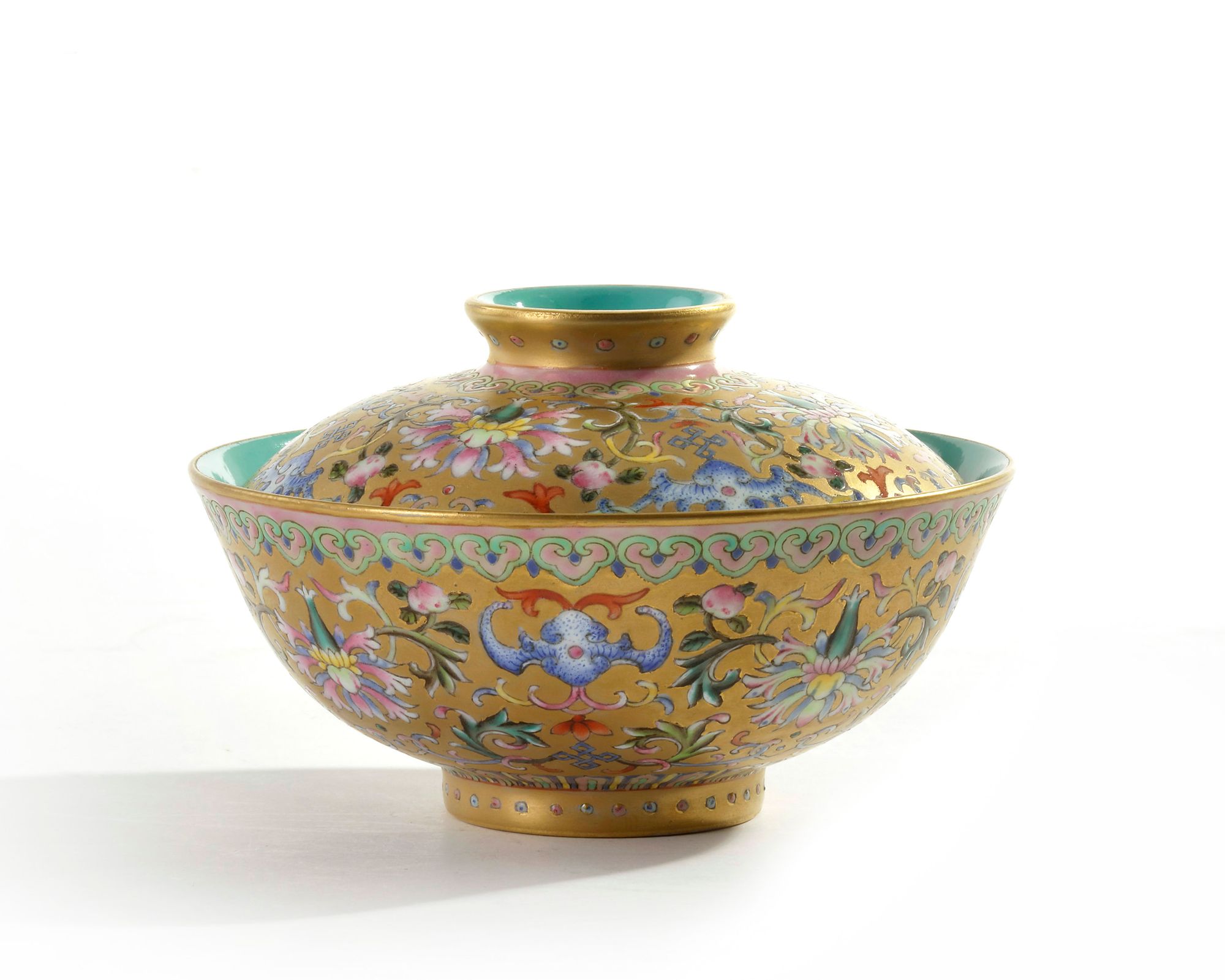 The bowl and cover are each decorated with a bat holding an endless knot, amongst scrolling lotus all below a ruyi head band. The bases and interiors are glazed turquoise with an apocryphal Qianlong mark.