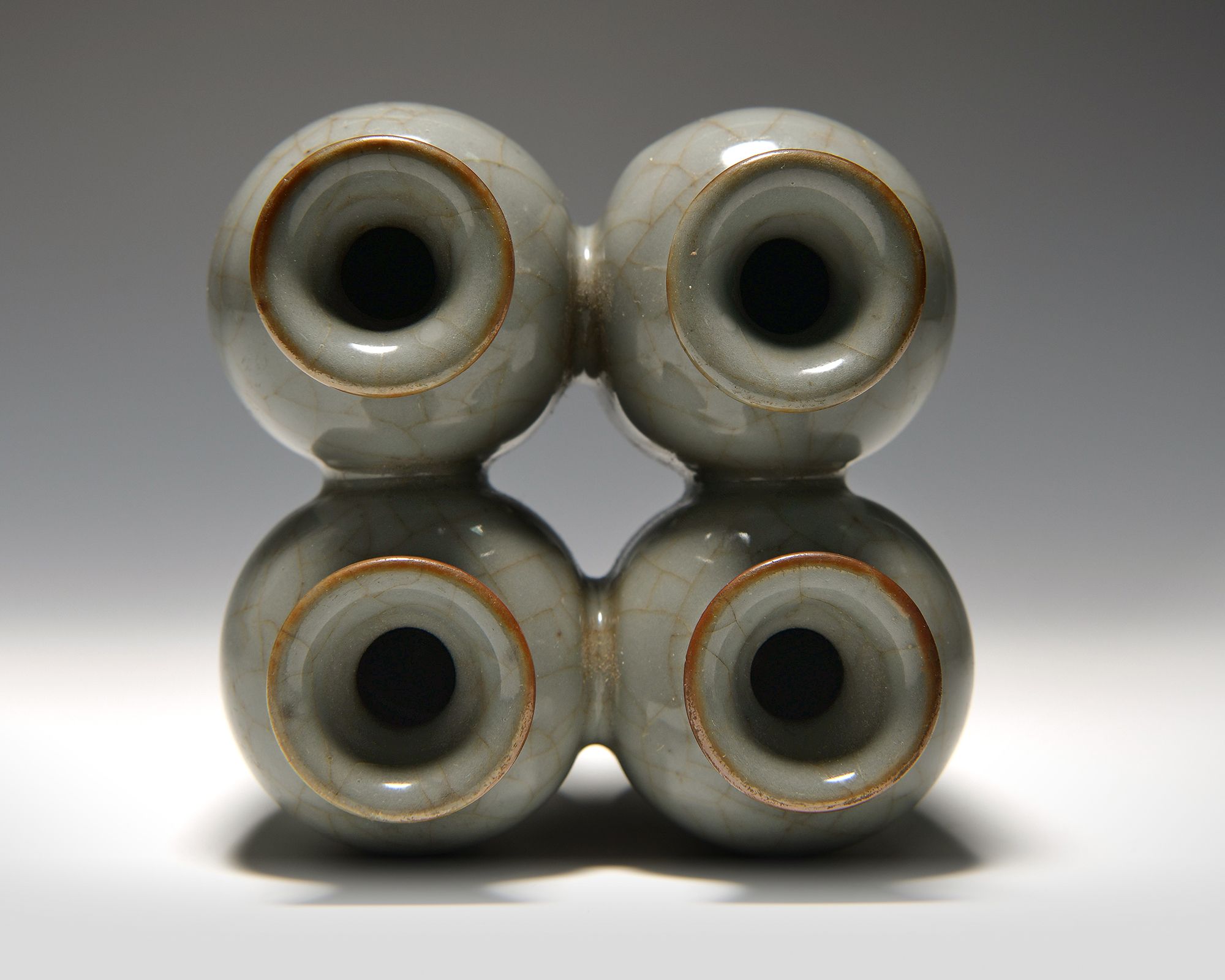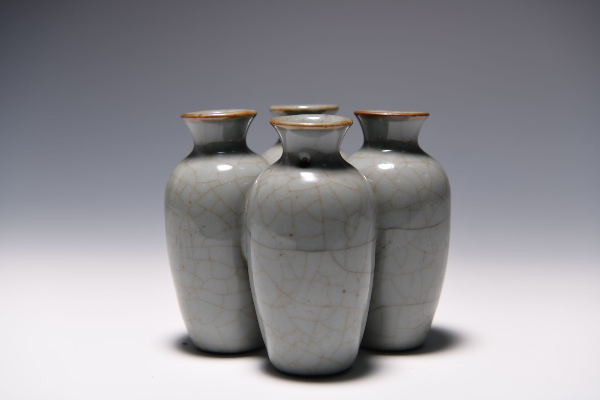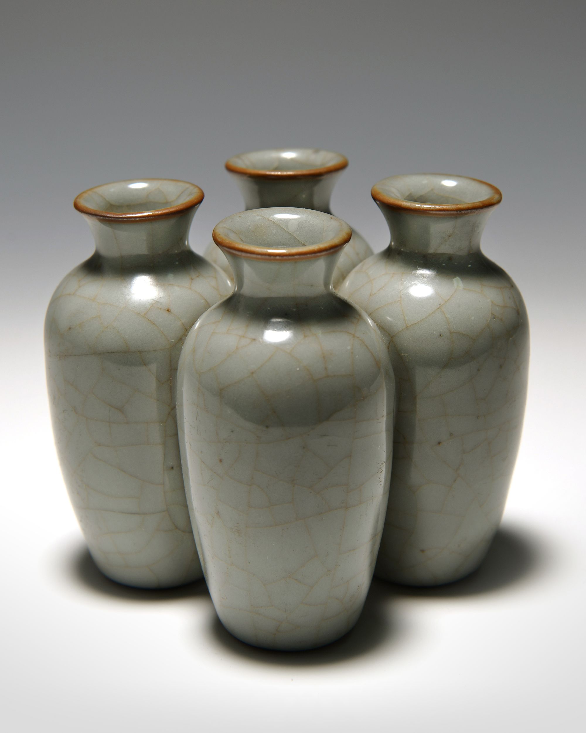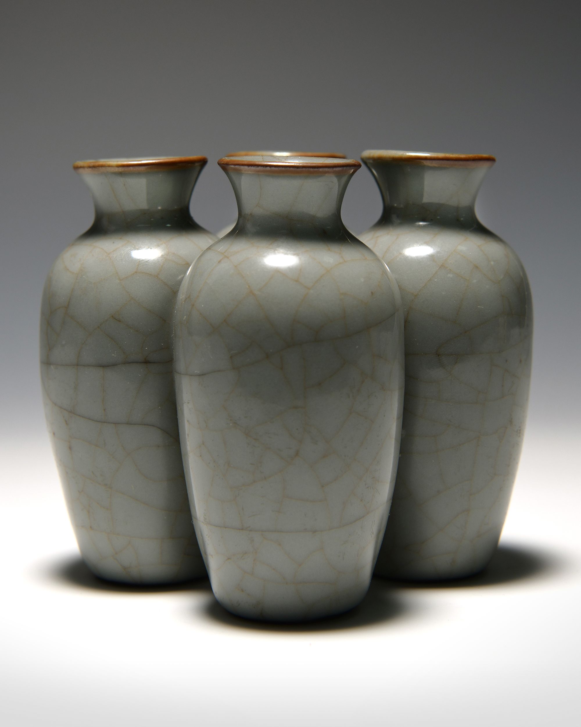 Four Chinese conjoined vases covered overall with a pale, very slightly greenish-grey glaze suffused with an irregular pattern of dark grey crackle.