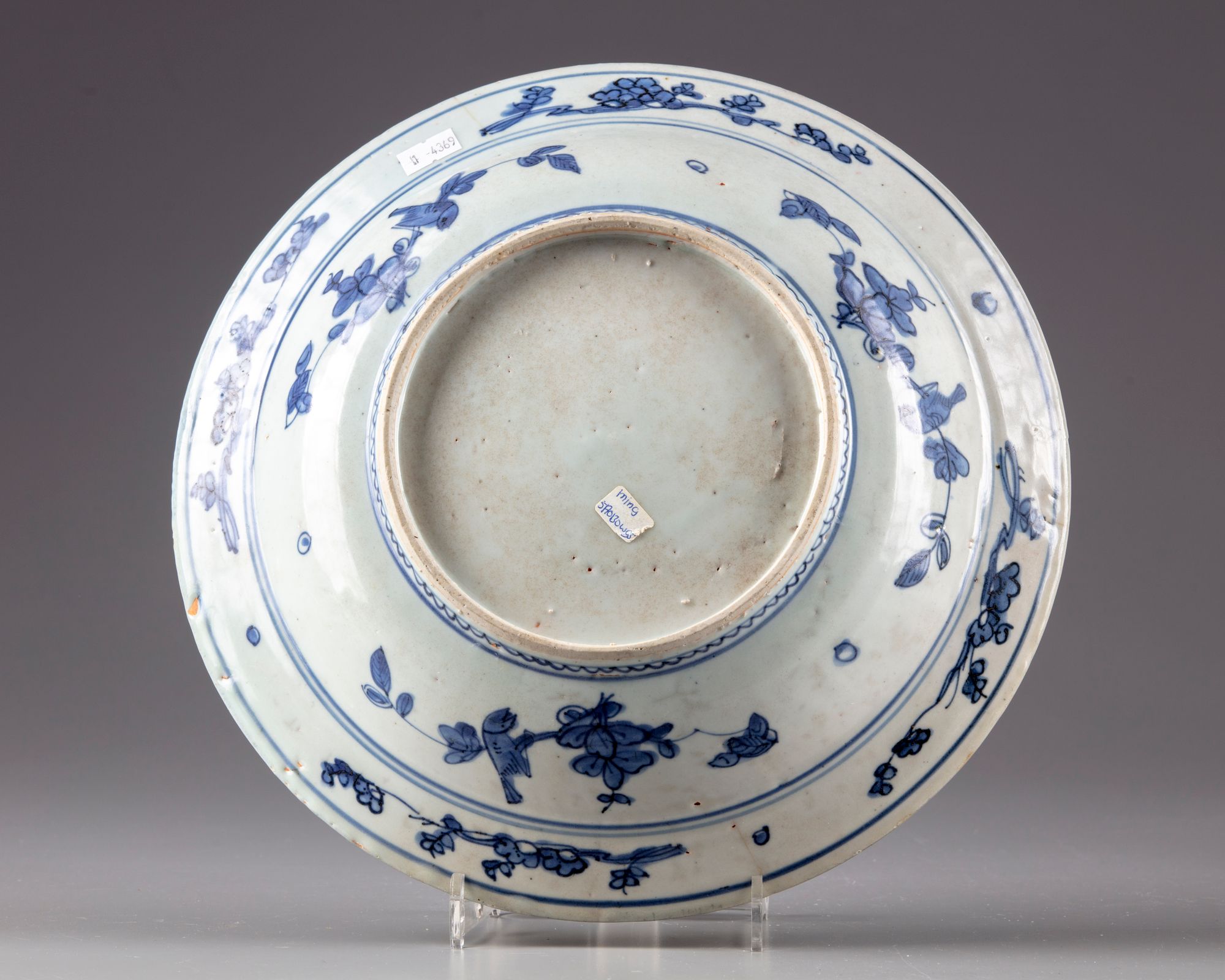 The dish is decorated with two birds perched beside a peony with flower scrolls to the sides. 26 cm. diam.