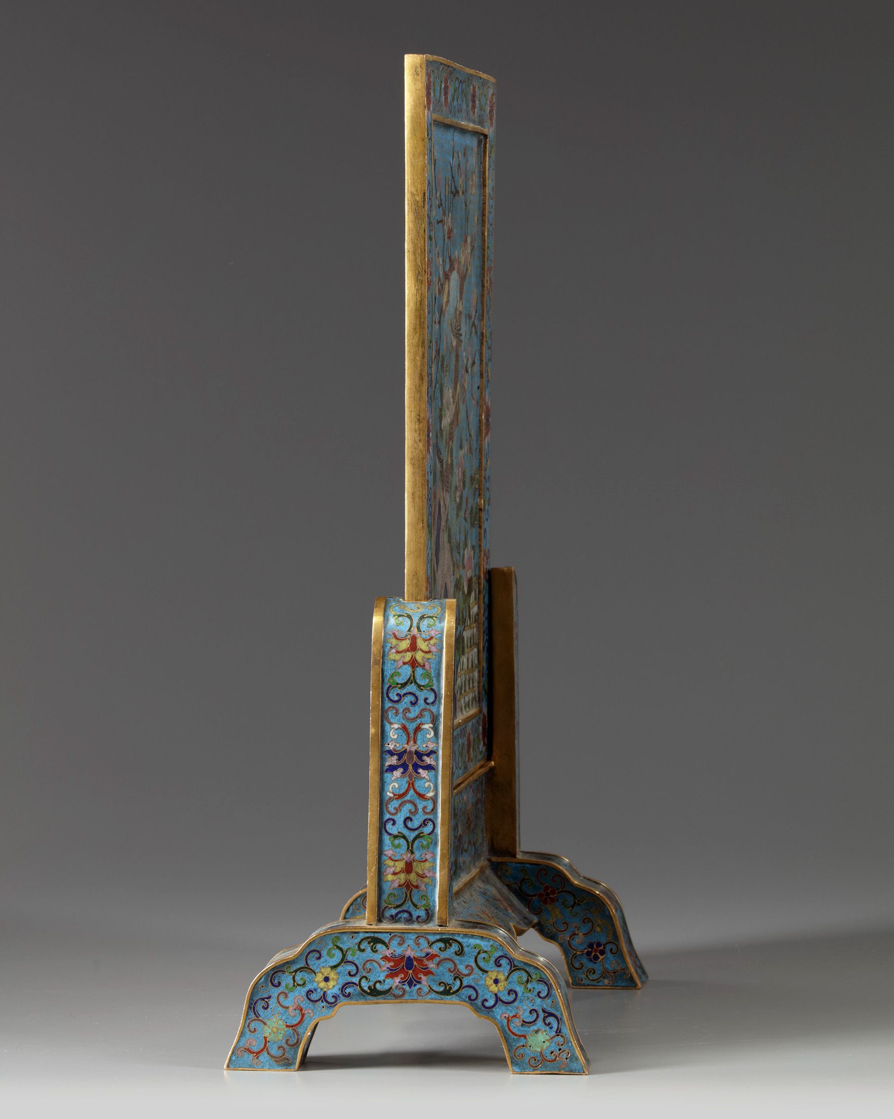A Chinese cloisonné enamel ‘magpie and prunus’ table screen