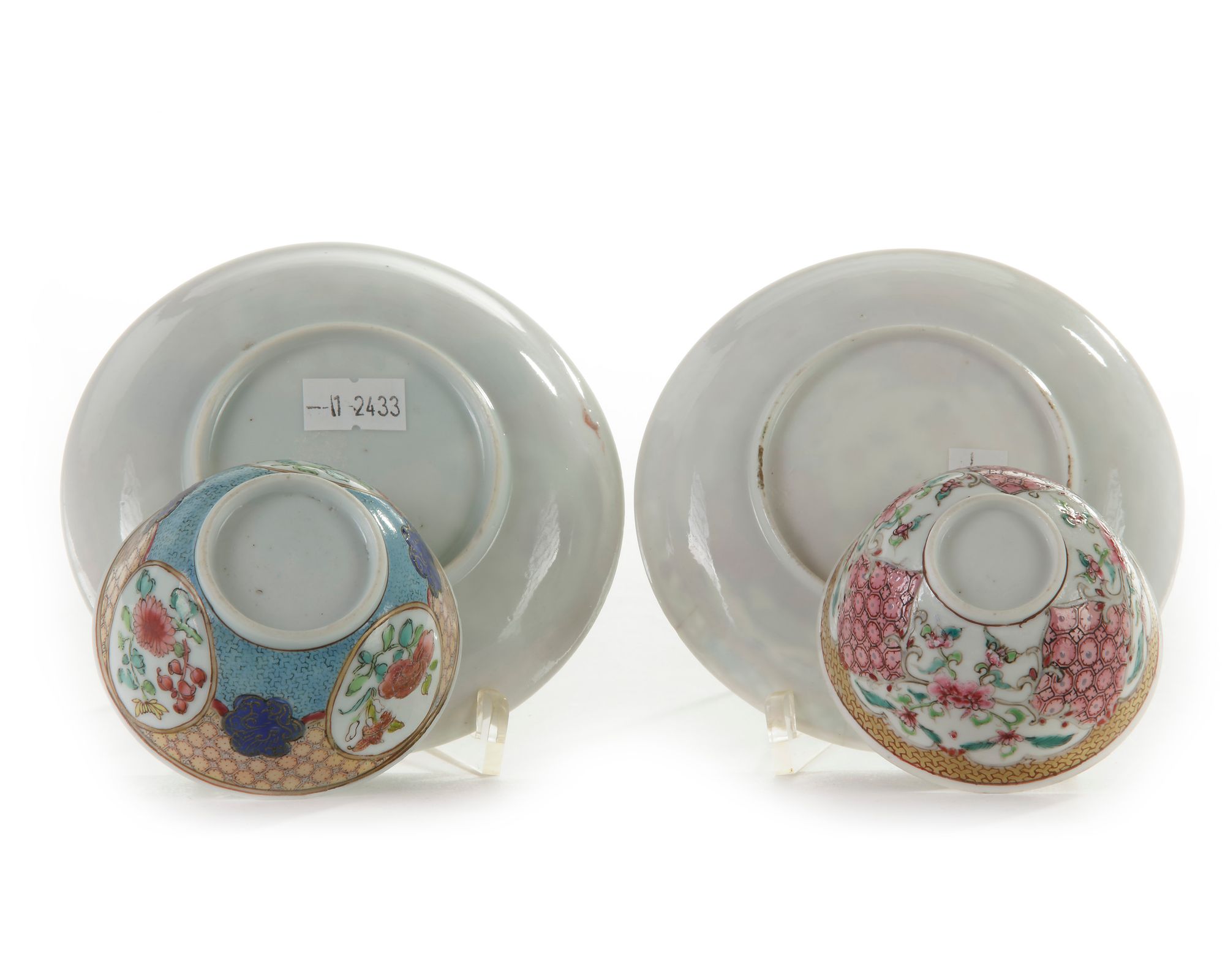 One set is delicately decorated with three floral roundels each enclosing roses, lilies, narcissus, peonies, and chrysanthemums, separated by a gilt floral kui-dragon roundel, all on a geometric ground. The other set is decorated with a central roundel enclosing a flower basket and finger citron surrounded by shaped geometric panels and further flower sprays.