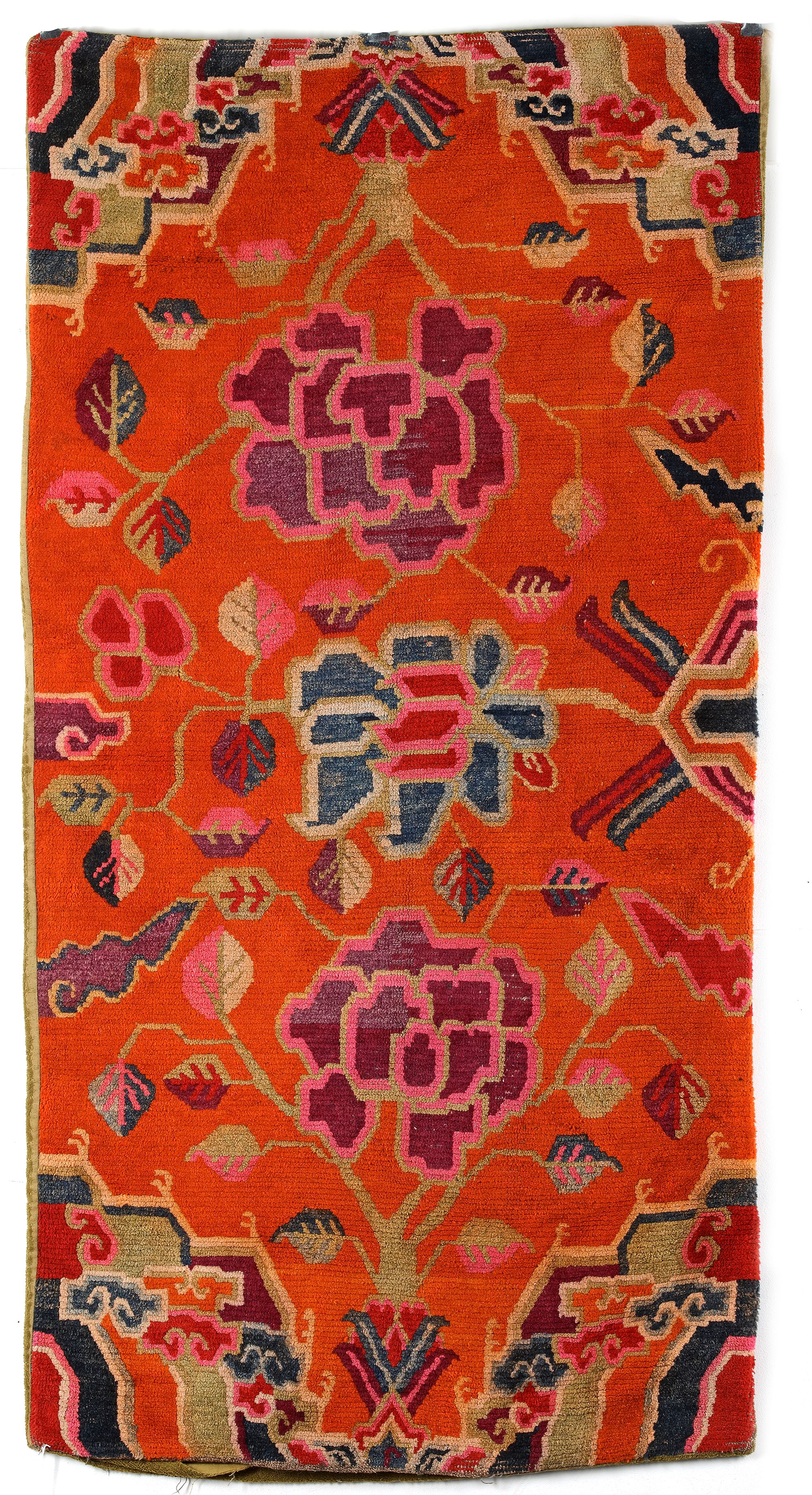 Tibetan rug designed with two large flower sprigs on an orange ground. 165 by 85 cm.