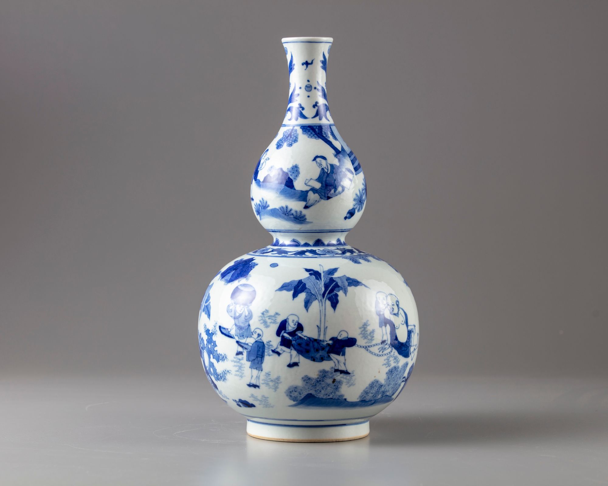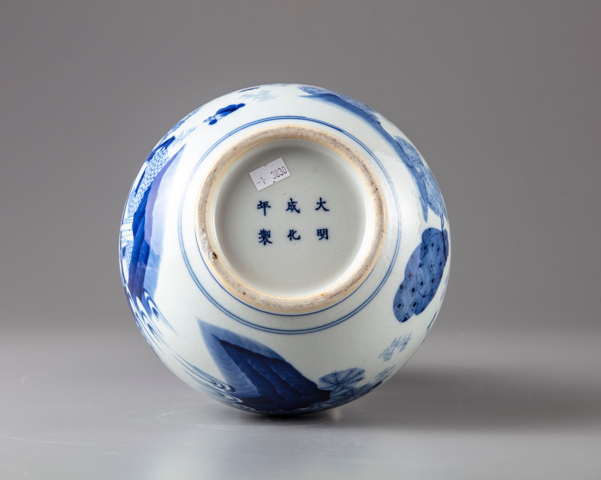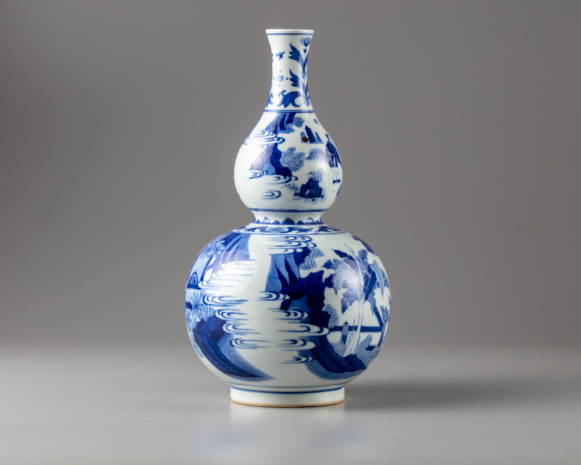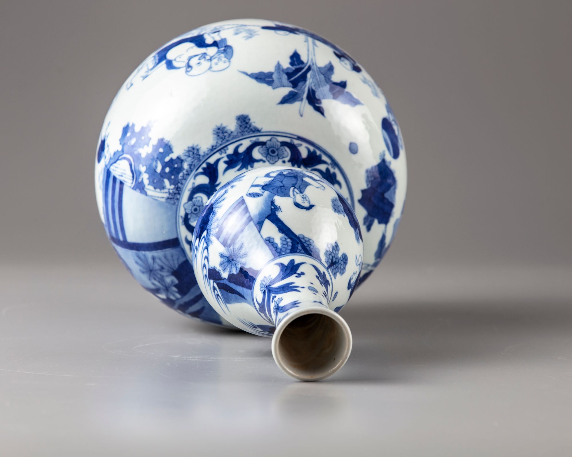 The lower globular section is decorated in blue with an elderly figure with boys in a garden beneath the upper pear-form section which is decorated with a scholar and attendant seated in a landscape below the slender neck.The base with a Chenghua six character mark.