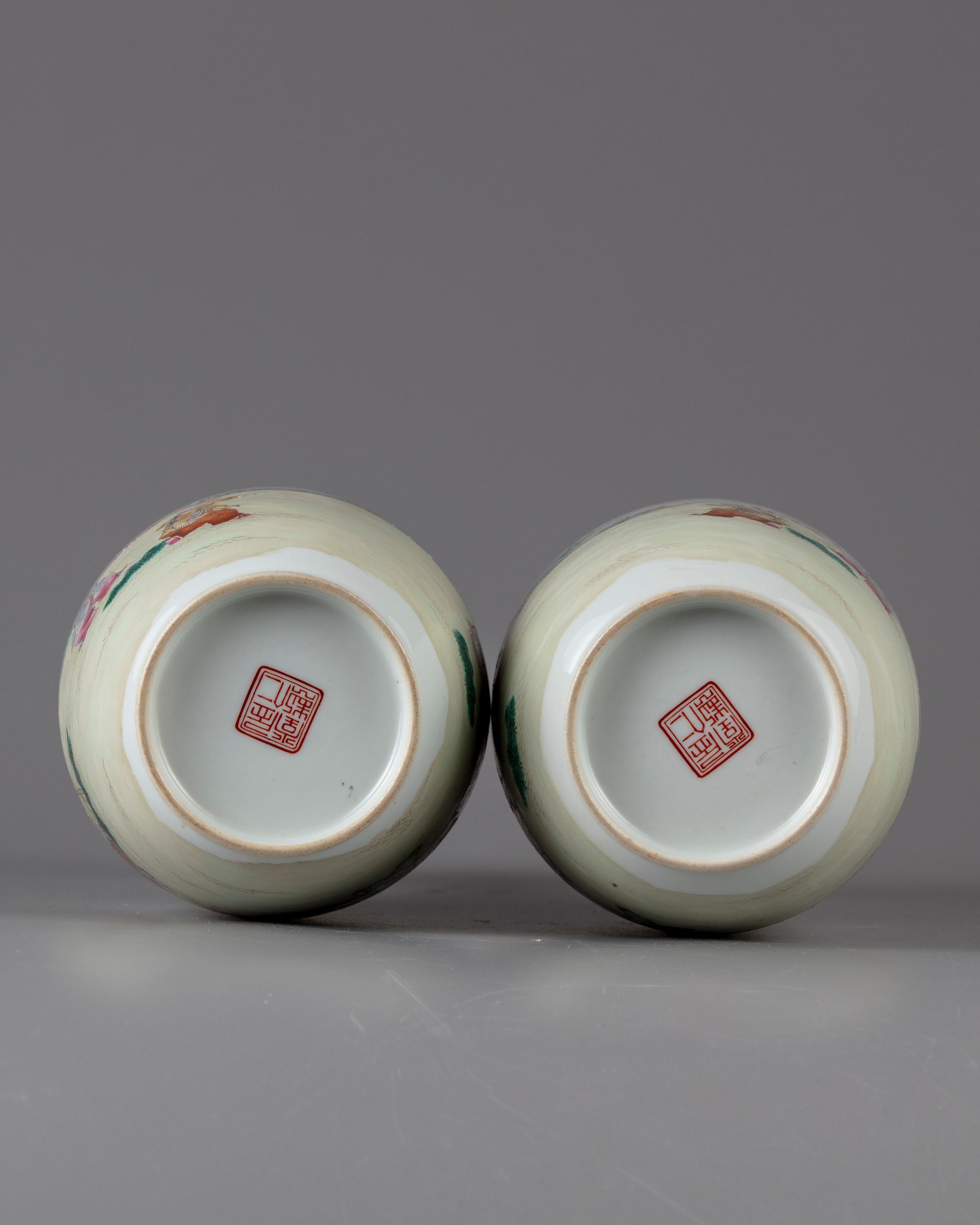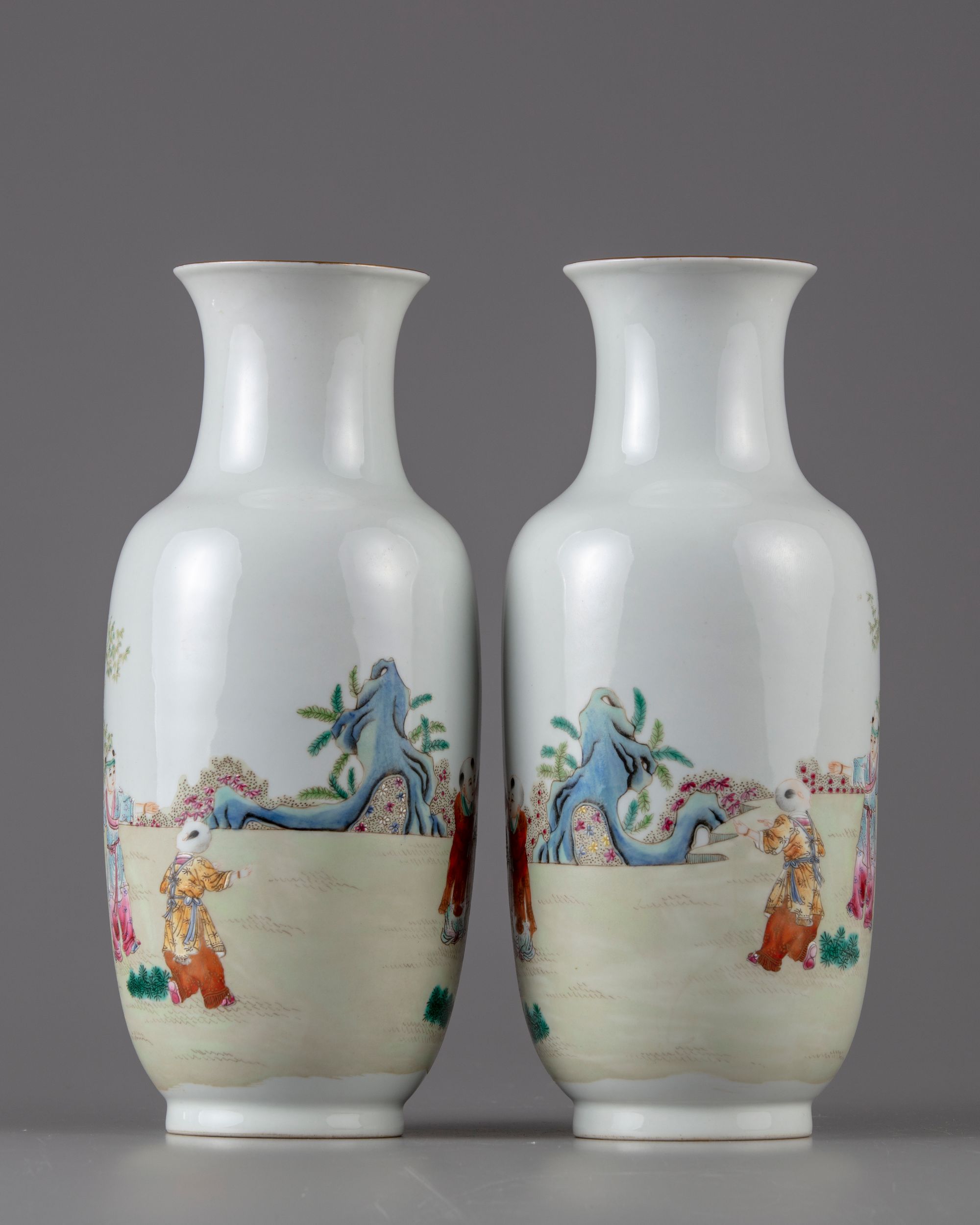Each ovoid vase is decorated in mirror image with boys at play and with cricket jars all in a fenced garden amongst rocks, plantain, and bamboo. Each rim is decorated in gilt. Each base with a 'Juren Tang zhi' seal mark in iron red.
