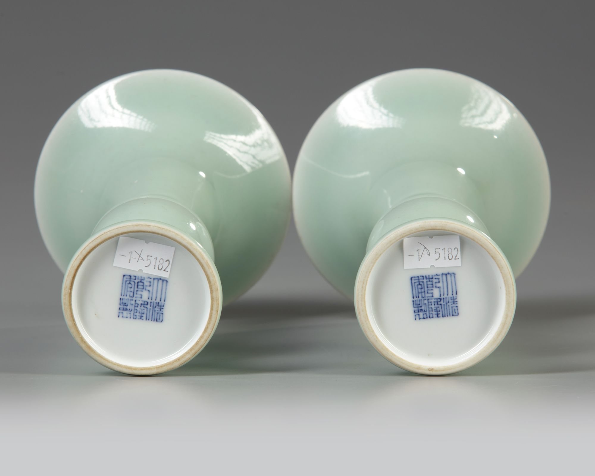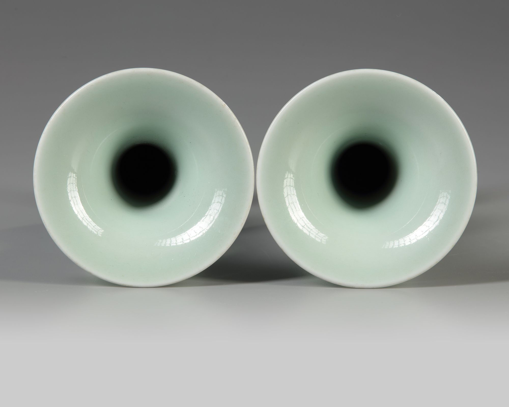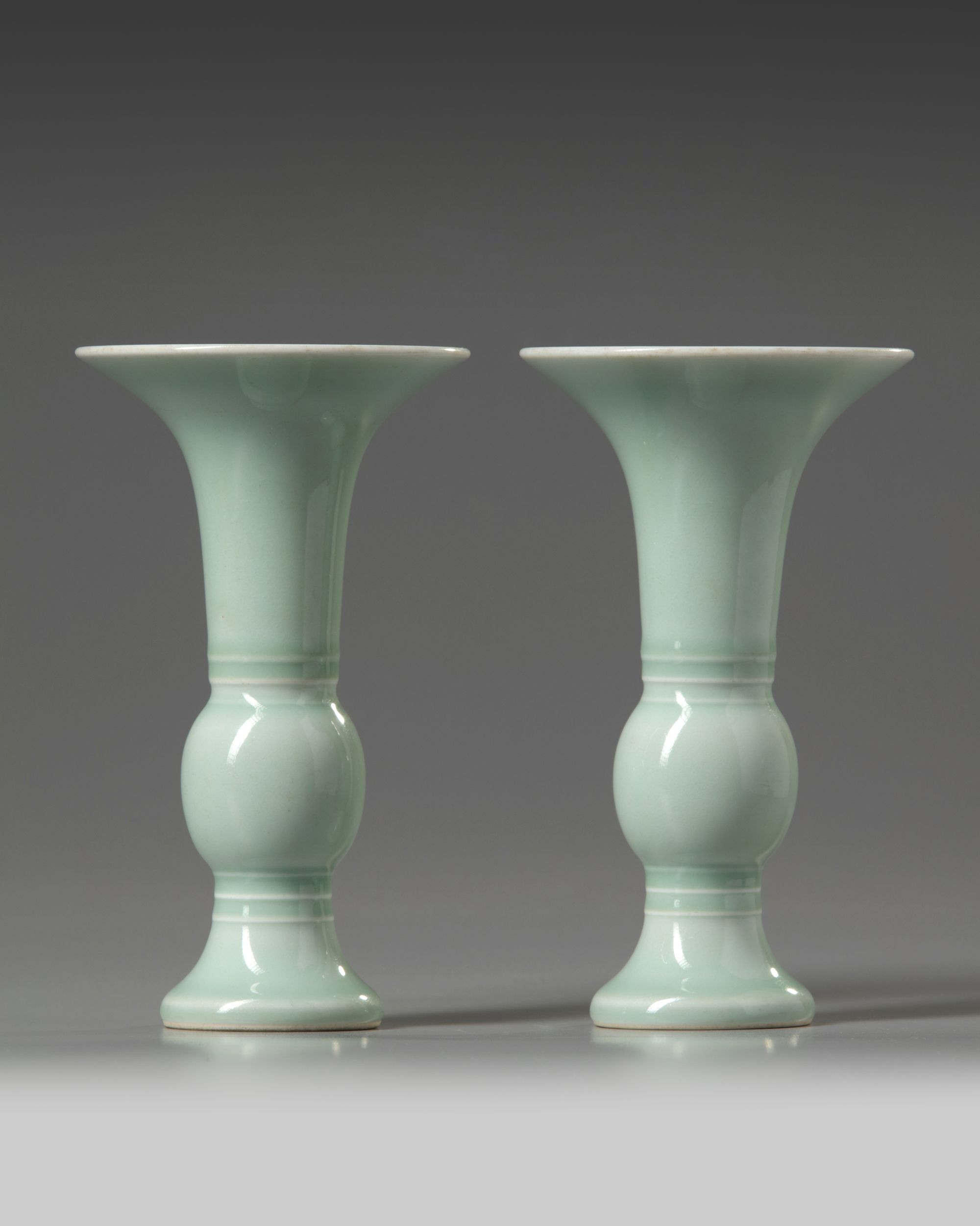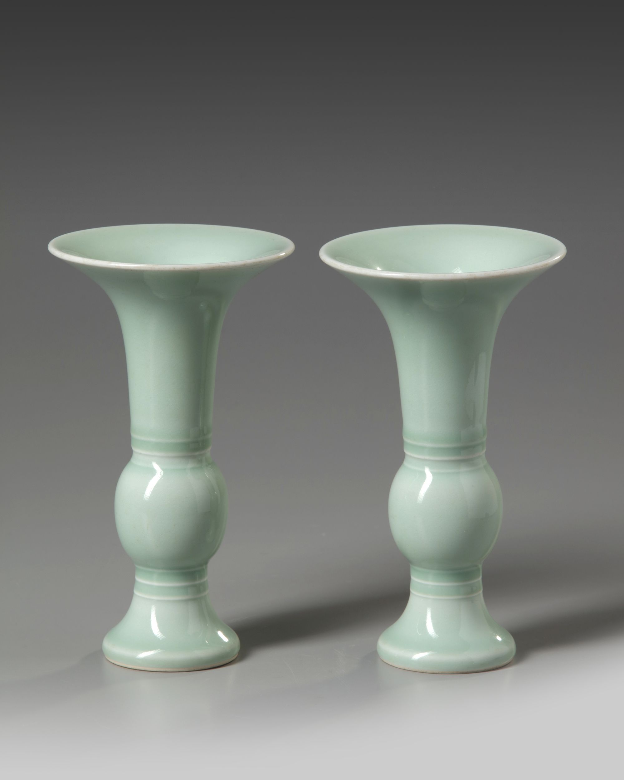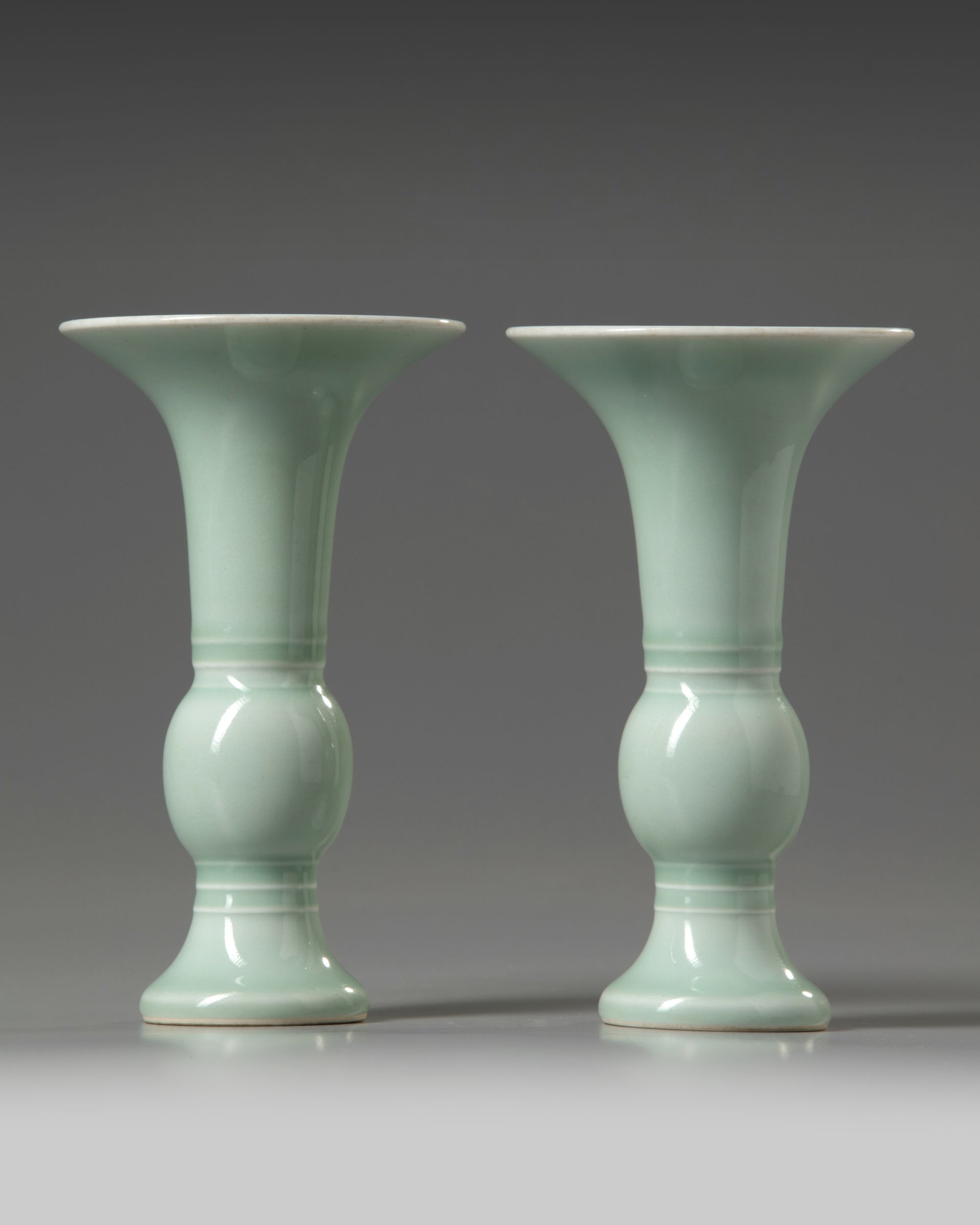 Each vase is elegantly modelled with a flaring neck and foot separated by a ovoid middle section. Each vase is covered with soft celadon glaze.