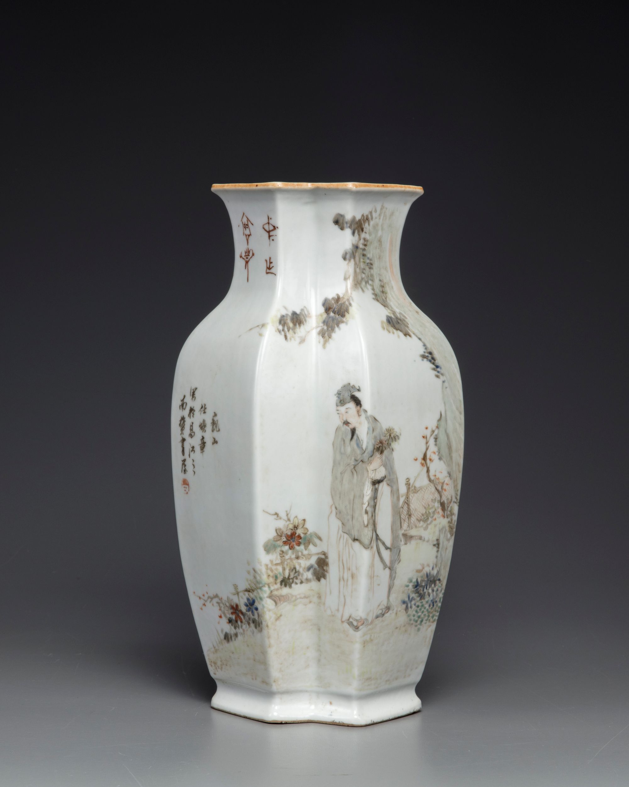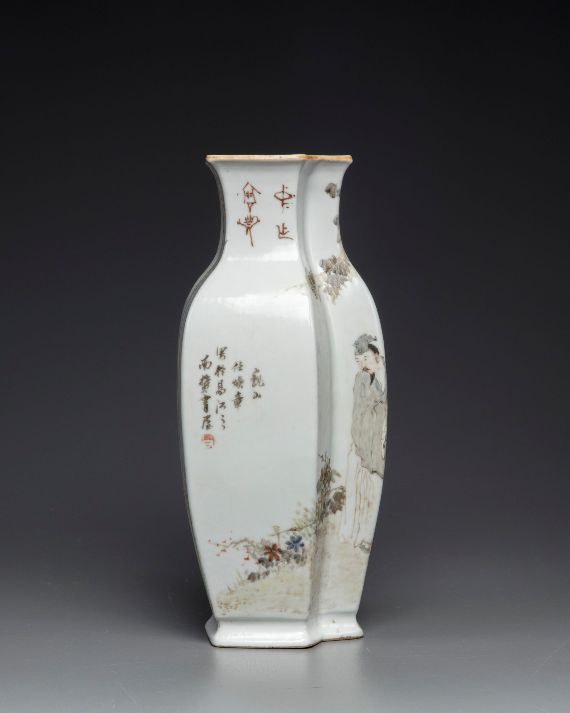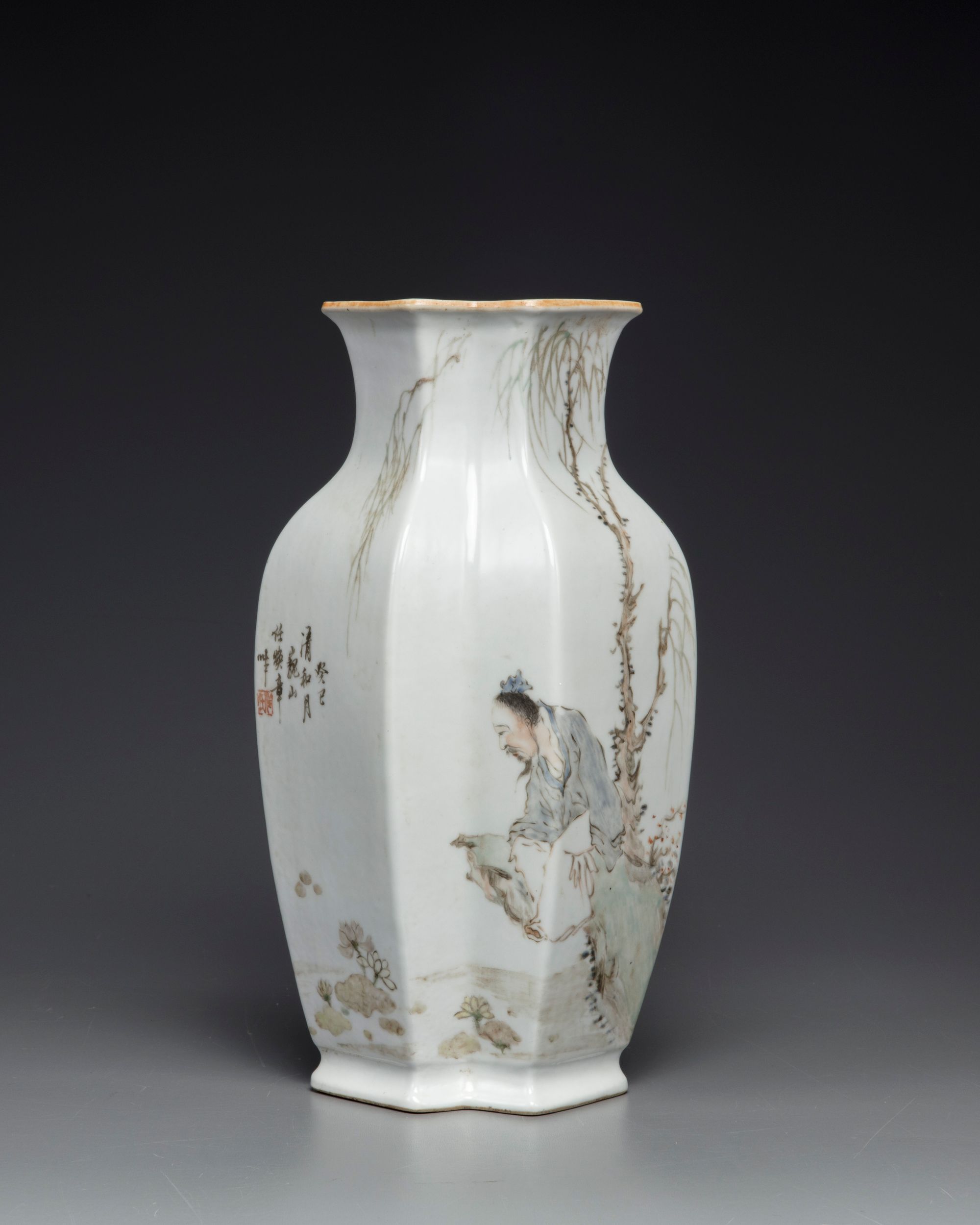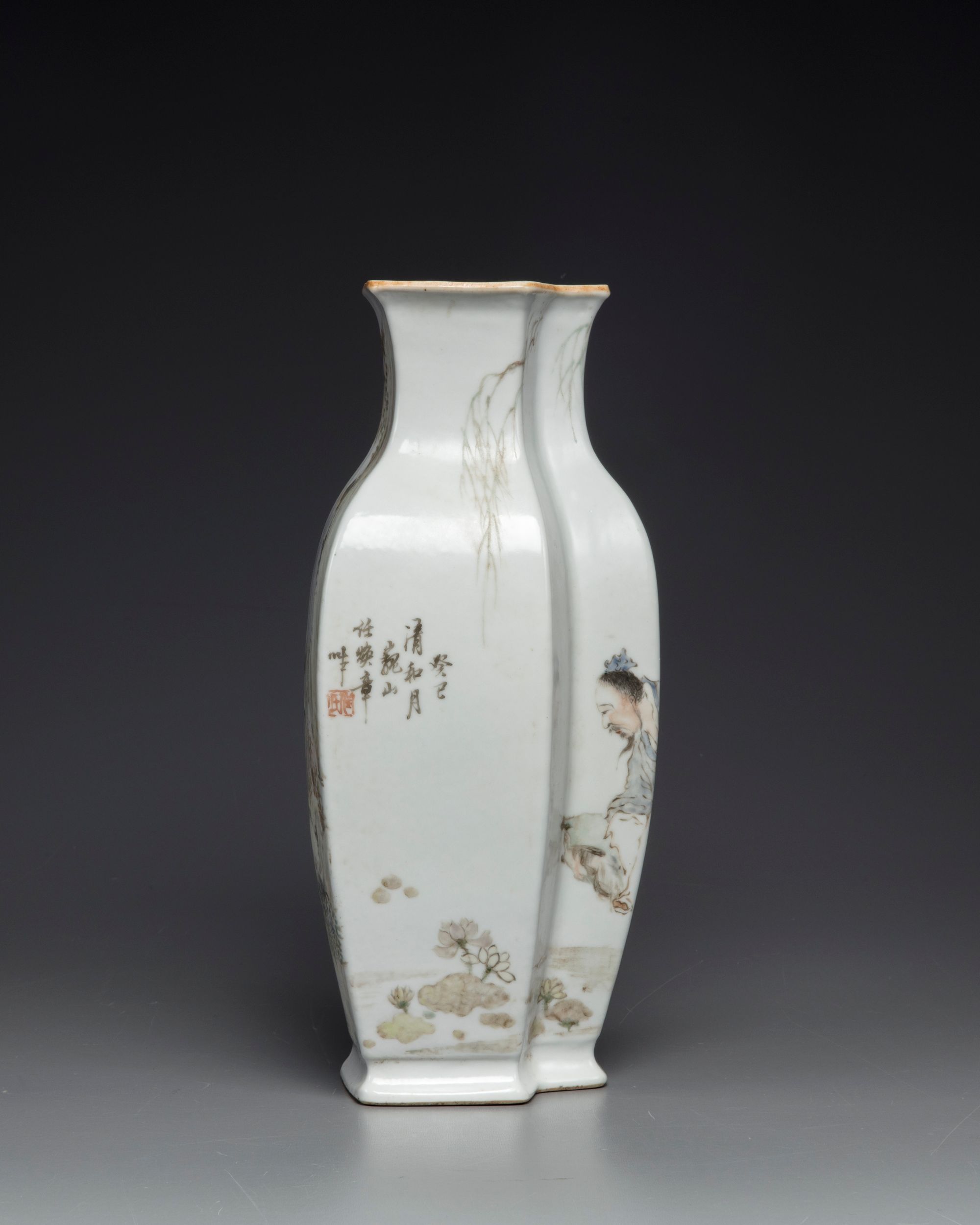 The vase is decorated to each side, one side seated on rocks next to a lotus pond below willow; the other side with a standing scholar holding a flower sprays, in a fenced garden below a rocky outcrop. Both sides are inscribed with an iron-red seal. The base with a mark reading 'Guanyao nei zao'.