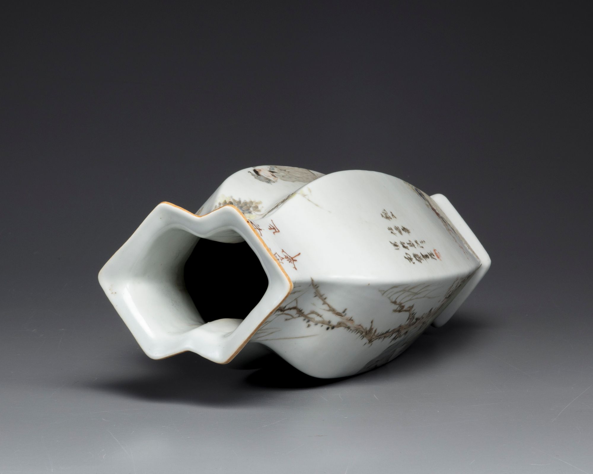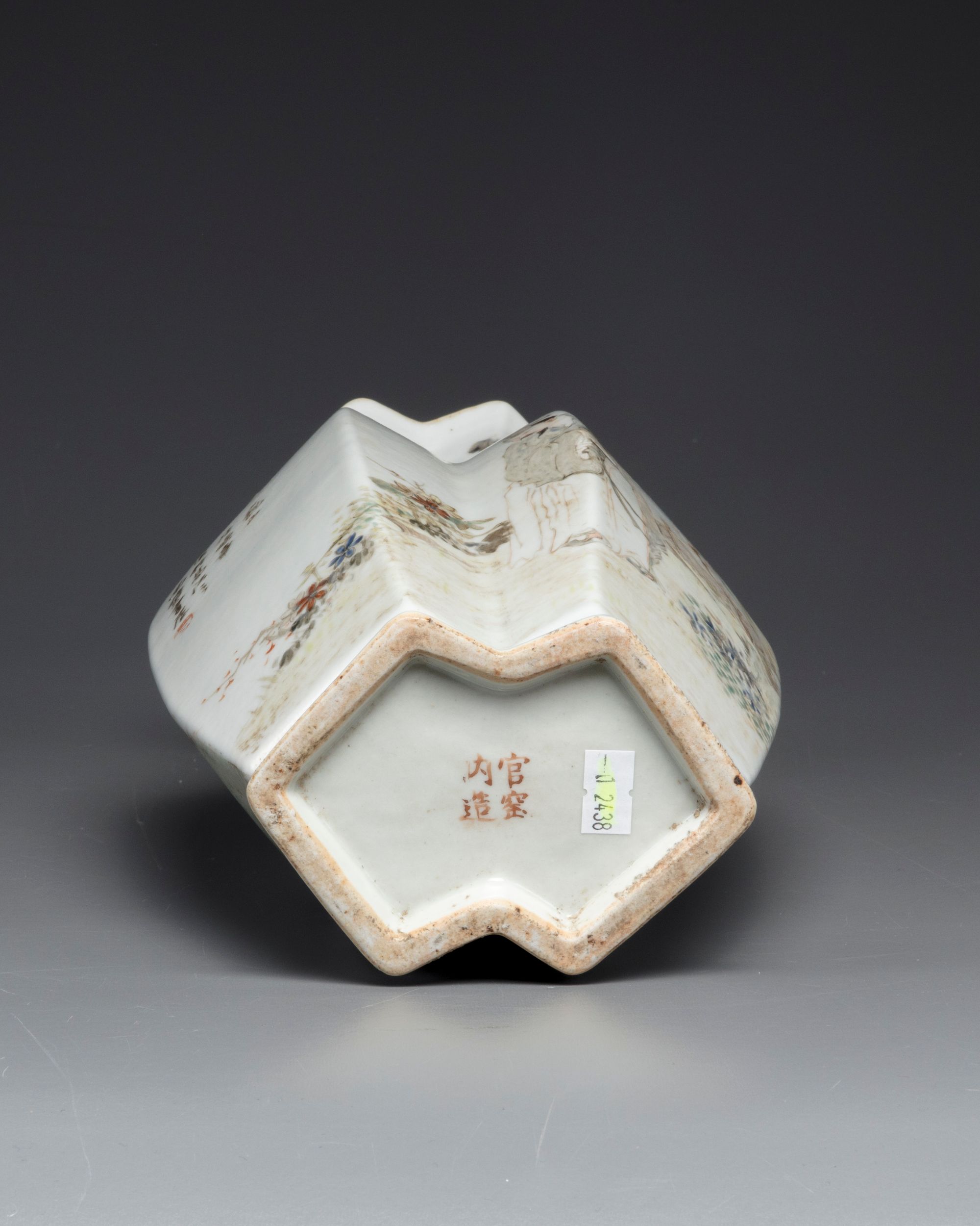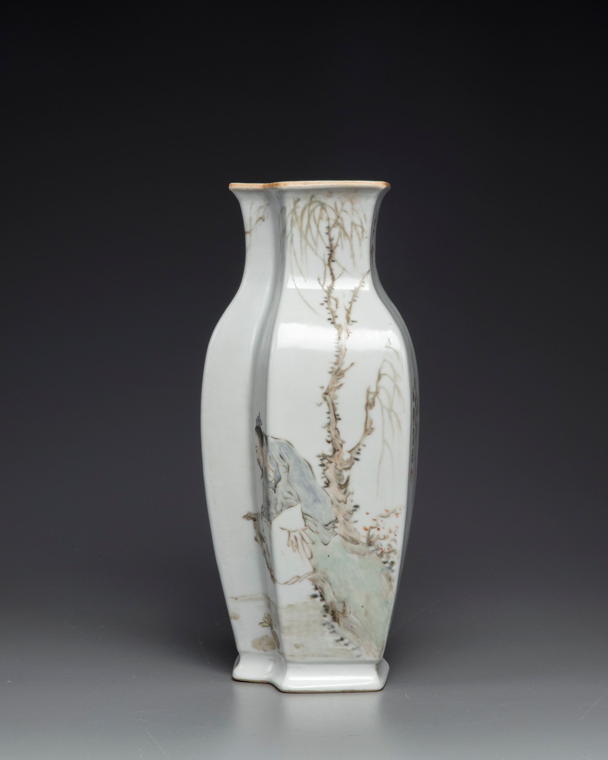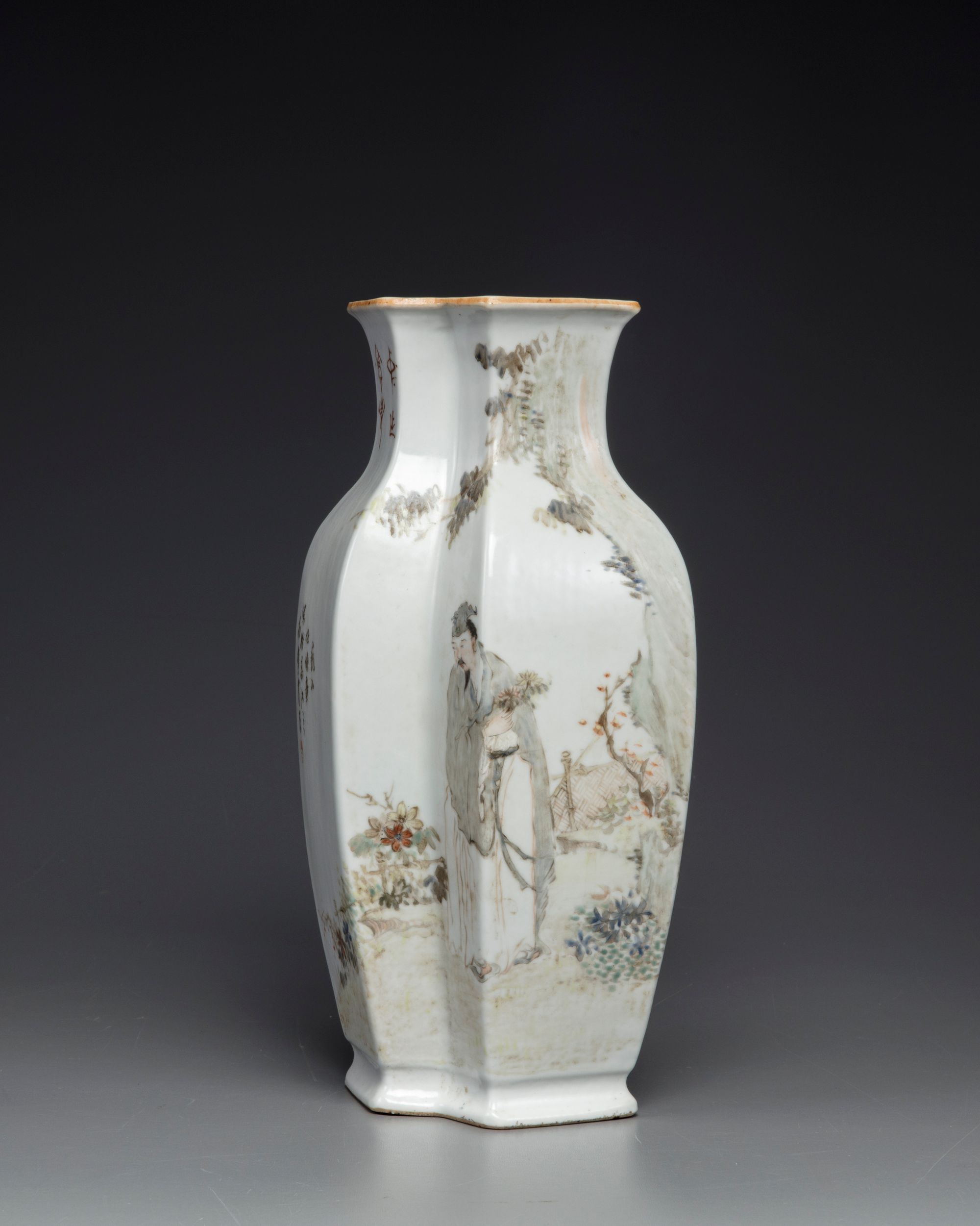 The vase is decorated to each side, one side seated on rocks next to a lotus pond below willow; the other side with a standing scholar holding a flower sprays, in a fenced garden below a rocky outcrop. Both sides are inscribed with an iron-red seal. The base with a mark reading 'Guanyao nei zao'.