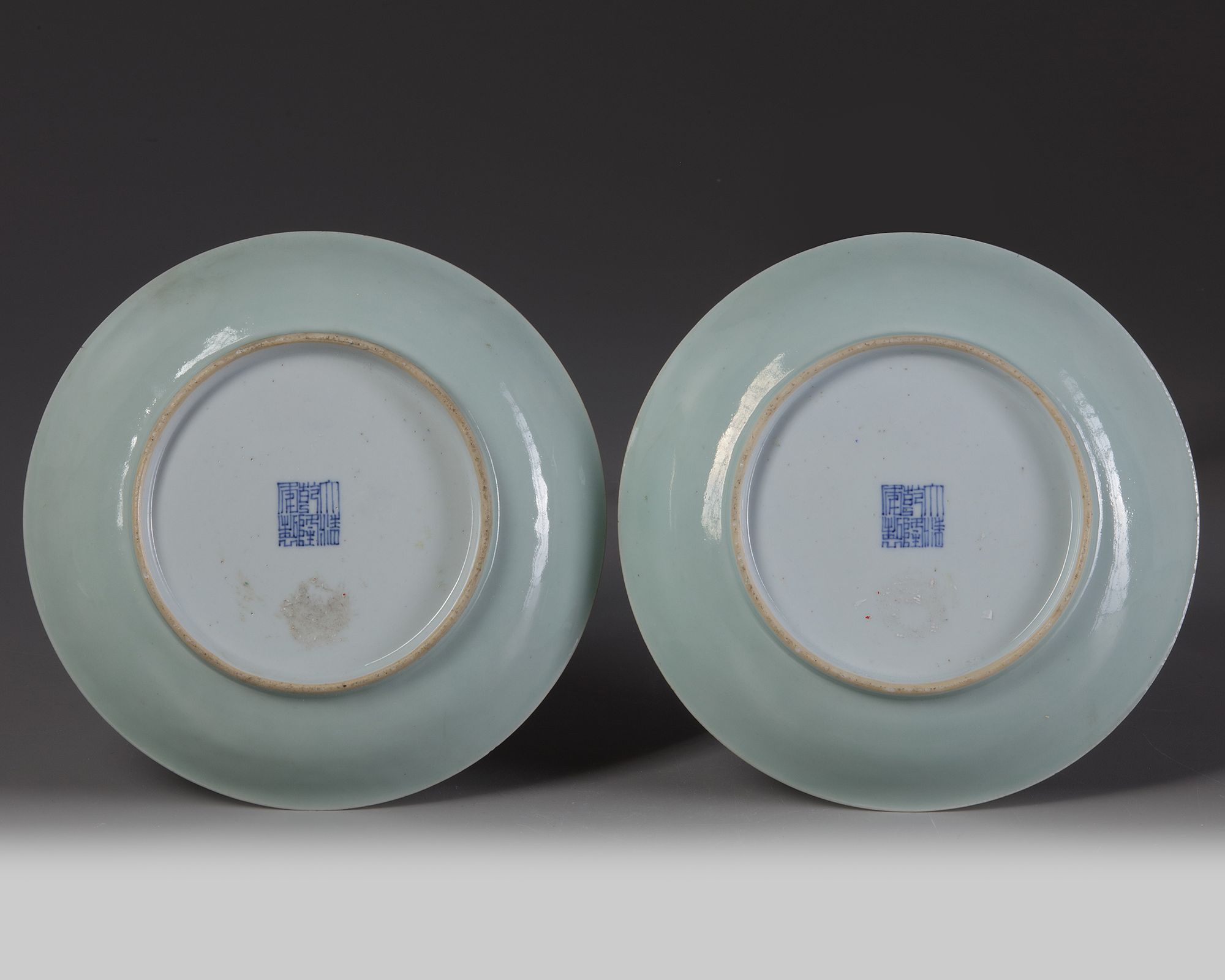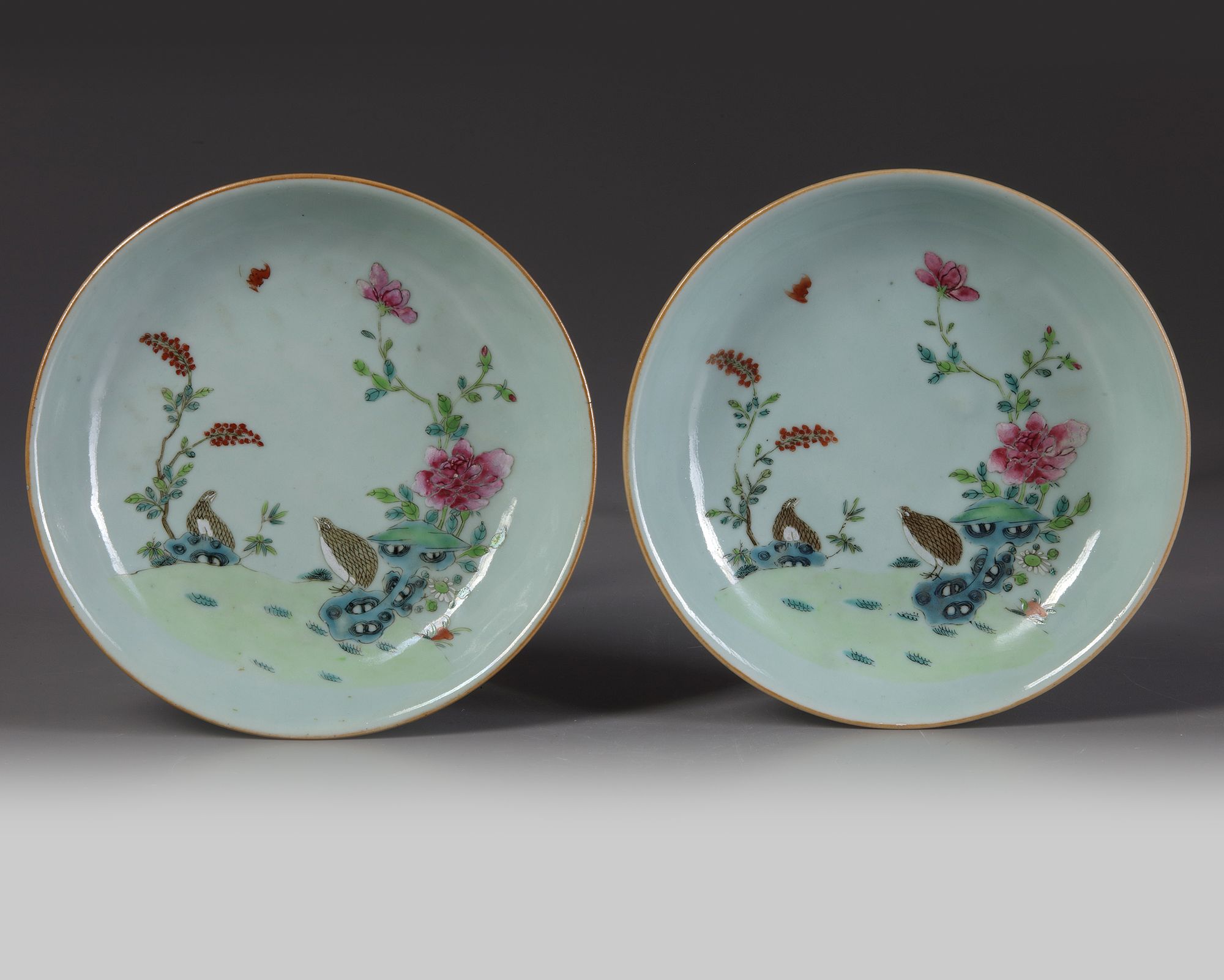 Each dish is decorated with two quails below peonies and nandina berries amongst rocks, all reserved on a celadon ground. The rims are washed in brown. 19.5 cm. diam.