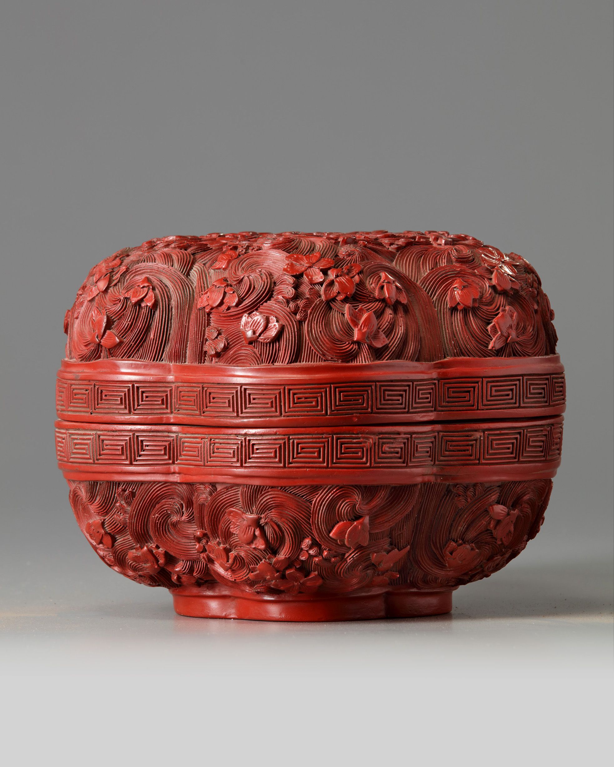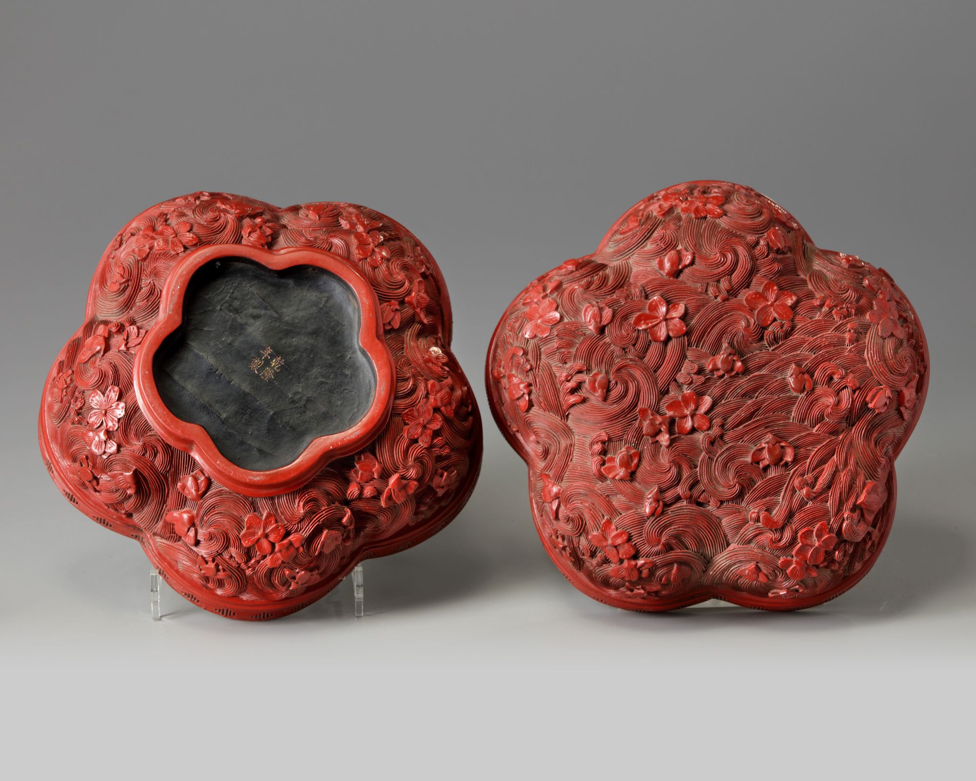 The five-lobed box is decorated to the cover and box base with a pattern of prunus floating amongst turbulent waves. The interior and base is lacquered black, with an apocryphal Qianlong mark to base.