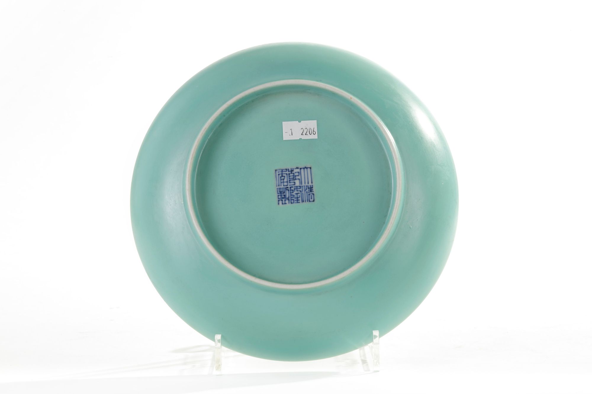 The dish is finely decorated to the interior by an elderly figure holding and surrounded by boys at play on a terrace. The exterior glazed turquoise and with an apocryphal Qianlong seal mark to the base.