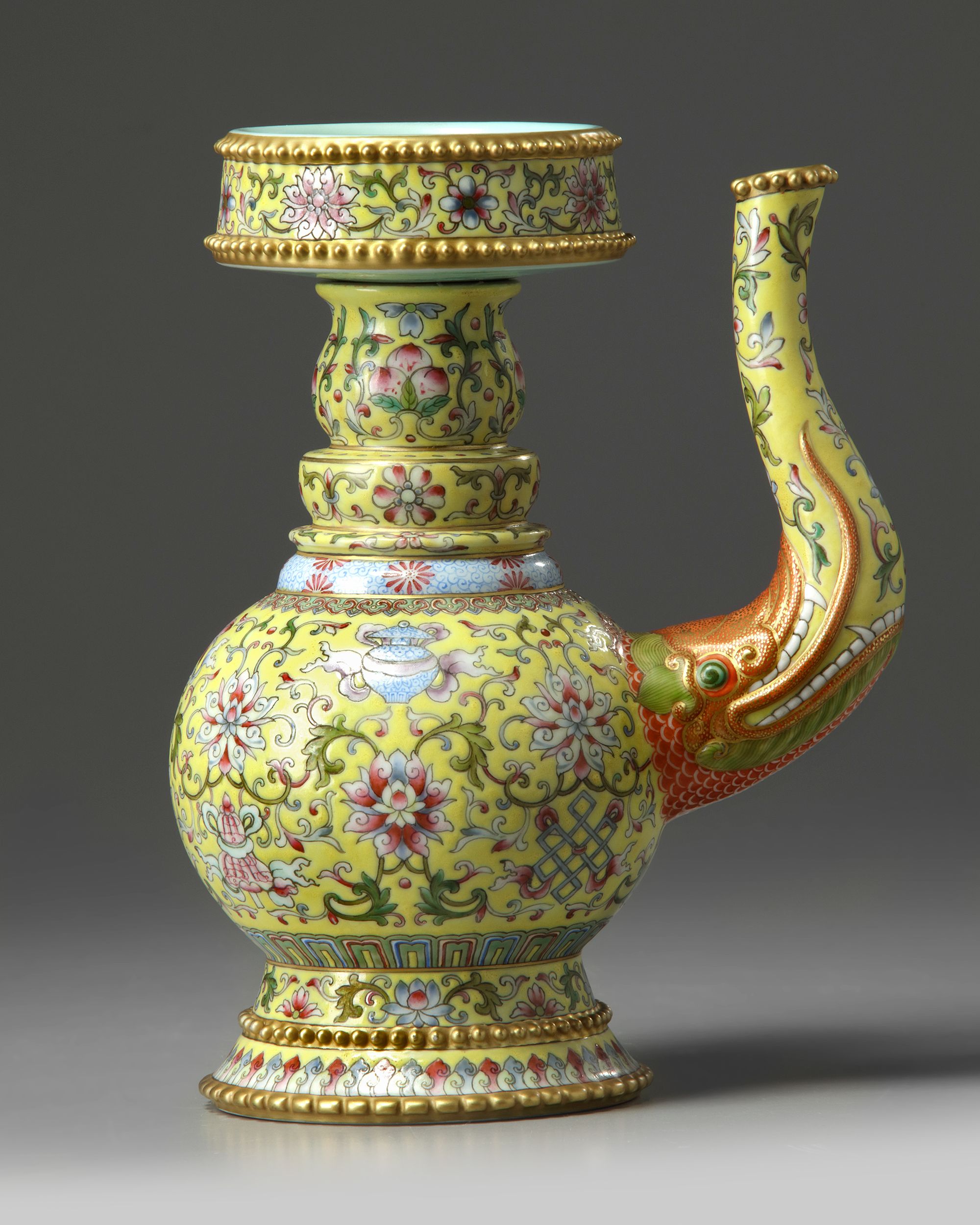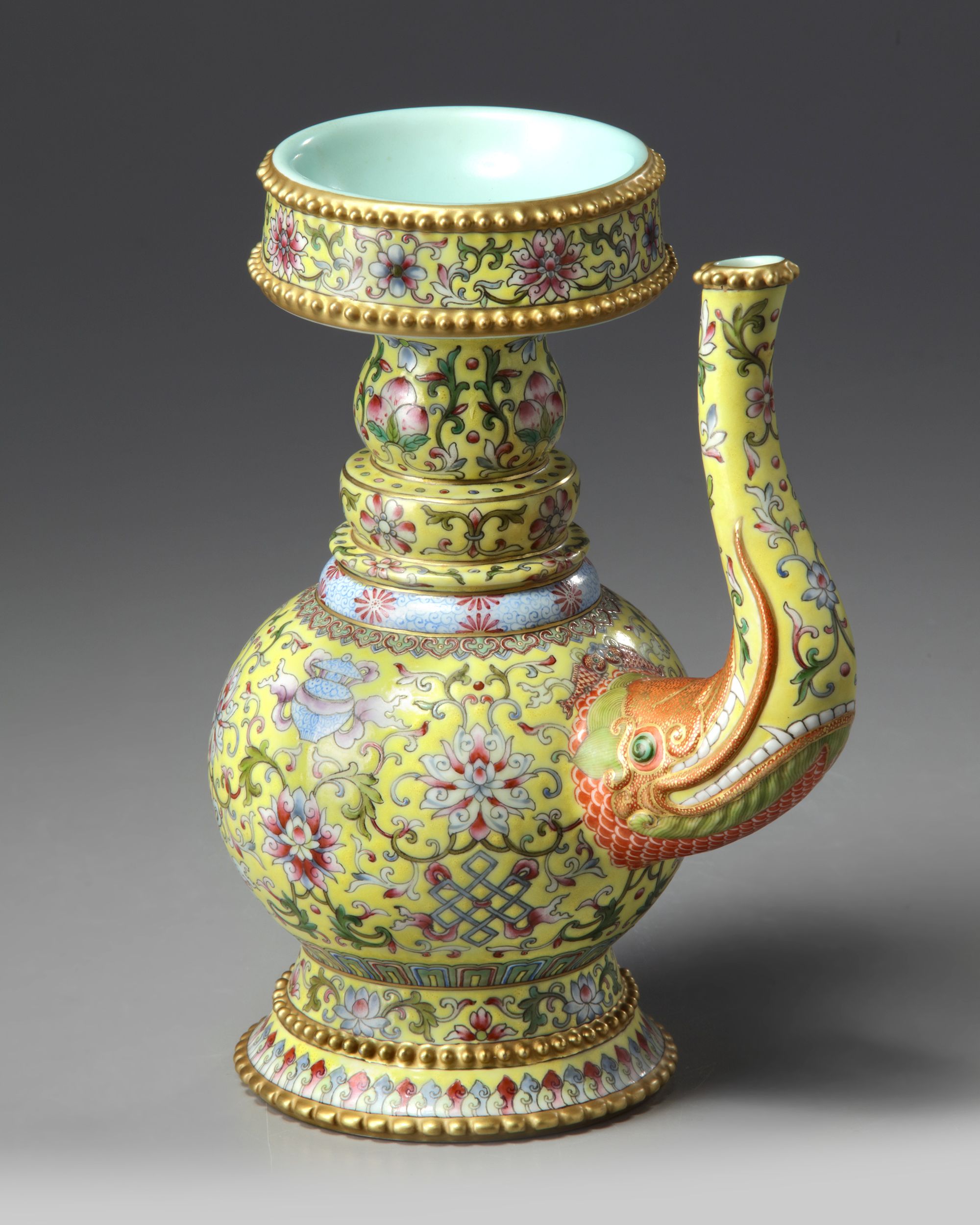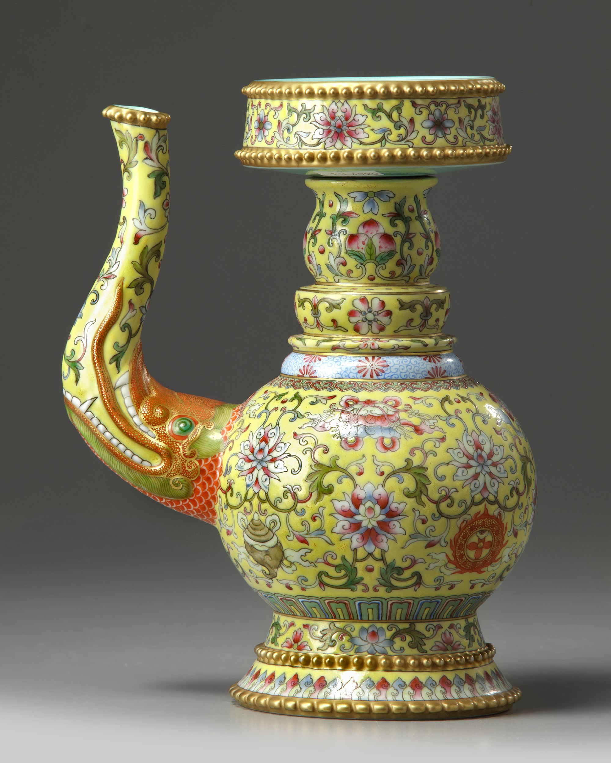 The vase is comprised of an upper removable section and the vase itself. The vase stands on a spreading foot decorated with two registers of gilt nodes, the body is decorated with an applied s-shaped spout emerging from the gaping jaws of a moulded makara, the body is decorated with the bajixiang (Eight Buddhist Emblems) amongst lotus scrolls below bands of flowers and peaches at the neck. The upper section is similarly decorated. The turquoise-glazed base bears a Qianlong mark. 21.2 cm.