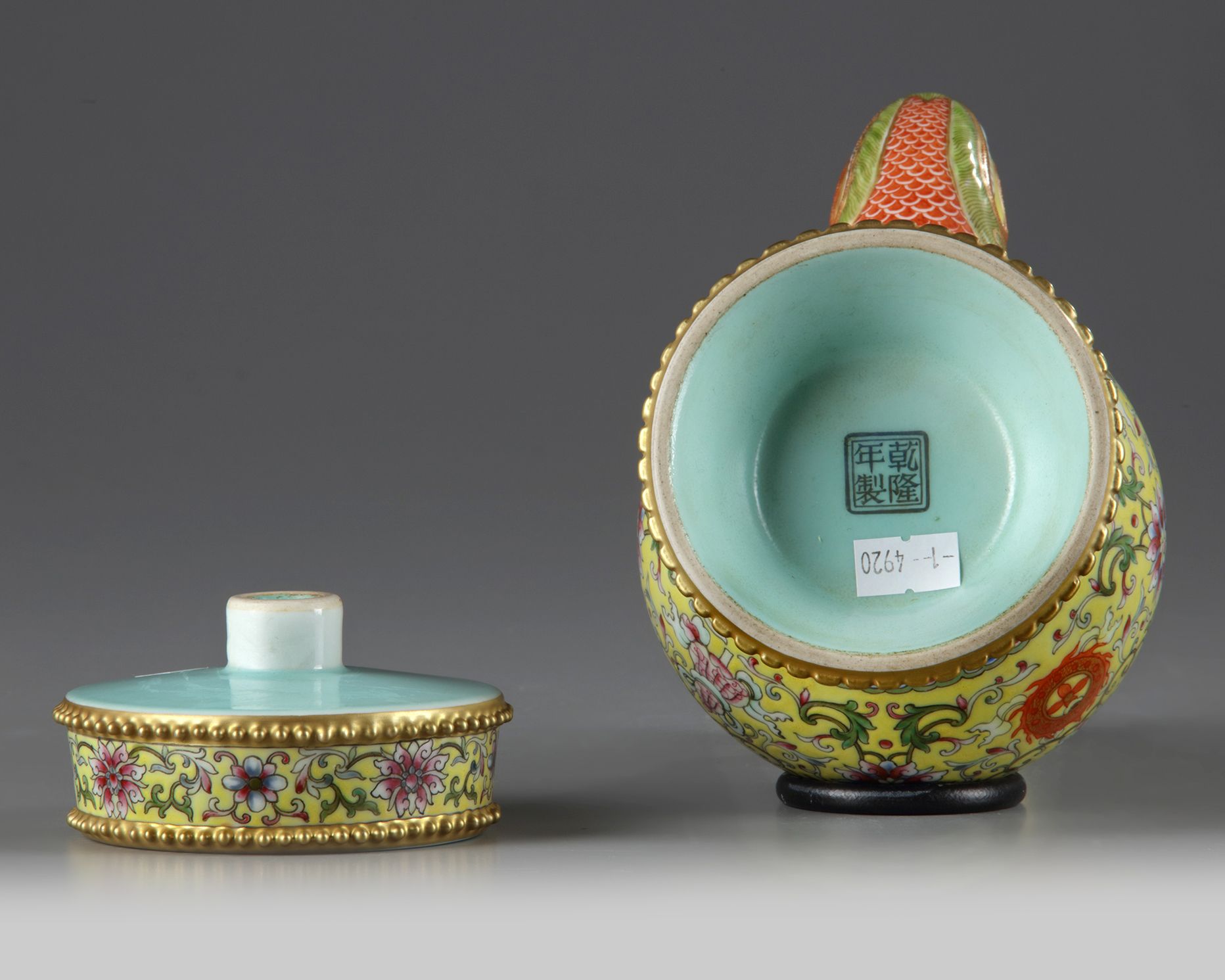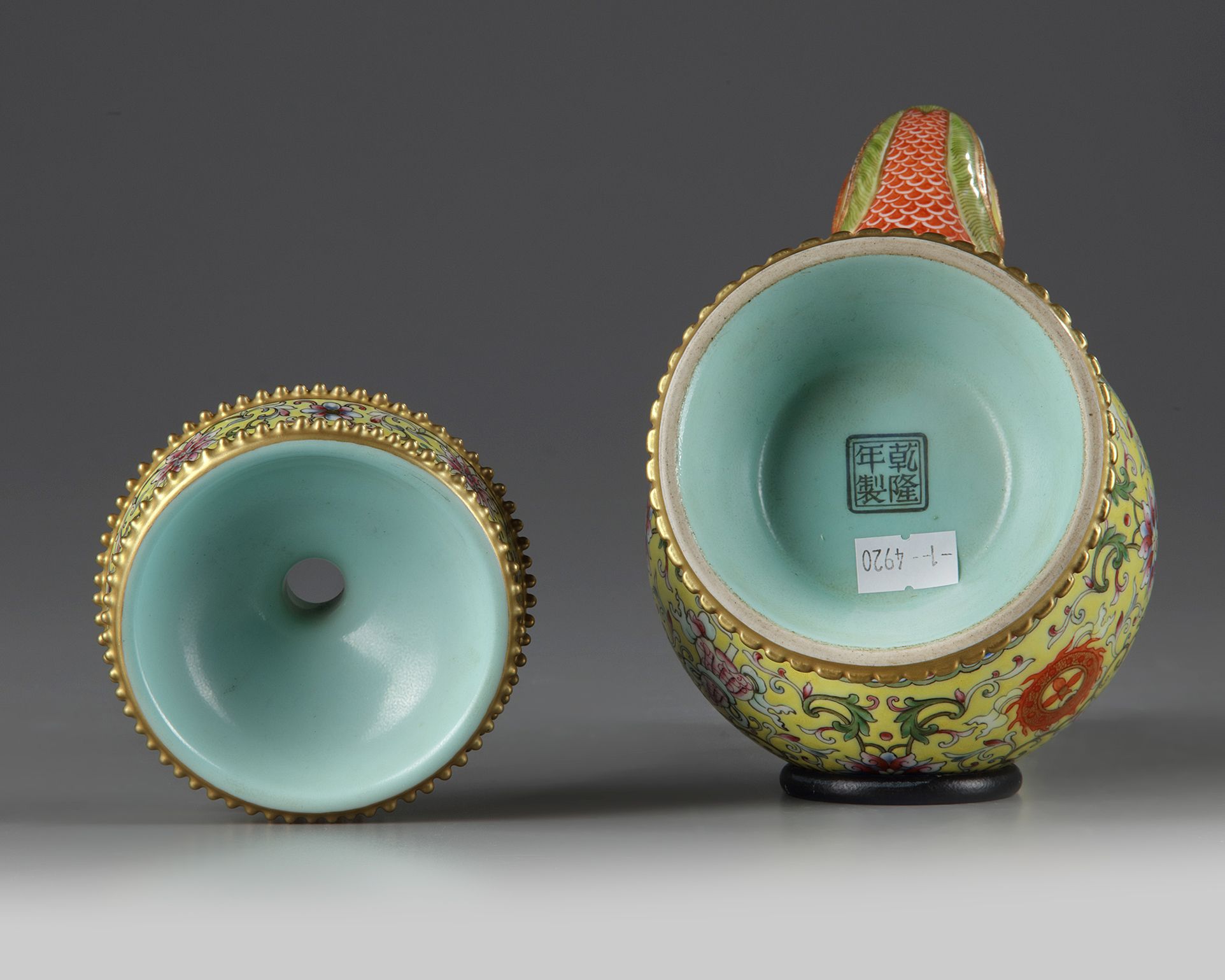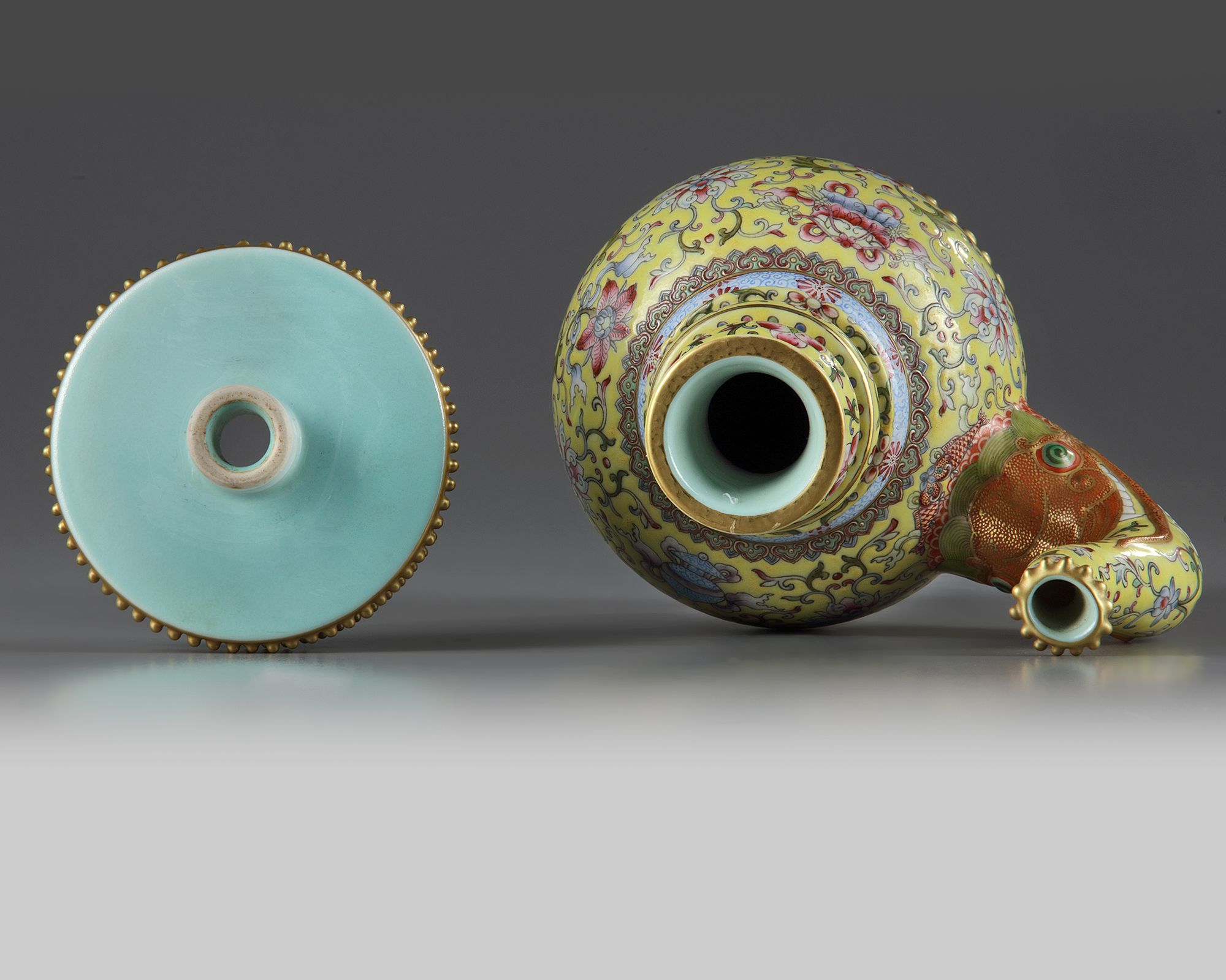 The vase is comprised of an upper removable section and the vase itself. The vase stands on a spreading foot decorated with two registers of gilt nodes, the body is decorated with an applied s-shaped spout emerging from the gaping jaws of a moulded makara, the body is decorated with the bajixiang (Eight Buddhist Emblems) amongst lotus scrolls below bands of flowers and peaches at the neck. The upper section is similarly decorated. The turquoise-glazed base bears a Qianlong mark. 21.2 cm.