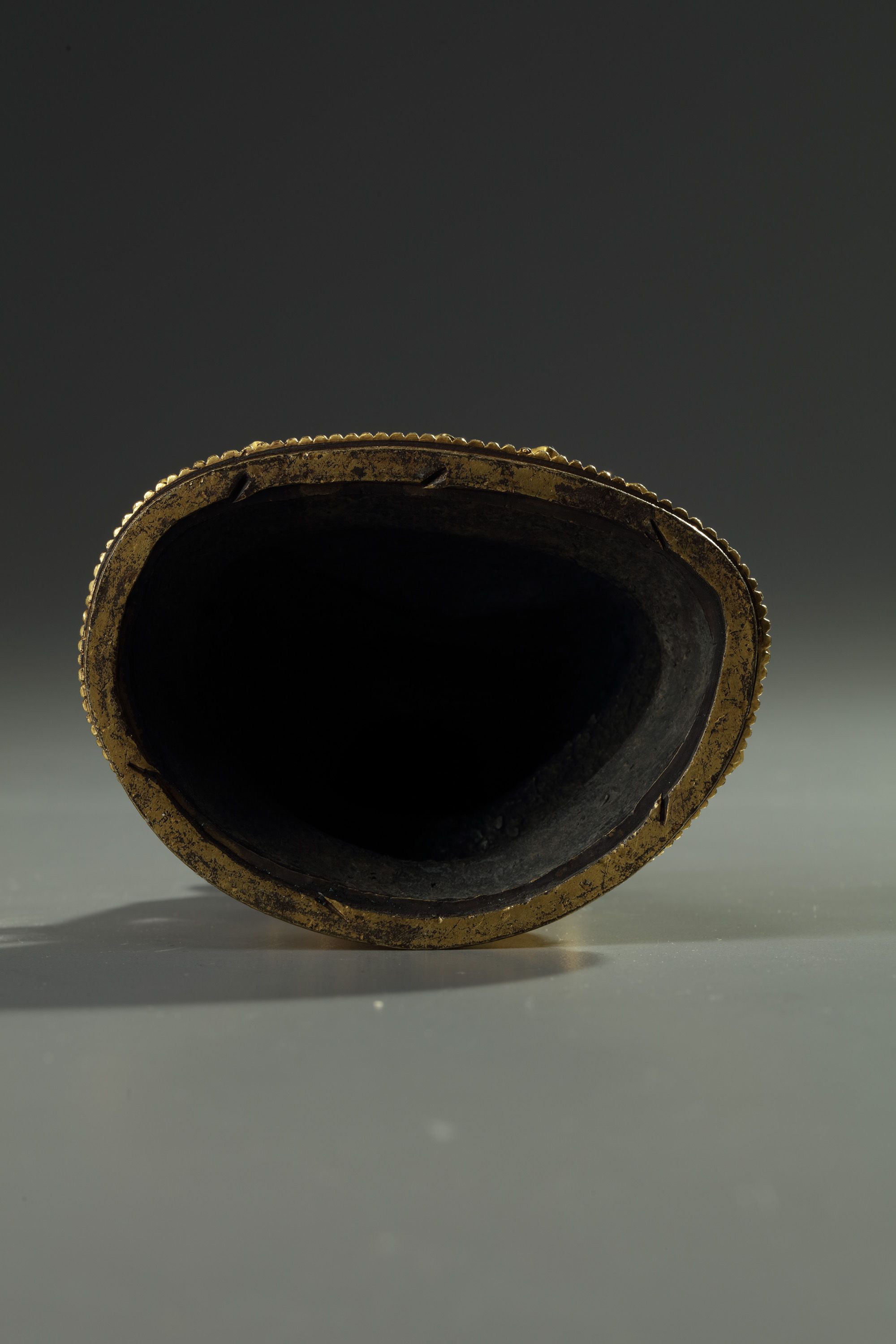 The figure is cast with a serene expression, his hair in a topknot behind an elaborate foliate crown, and wearing elaborate jewelry and celestial scarves which drape over his arms which are crossed and holding a vajra and a ghanta. His legs are crossed in dhyanasana and seated on a double lotus base.