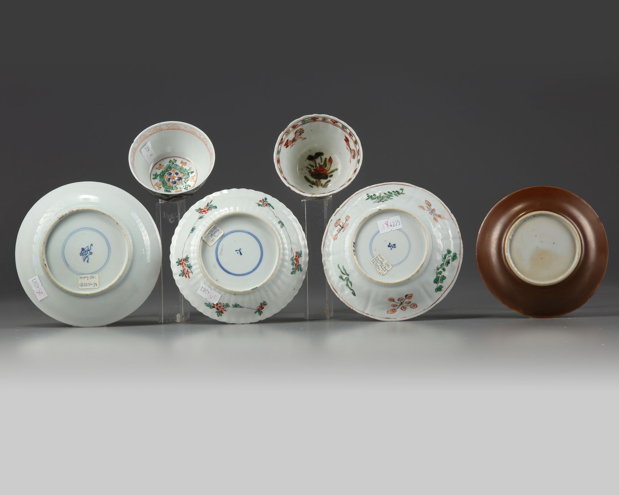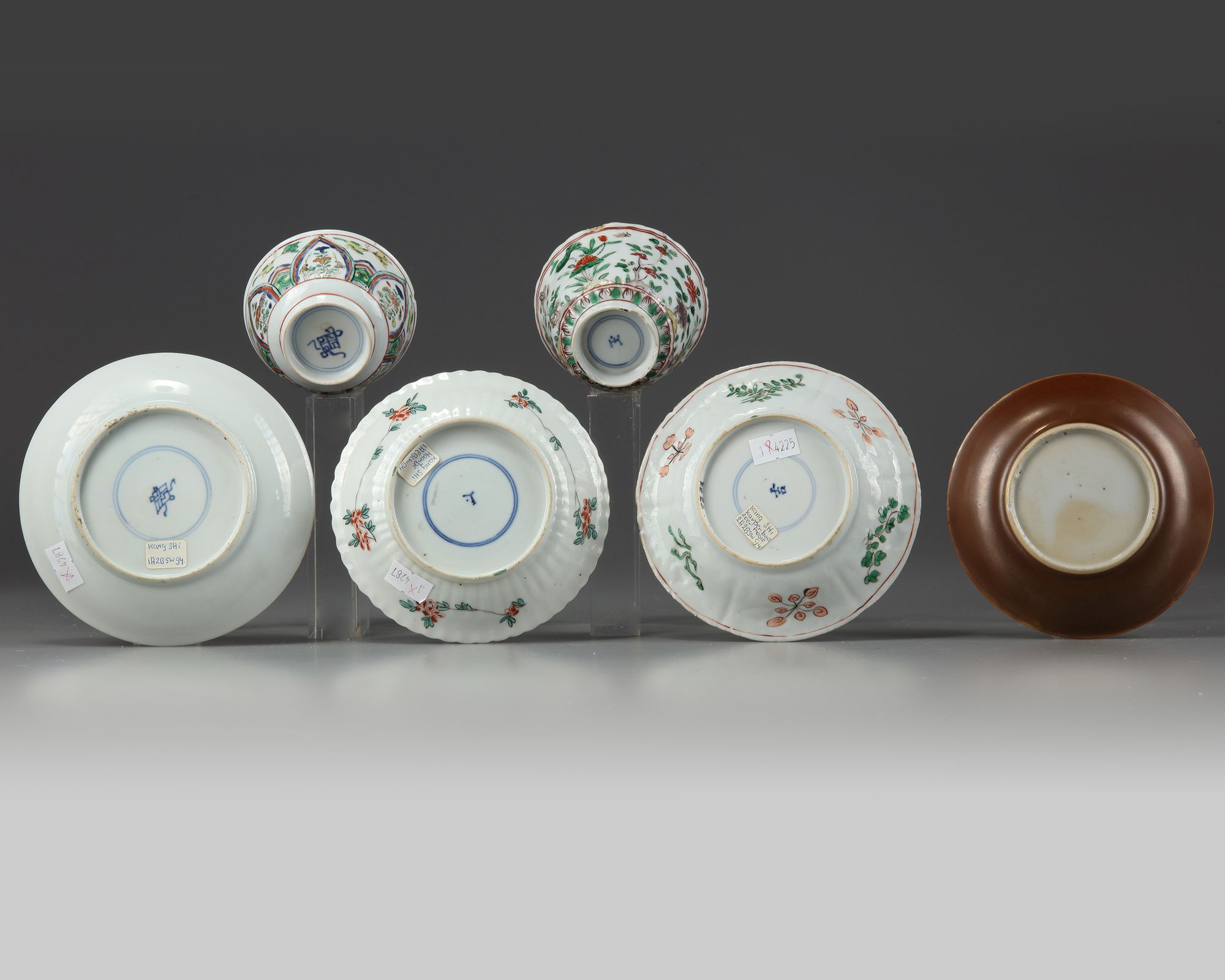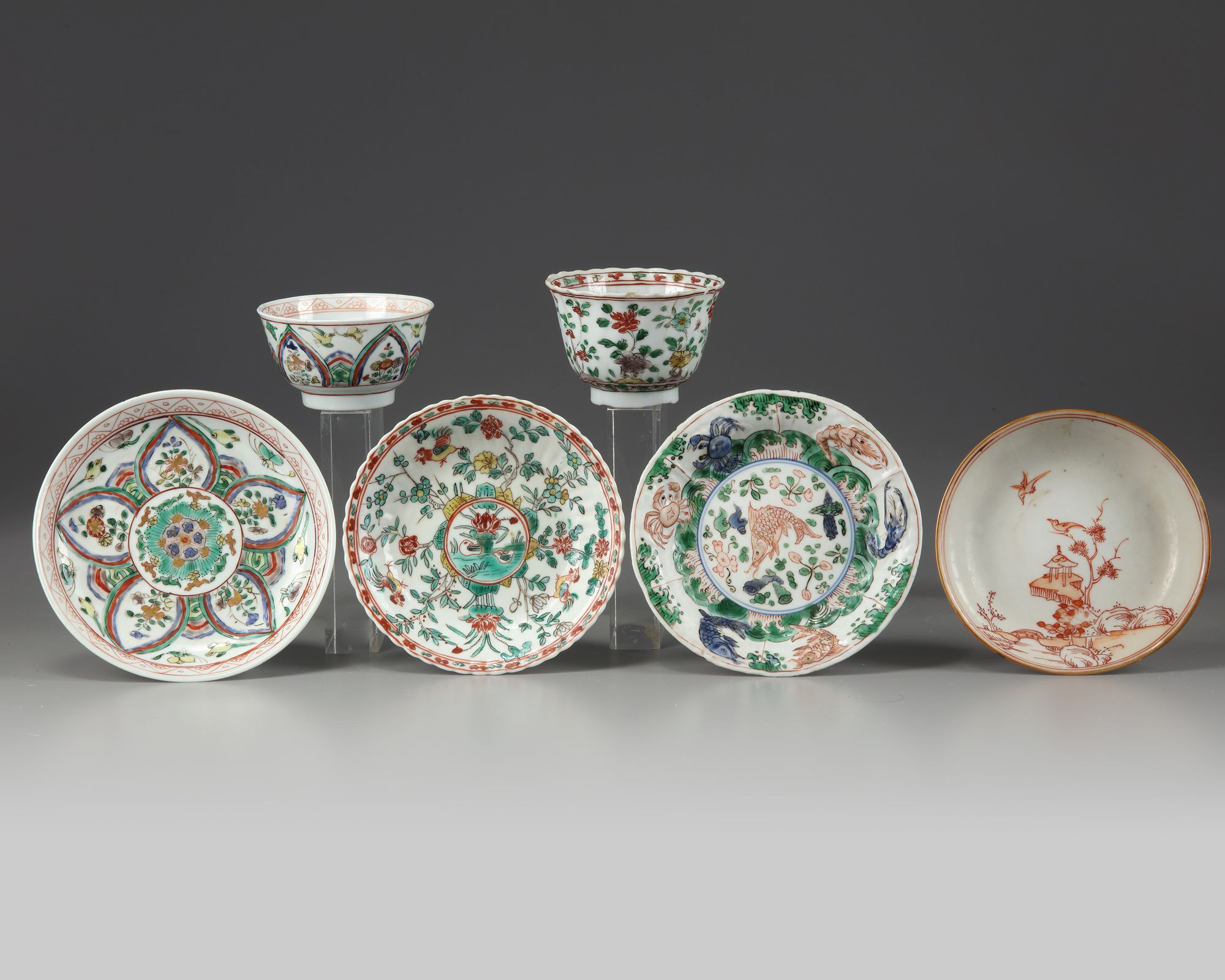 The famille verte ‘lotus petal’ cup and saucer: 8 cm. and 13.5 cm. diam. The famille verte ‘cockerel and lotus’ cup and saucer: 8 cm. and 12.5 cm. diam. The famille verte ‘sea creatures’ saucer: 13 cm. diam. The: iron-red and gilt-decorated café-au-lait-back dish: 11.7 cm. diam.