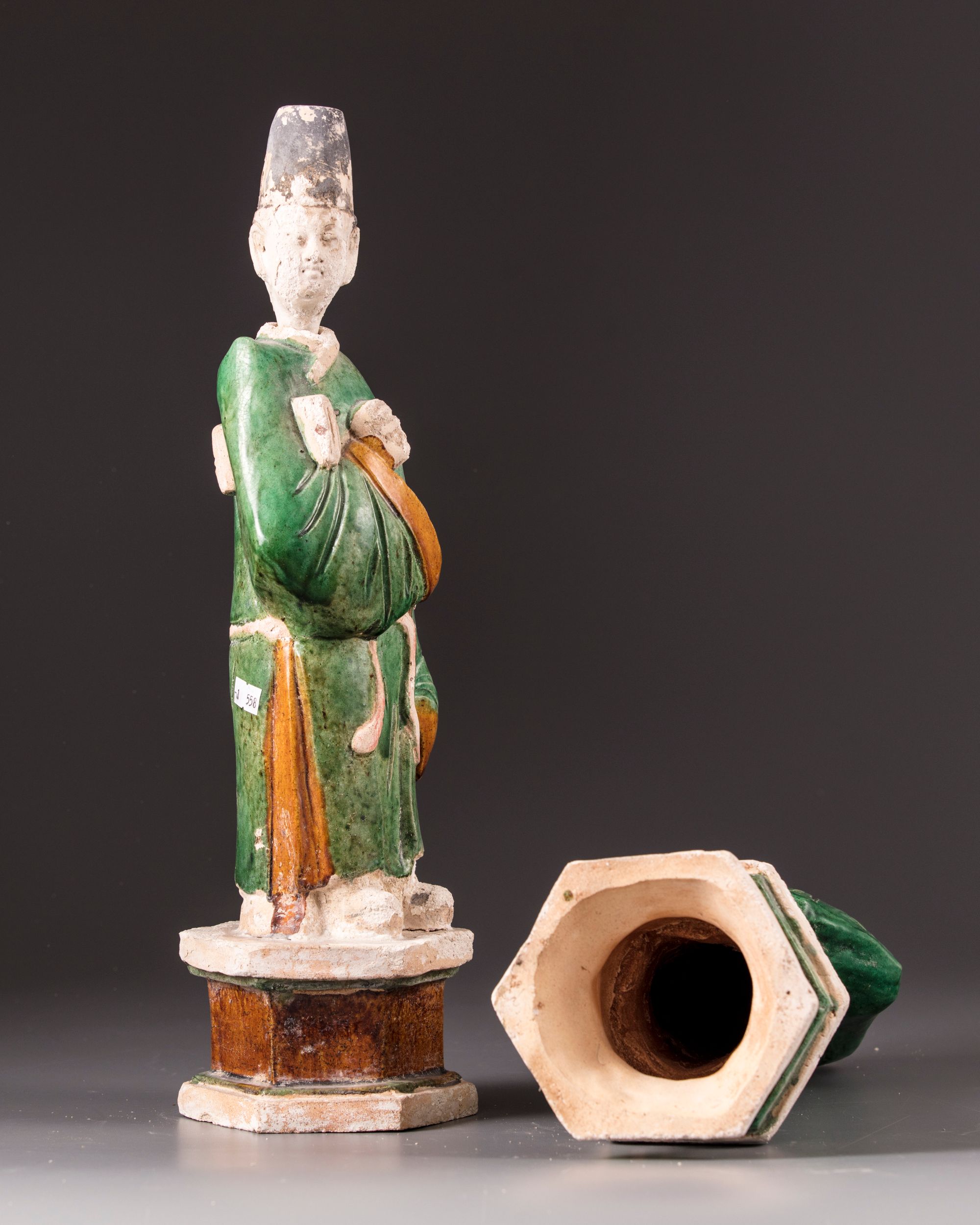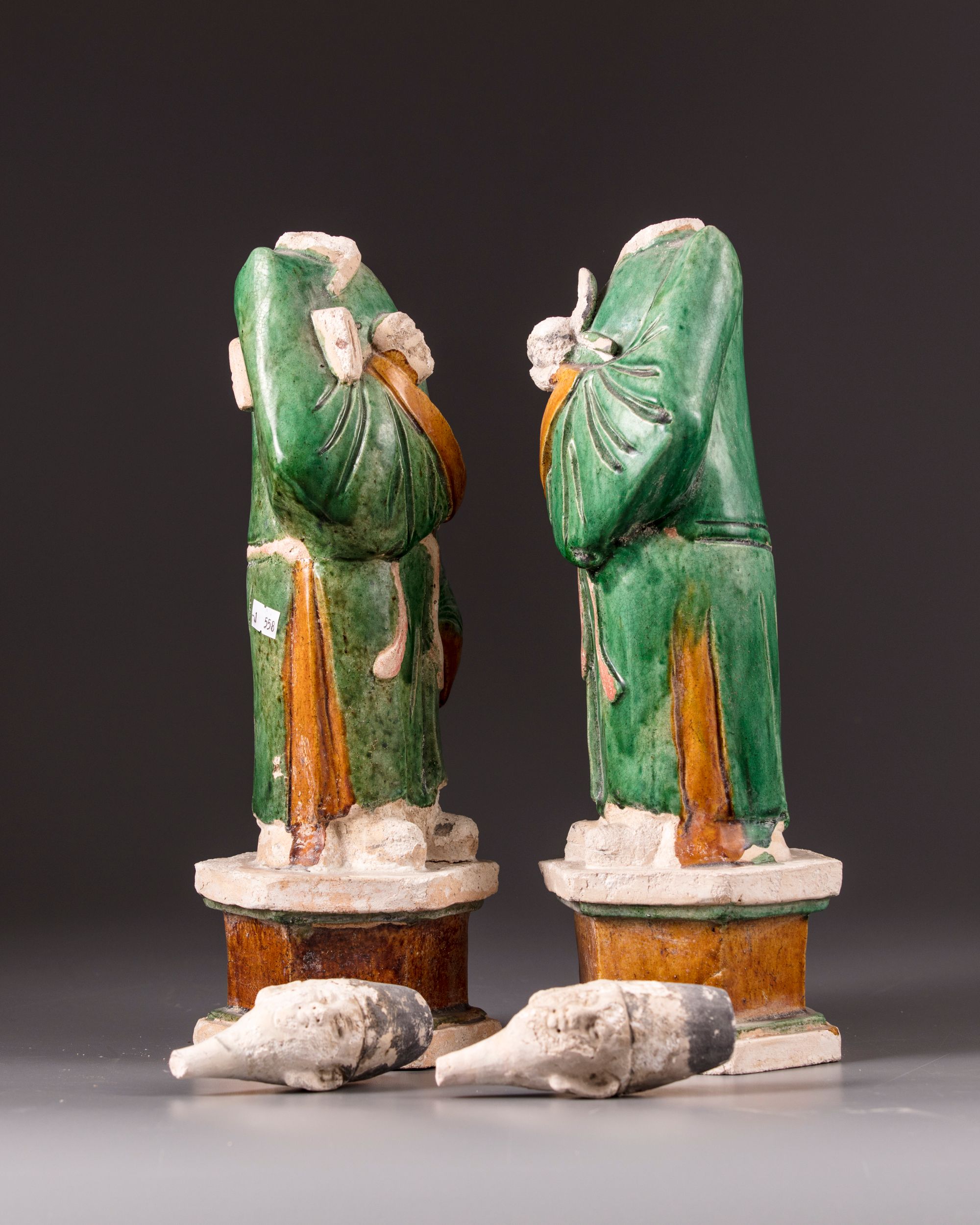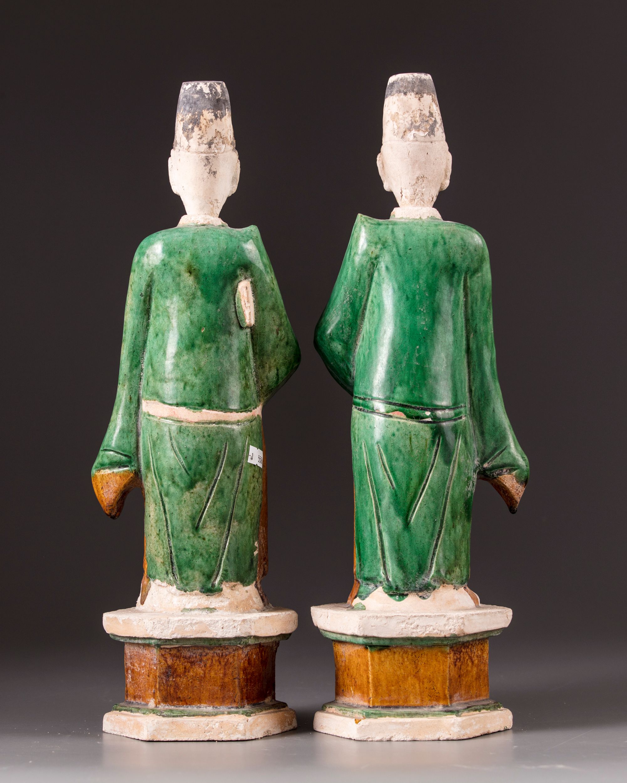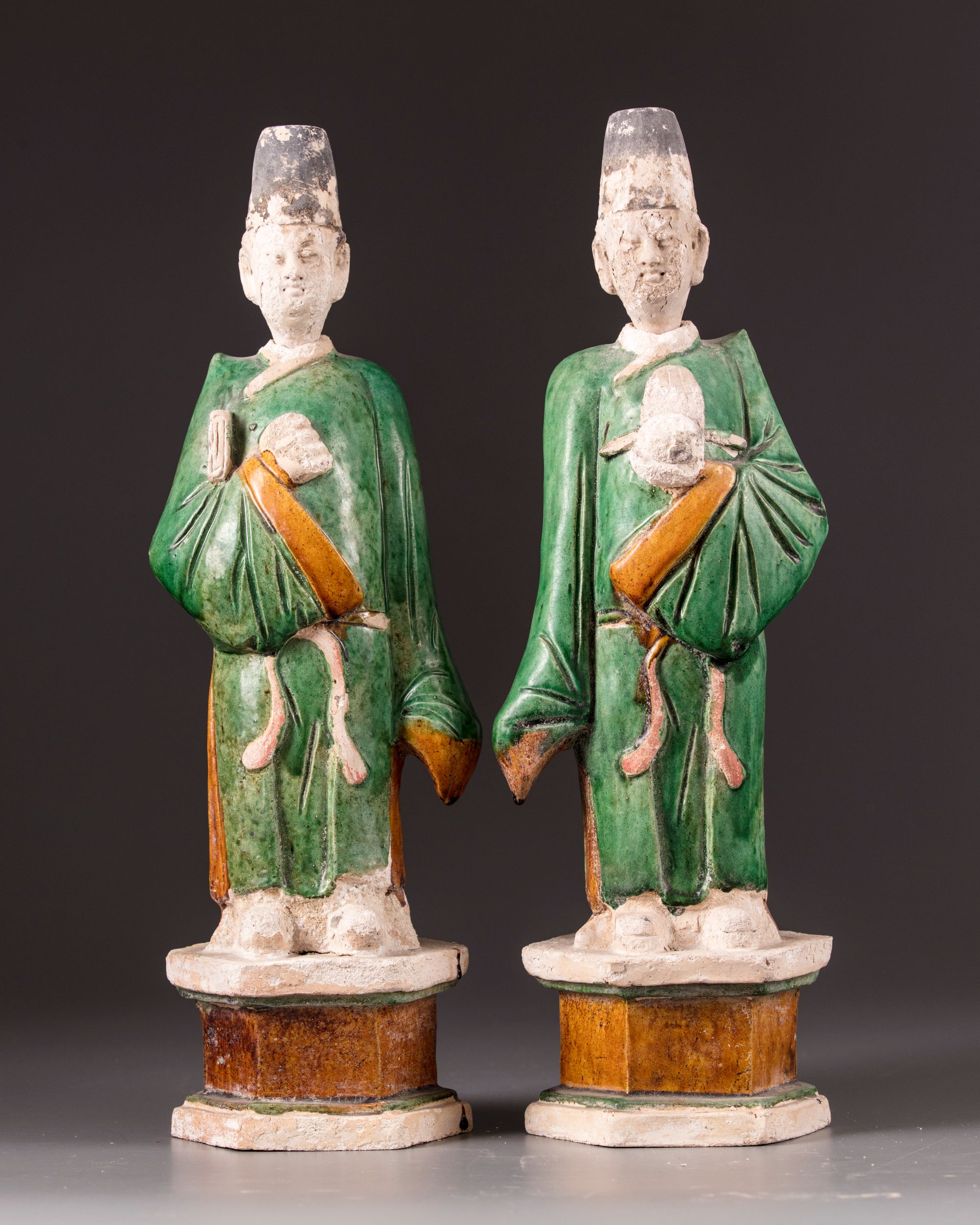 Two Chinese figures in mirror image on a hexagonal stand, dressed in the robes of a scholar which are colored in green and yellow, secured around the waist.