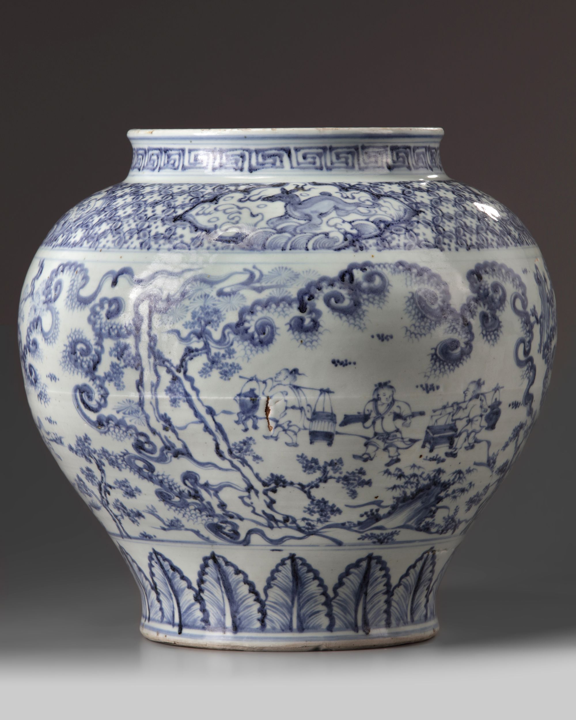 The jar is decorated in a 'windswept' style with scenes of a scholar in a pavilion, scholars on horseback, and three attendants, all below a band of auspicious animals to the shoulder on a geometric ground. The foot is decorated with a band of stiff leaves.