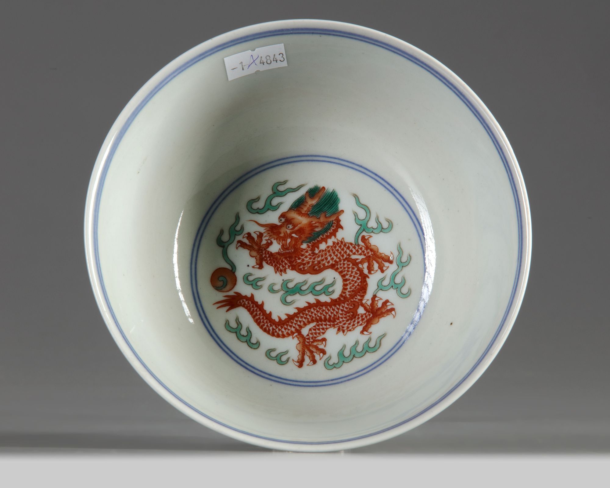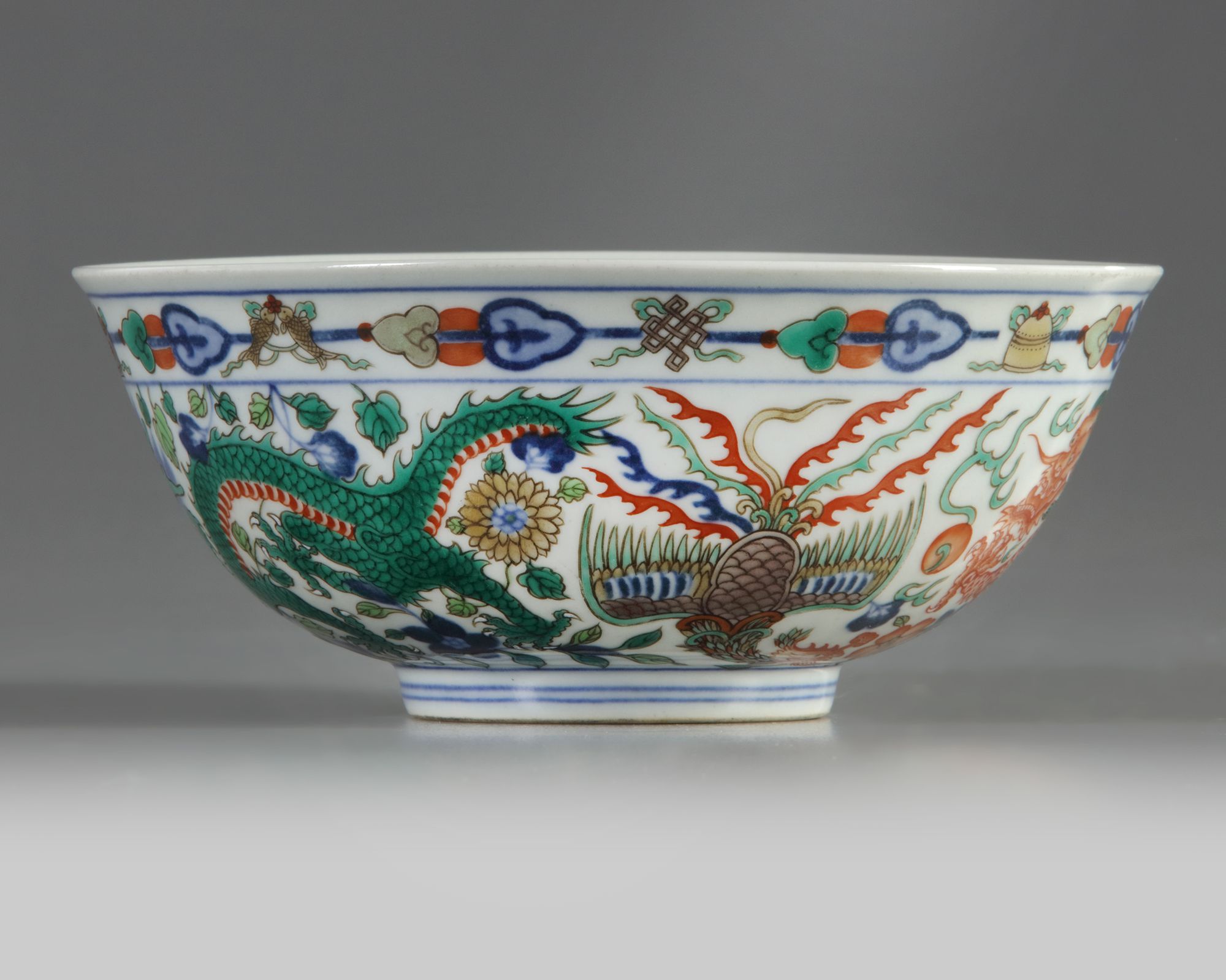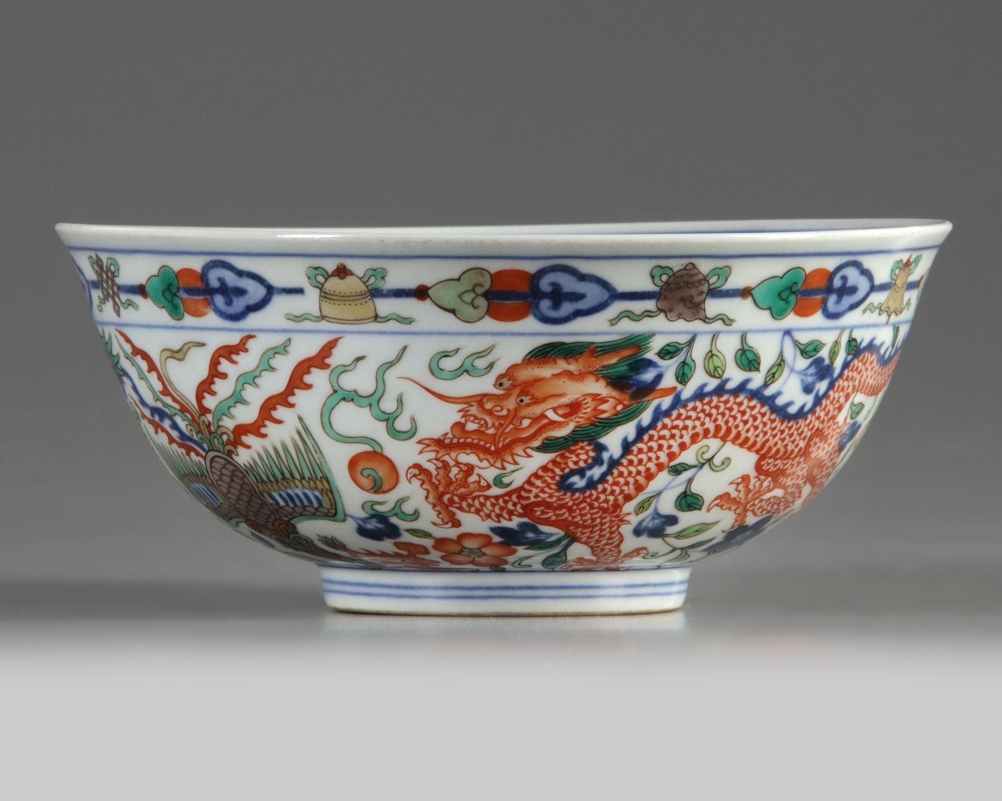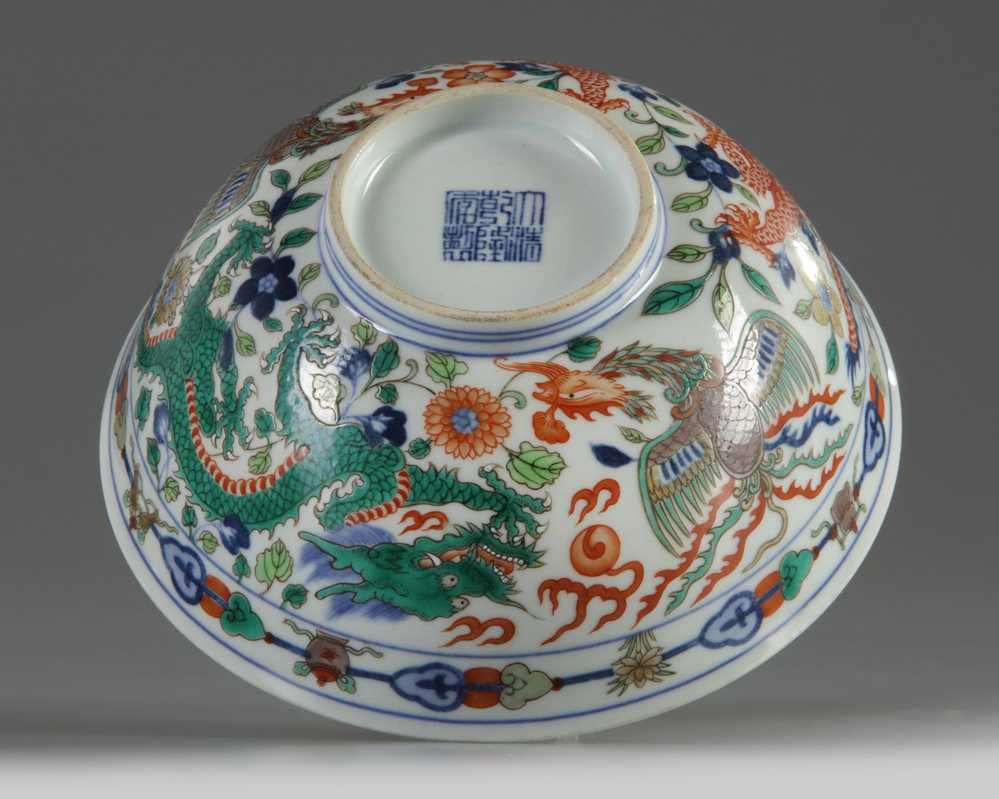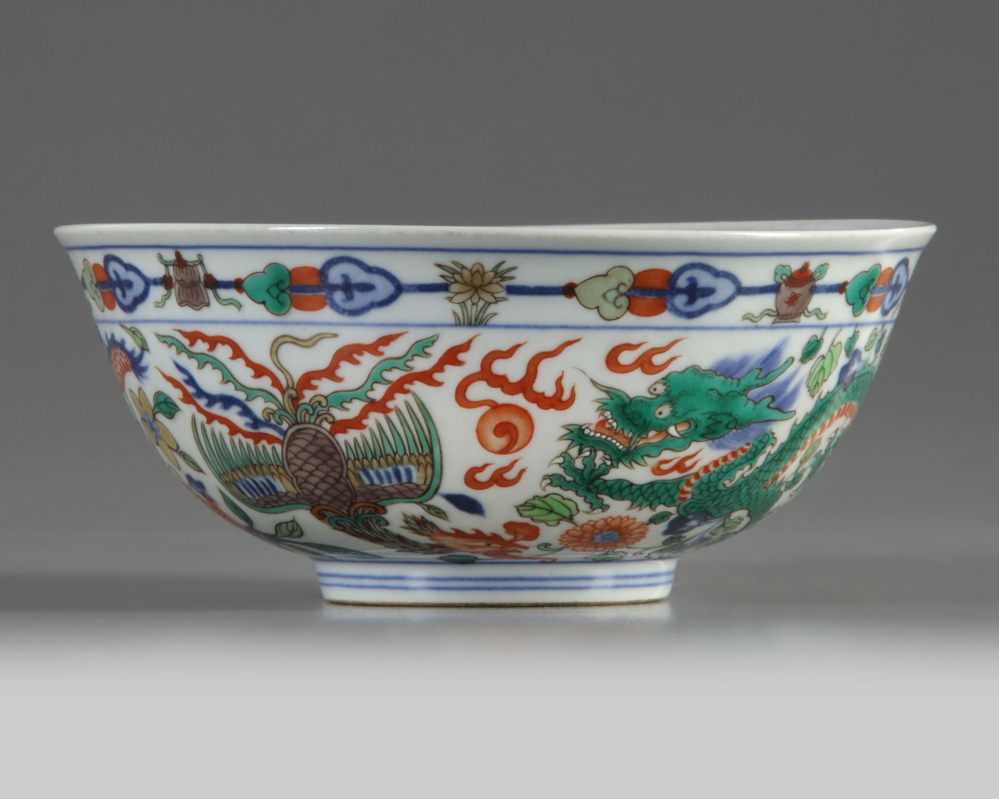 The bowl has deep, rounded sides flaring slightly to the rim, and the exterior is decorated with two phoenix descending between green and iron-red dragons pursuing flaming pearls amidst flower sprigs, below a band of Buddhist Emblems alternating with ruyi heads joined by a blue line. The interior is decorated with a medallion of an iron-red dragon leaping in pursuit of a flaming pearl. The base with an apocryphal Qianlong mark.