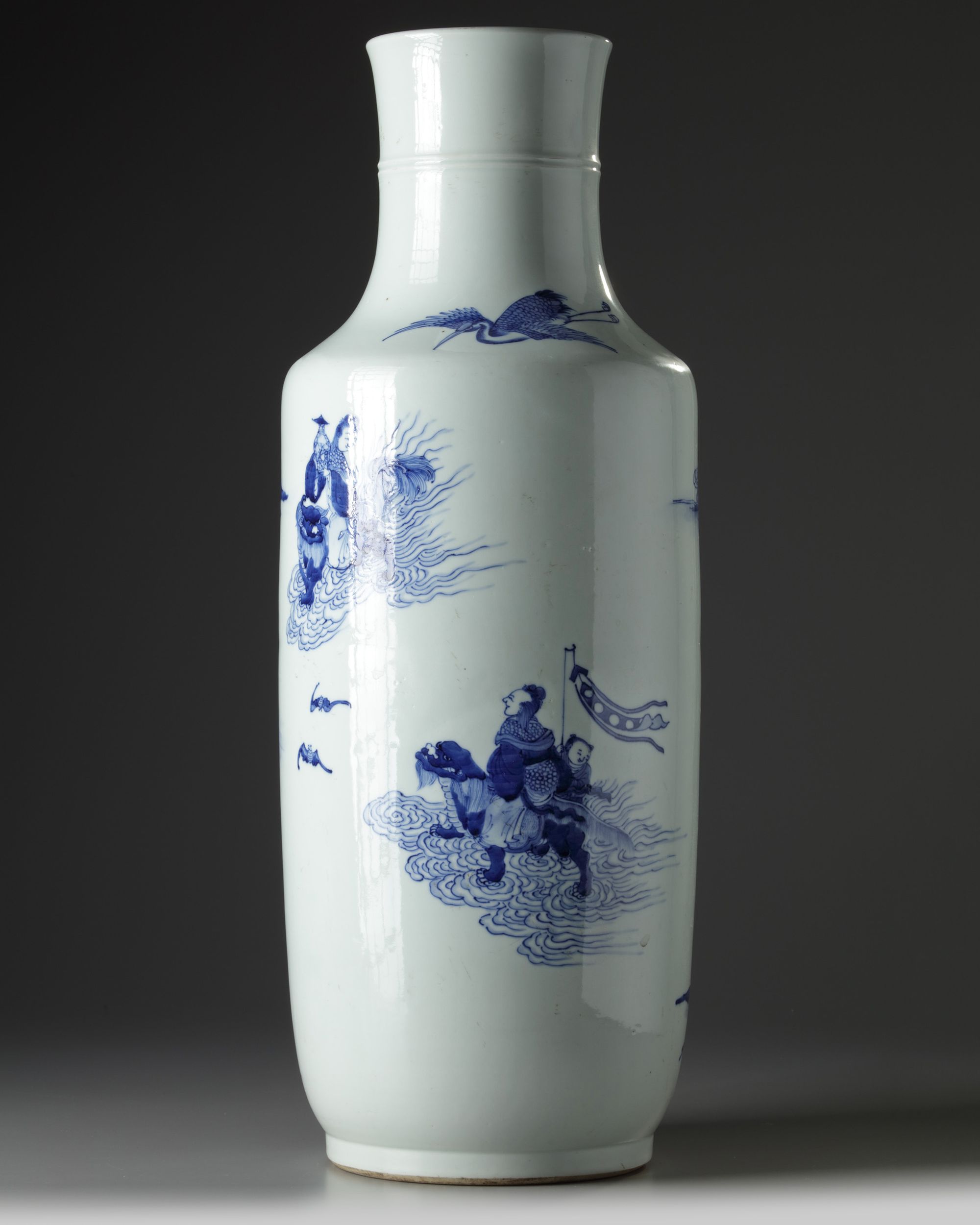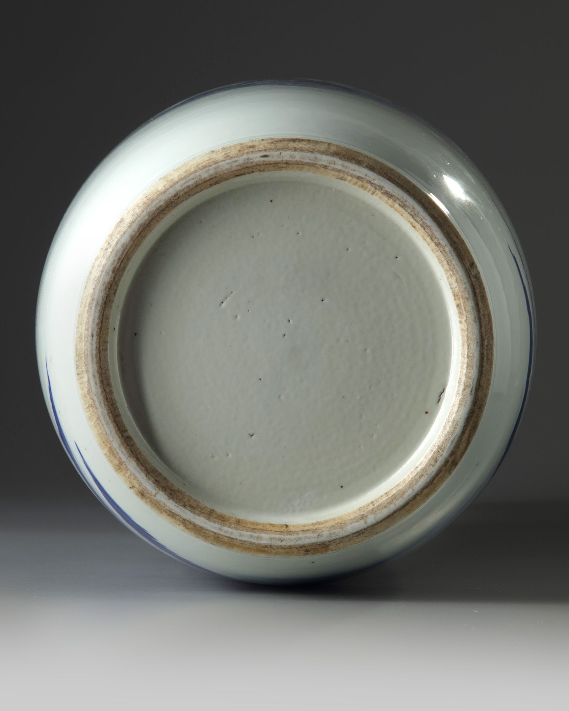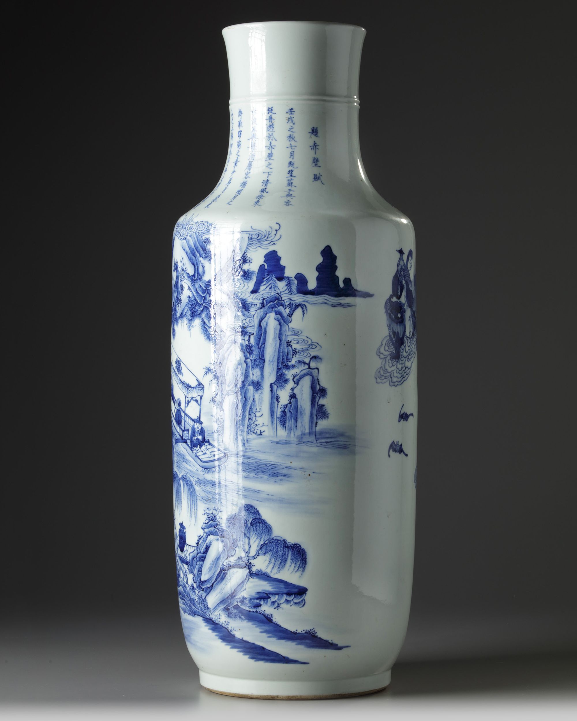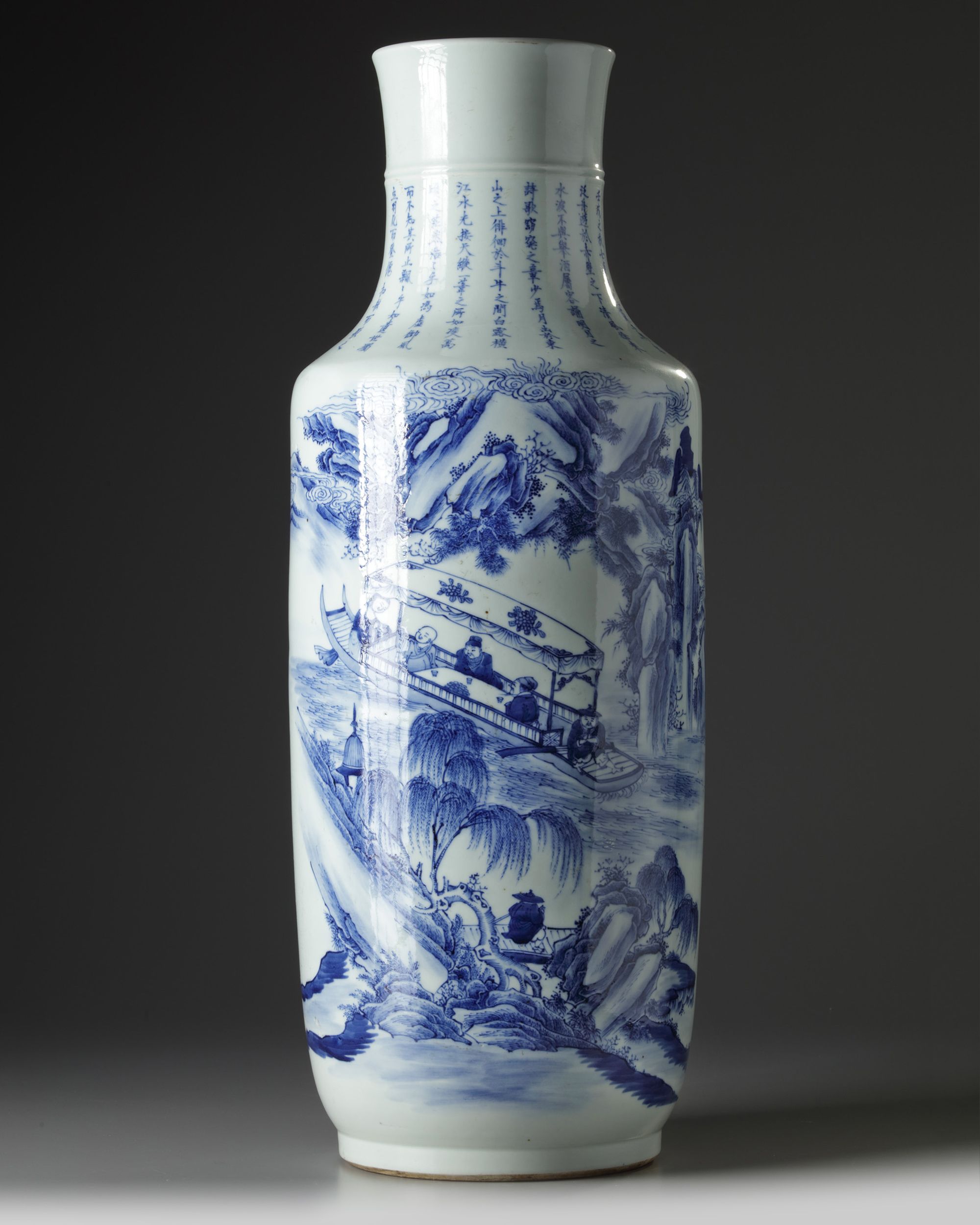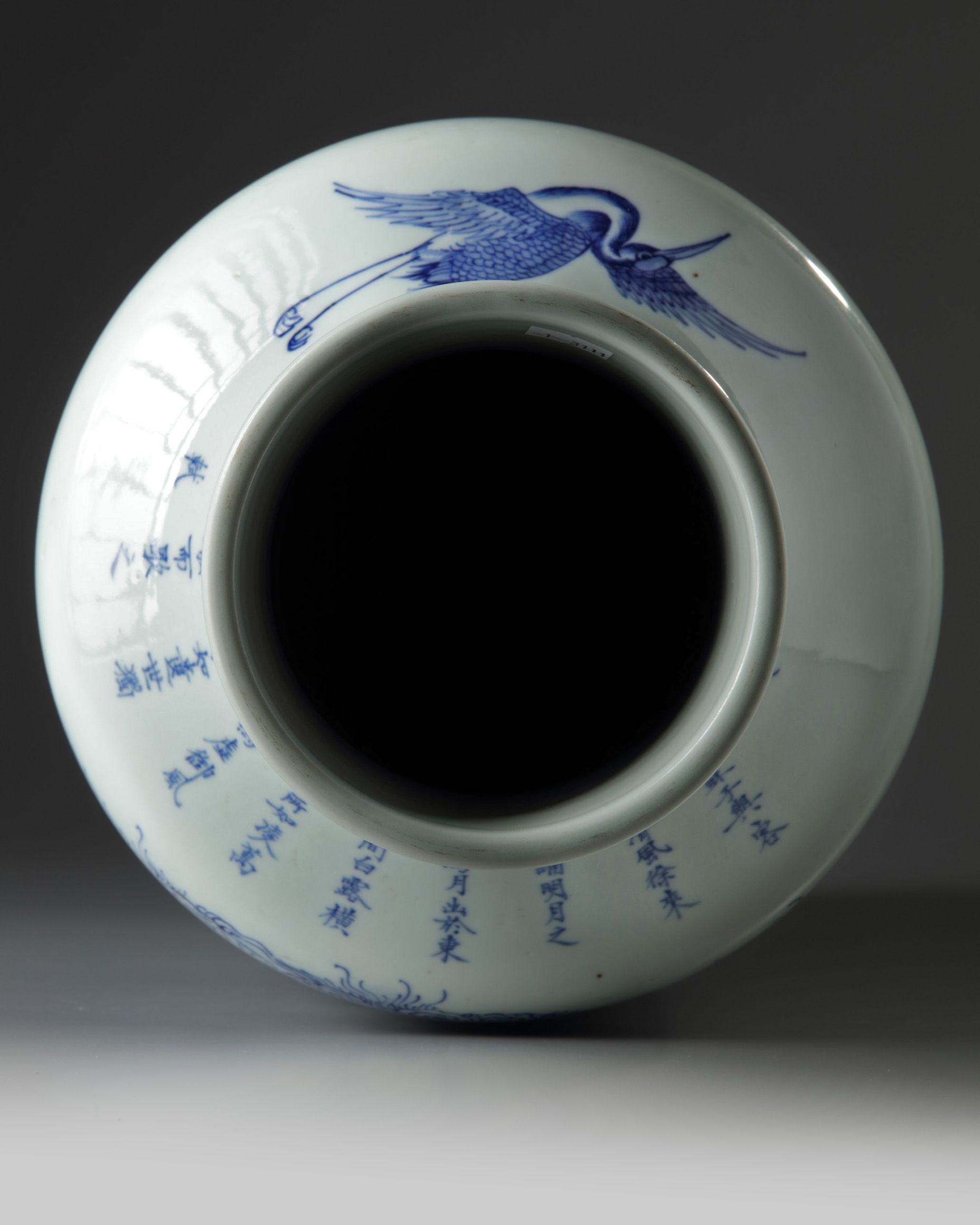 The vase is decorated with a scene from the Ode to the Red Cliff with figures in a boat on a swiftly moving river amongst cliffs, and trees. The reverse is decorated with a lady and a soldier each riding a qilin below a crane in flight. The neck is decorated with an excerpt from the story, entitled 'Ti Chibi fu', and with the signature of 'Su Shi', the Song writer.
