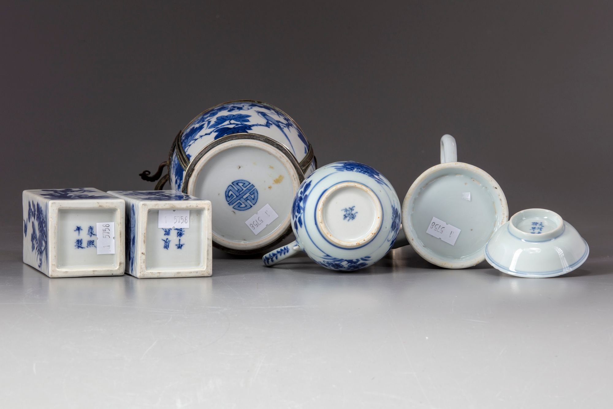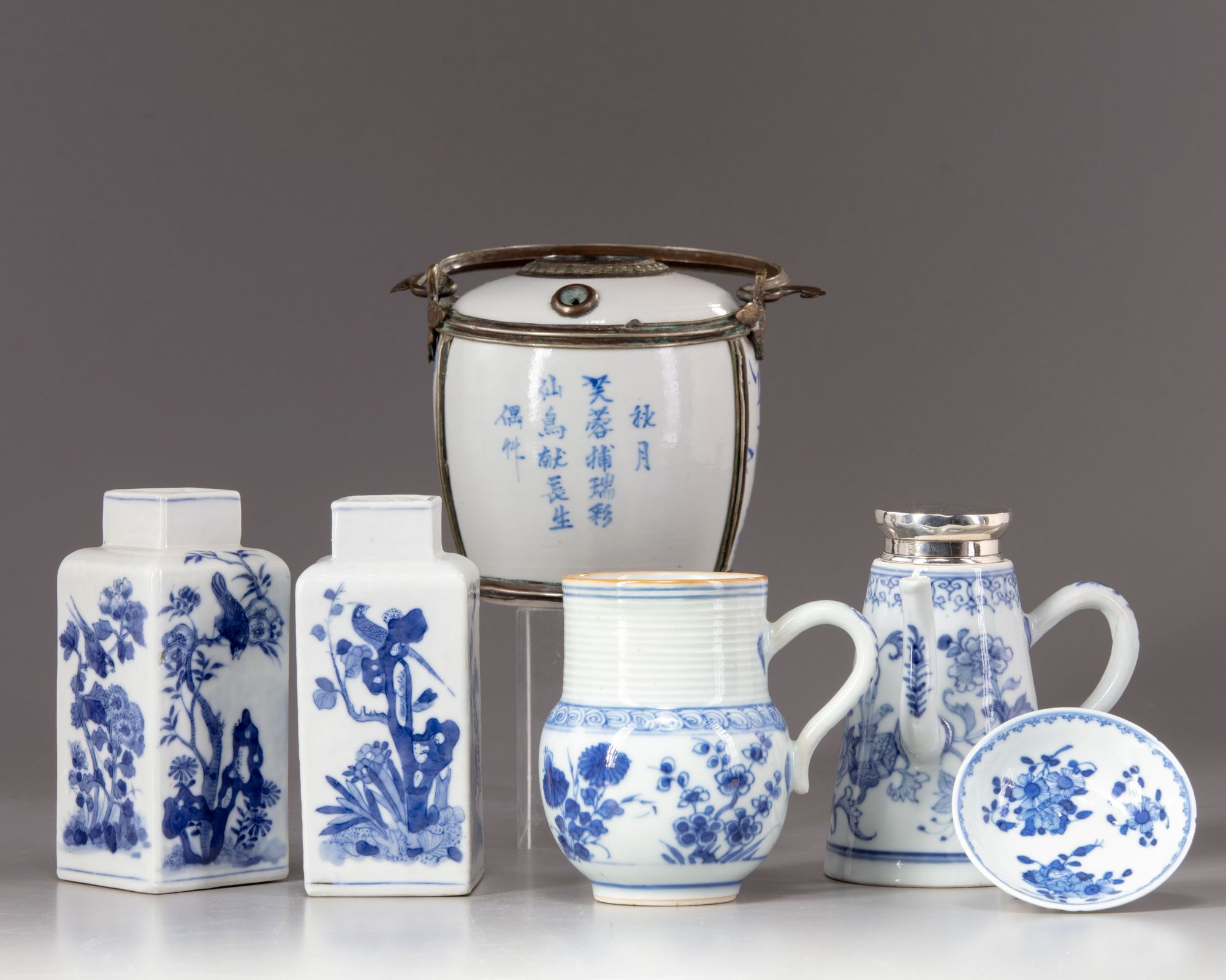 A lot of blue and white items contains: -Two Chinese vases, decorated to each side with a bird perched on a flowering branch growing from ornamental rocks with a Kangxi mark to the bottom. - Two Chinese jug decorated with flowers. - A small Chinese porcelain dish decorated with flowers. - A Chinese porcelain jar, decorated with a bird perched amongst flowers with Chinese inscriptions to the reverse.