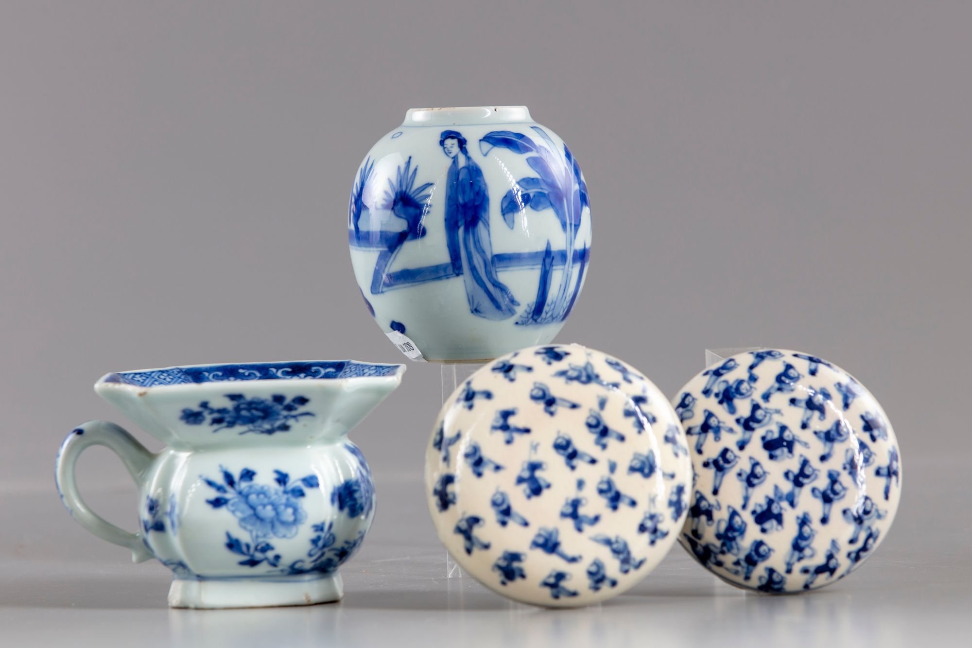 Two Chinese blue and white circular boxes with covers, decorated in cobalt-blue with "Hundered boys" on a white cream crackled ground. The bottom with a Chinese Kangxi six character mark within a double circle, Marked and of the Kangxi period. A Chinese blue and white jar, decorated with ladies beside a plantain tree and a table, a boy at play " Lange lijs en zotje". The bottom with an artemisia leaf mark, H: 9,5 cm . A Chinese porcelain spittoon with an incised base, everted rim and a handle, decorated in cobalt-blue with a one tree and flowering branches. H: 8 CM