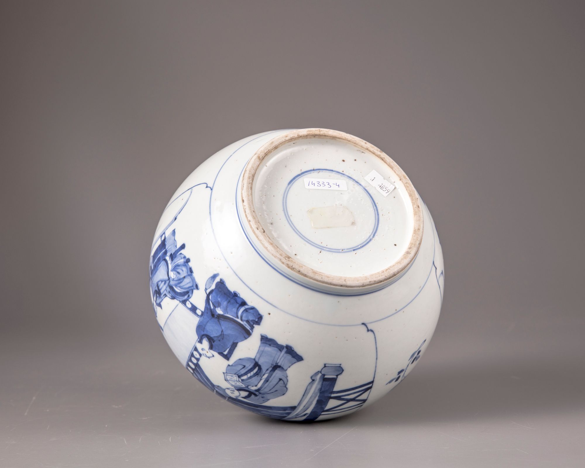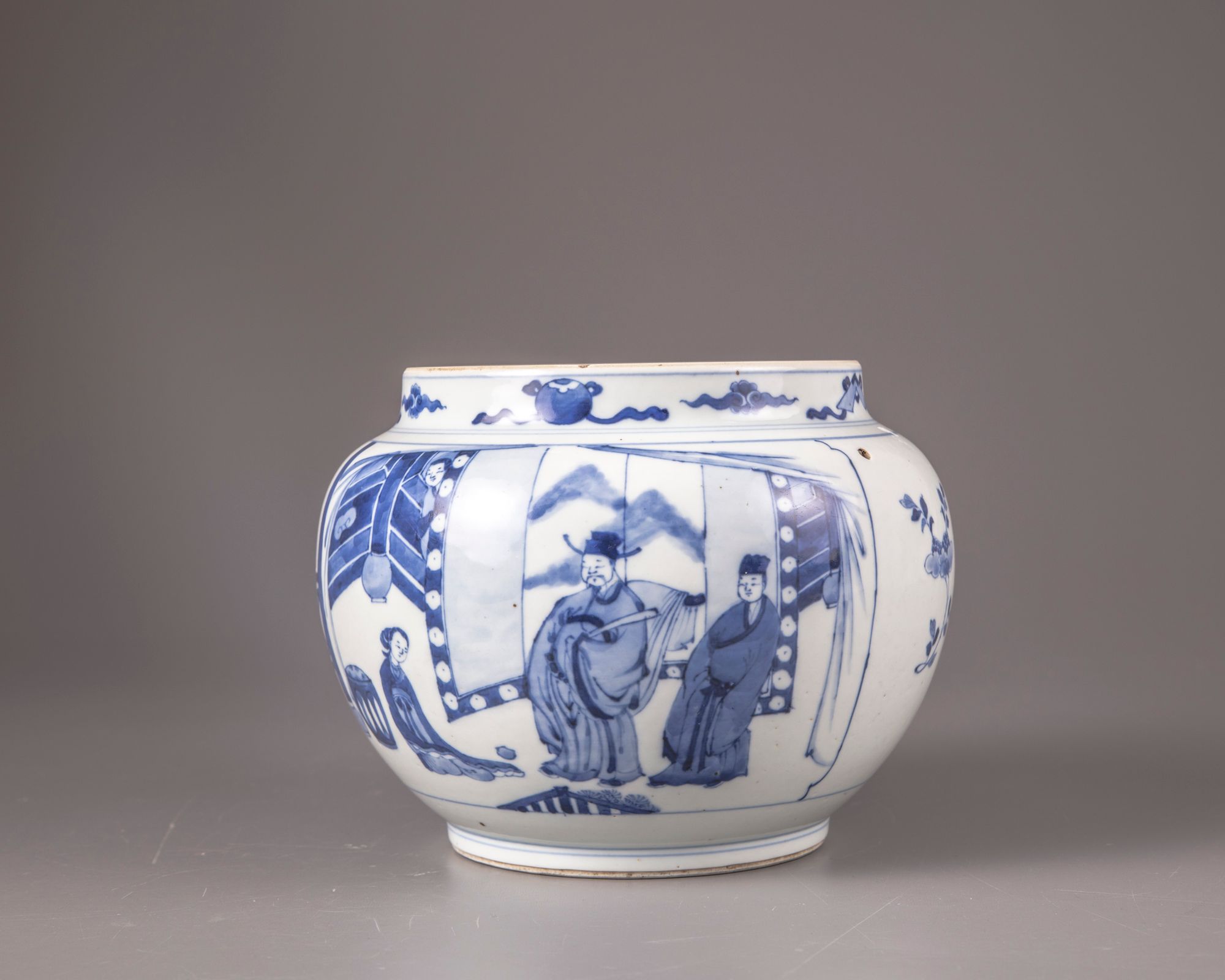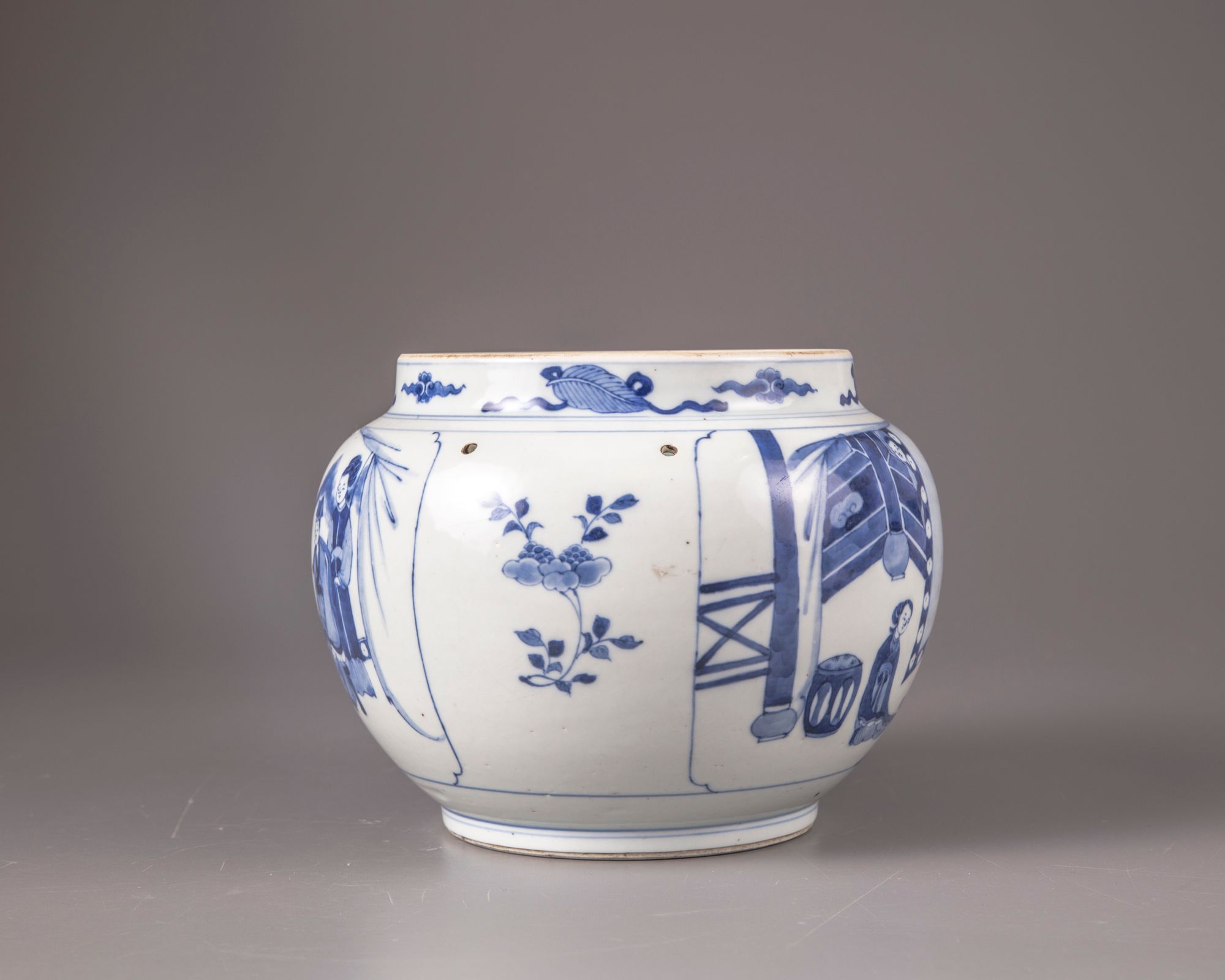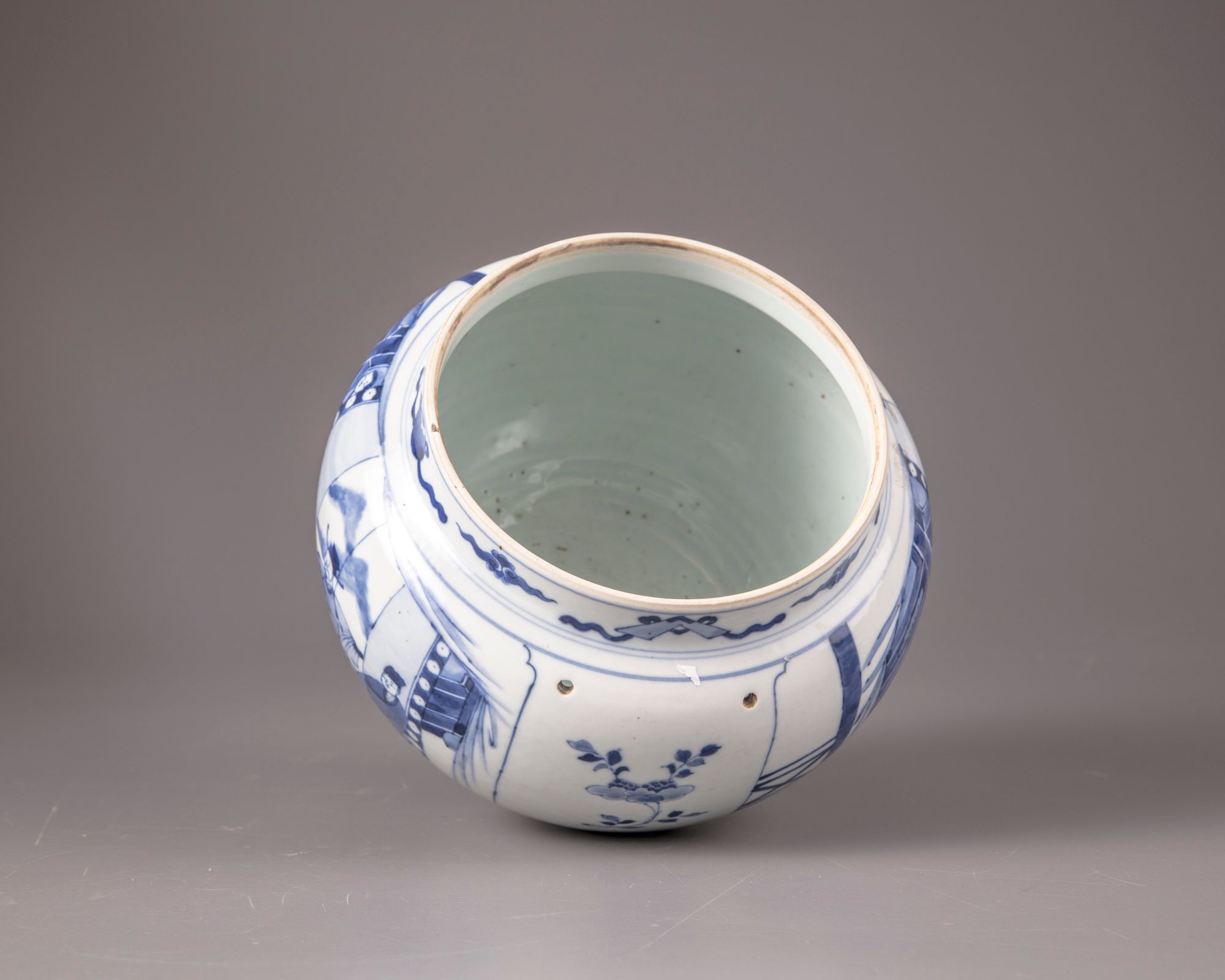 The potiche is decorated with two panels separated by peonies. Each panel is showing scenes with scholar, dignitary and attendant in pagoda setting. The neck is decorated with four auspicious emblems including: pearl, mirror, musical jade stone gong and artemisia leaf, all separated by clouds. Opposite of each other and in between the panels two pairs of holes are drilled before the glazing process. Double circle to the base.