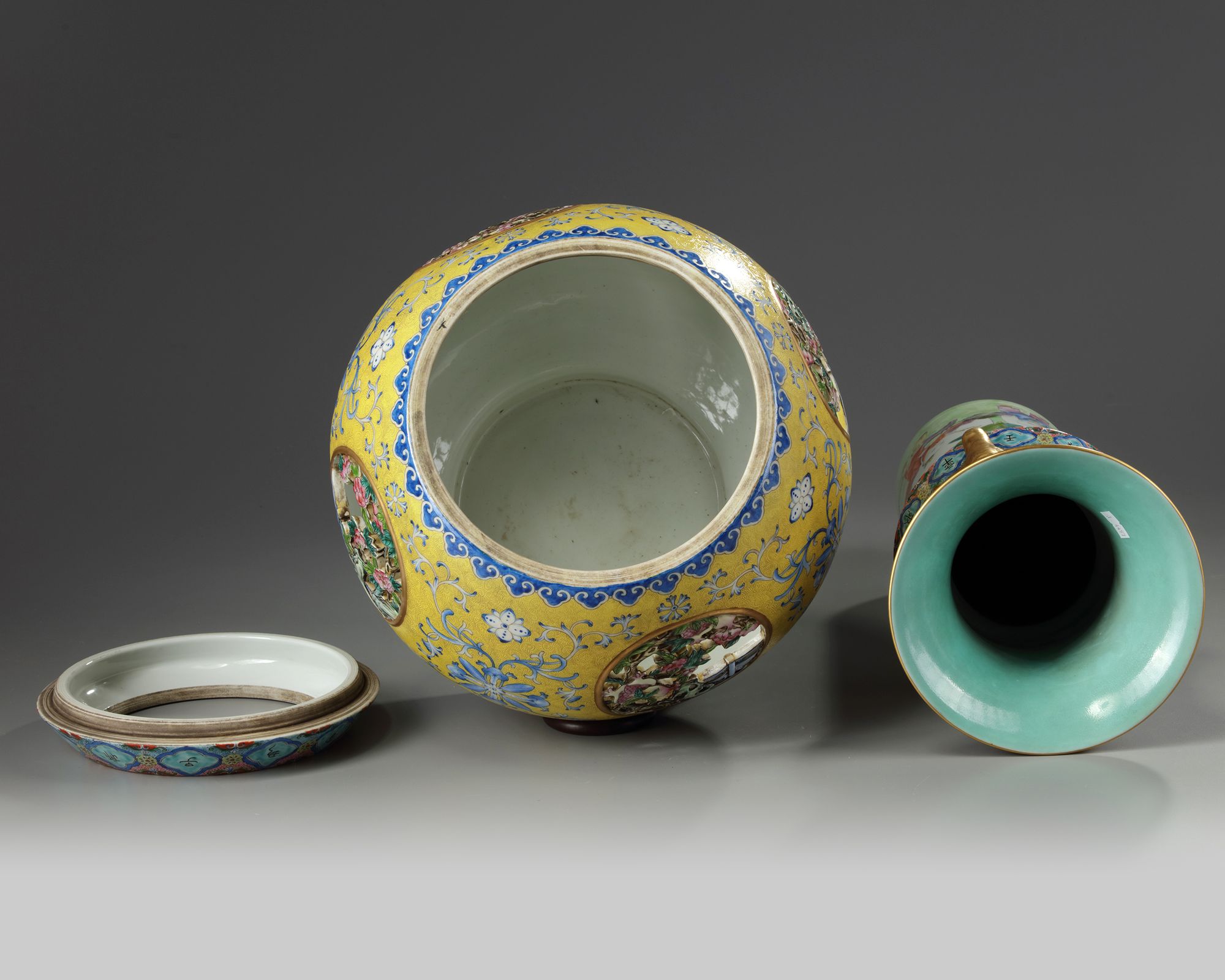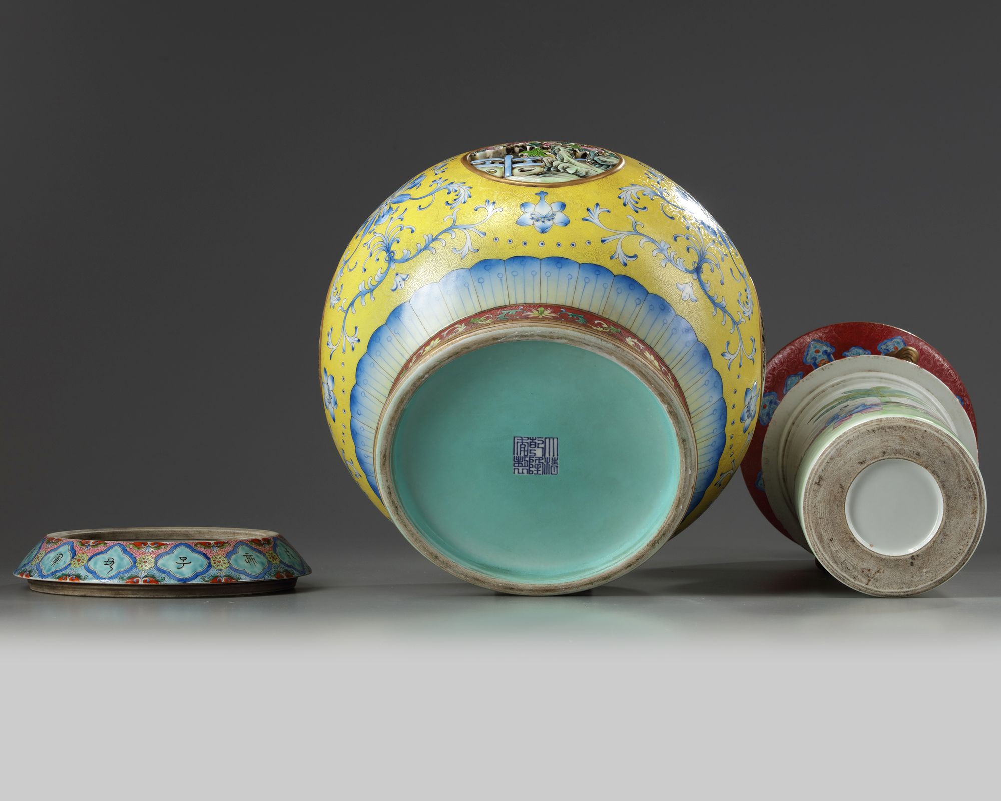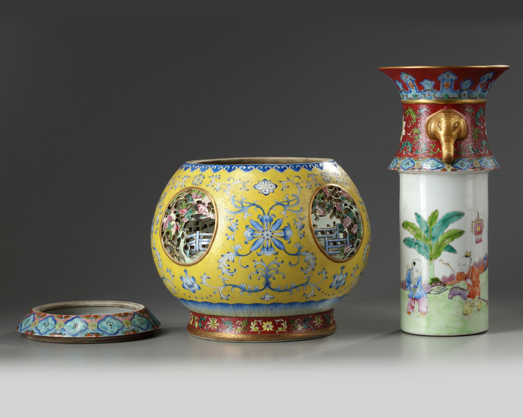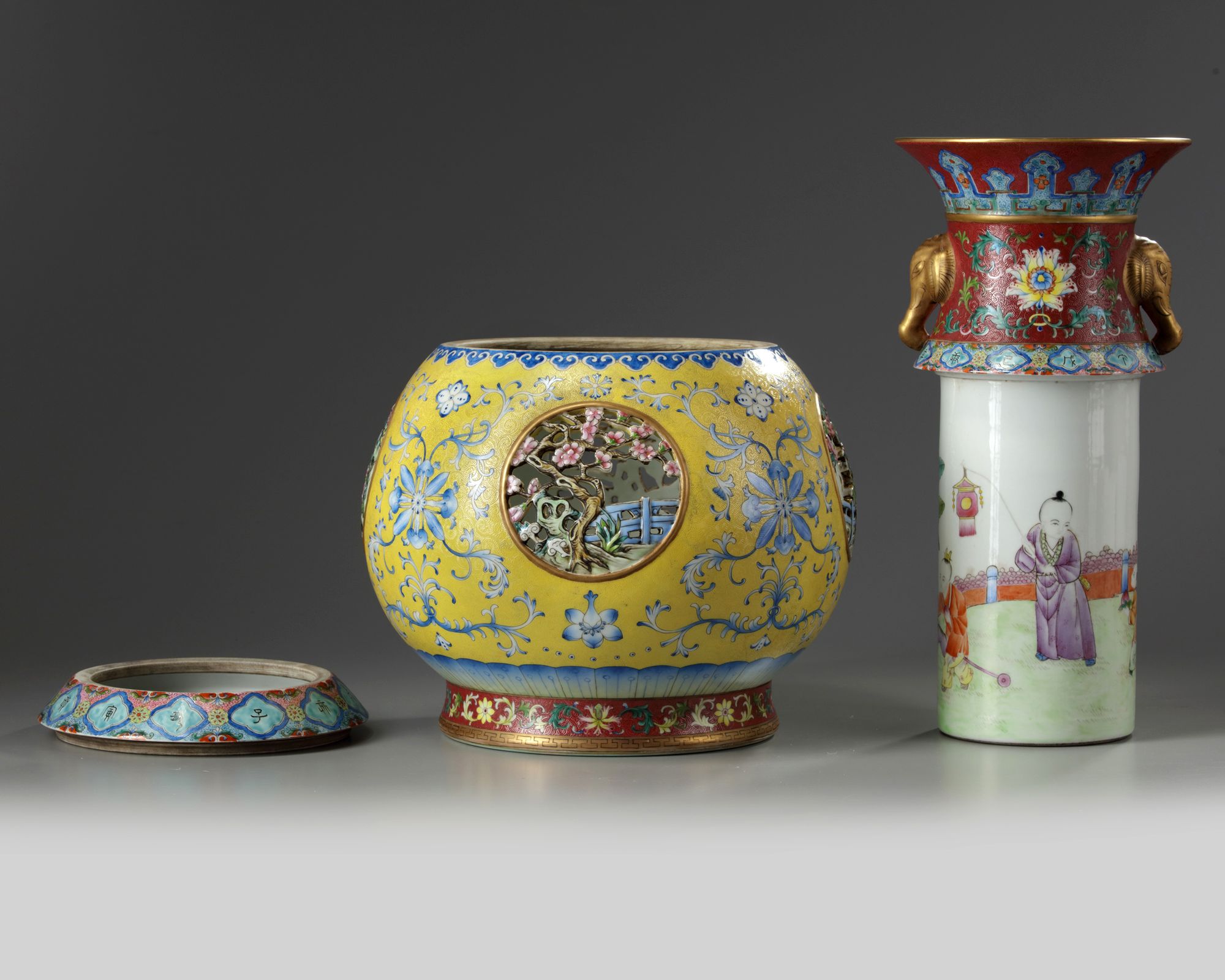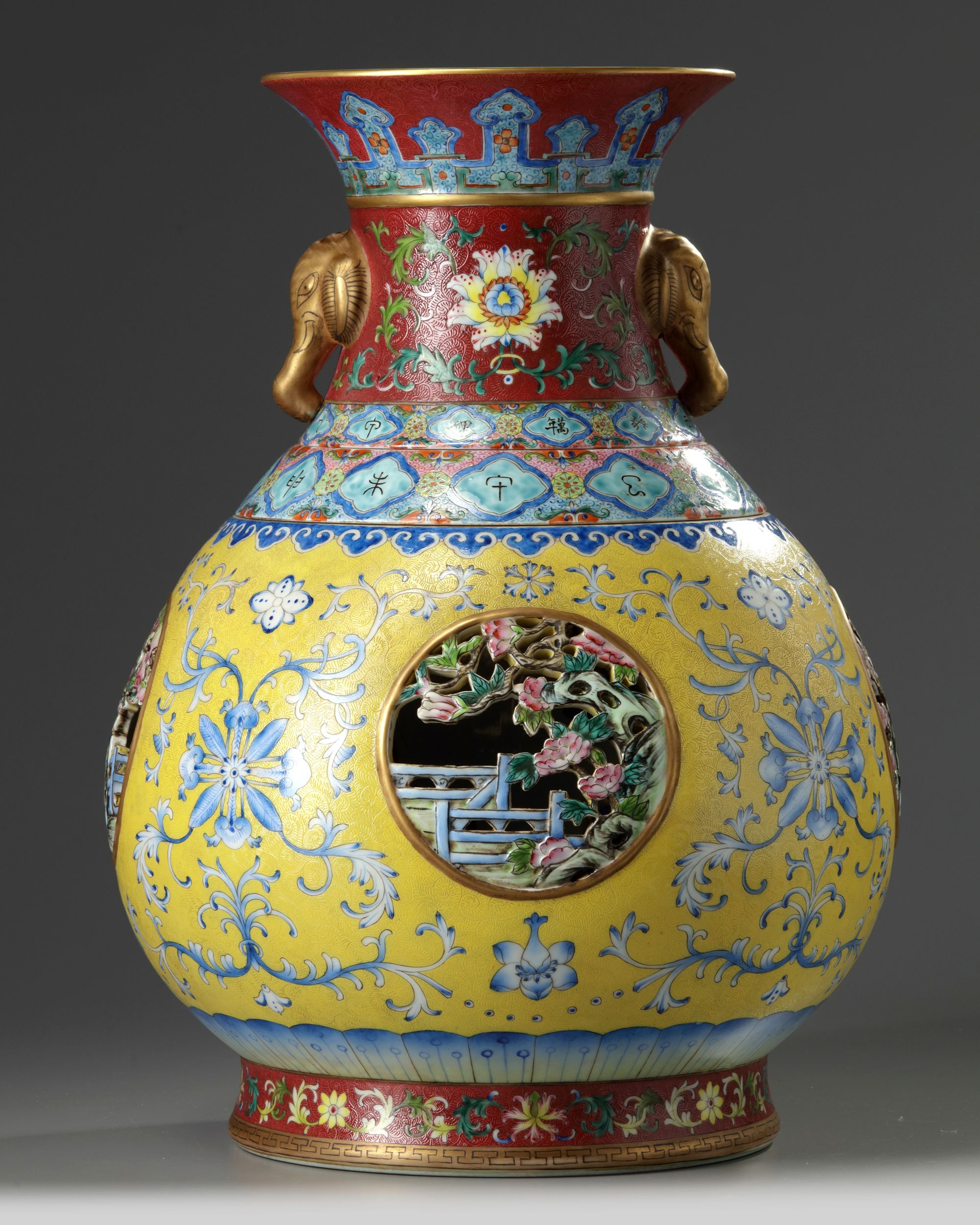The vase is composed of three sections - the body is decorated with four pierced medallions enclosing peony, pomegranate, prunus, and roses, all on a yellow sgraffiato ground of lotus sprays. The collar and the lower rim of the neck section are encircled with the Twelve Heavenly Stems and the Twelve Earthly Branches. The uppermost removable section is decorated with two gilt elephant-head handles and the interior section is decorated with boys at play. 42.8 cm.