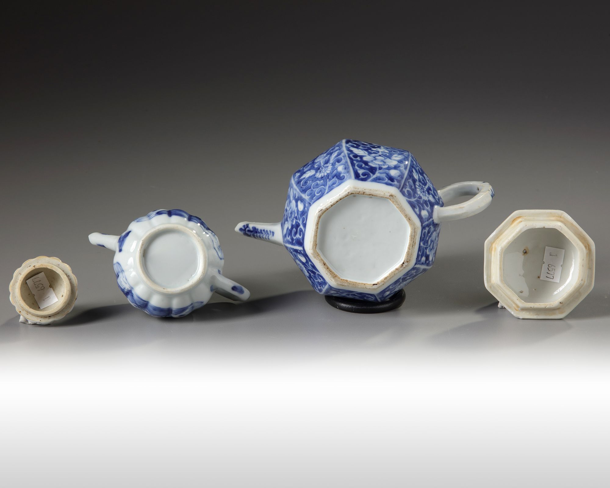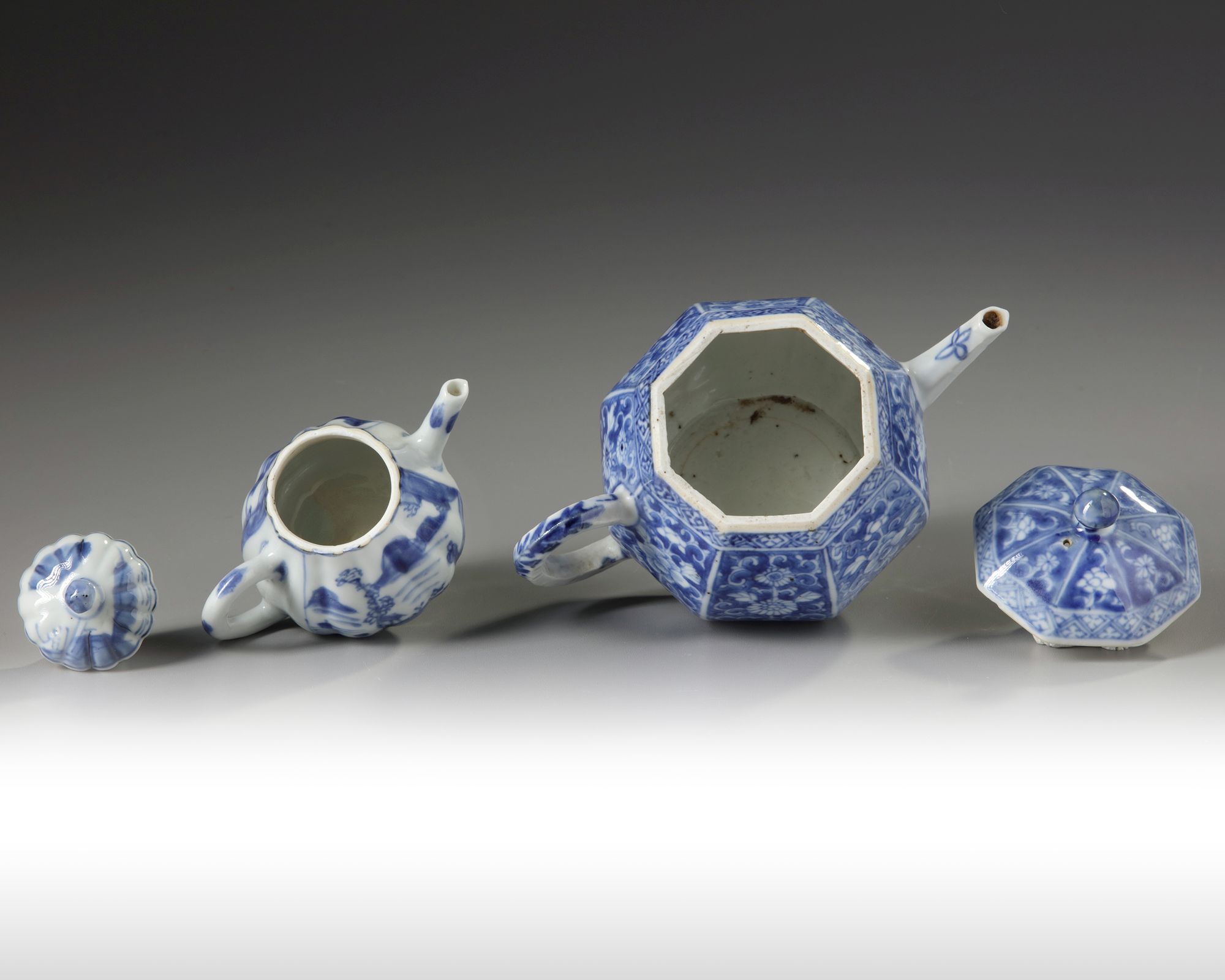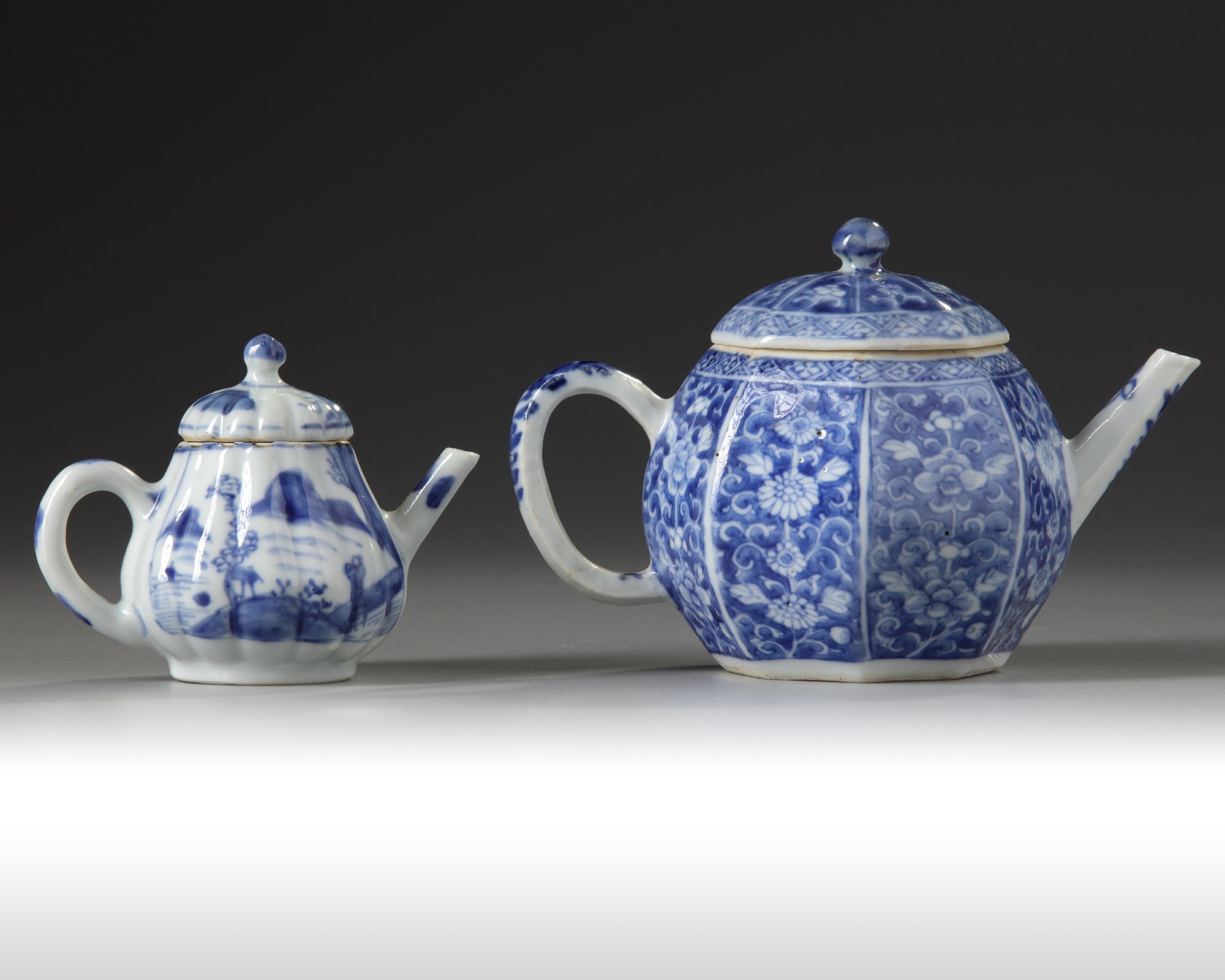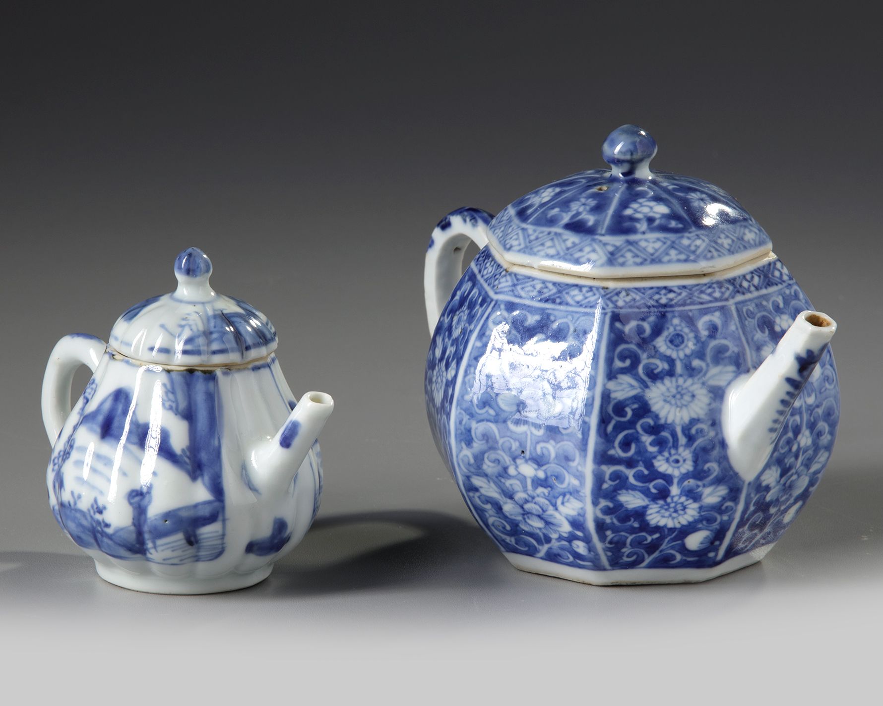 One teapot is an octagonal teapot with a straight spout, each side panel is decorated with a flower scroll in reserve. The other teapot is of small lobed form decorated to each side with a panel enclosing a landscape scene.