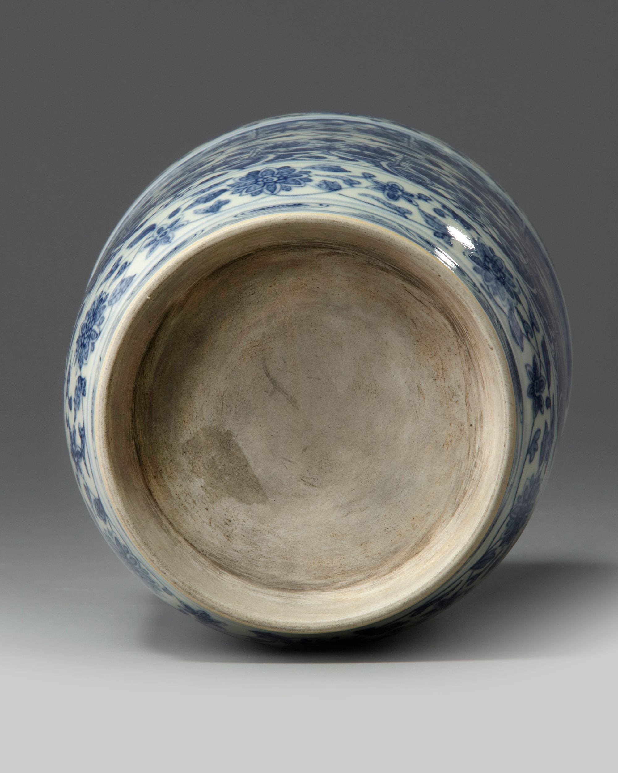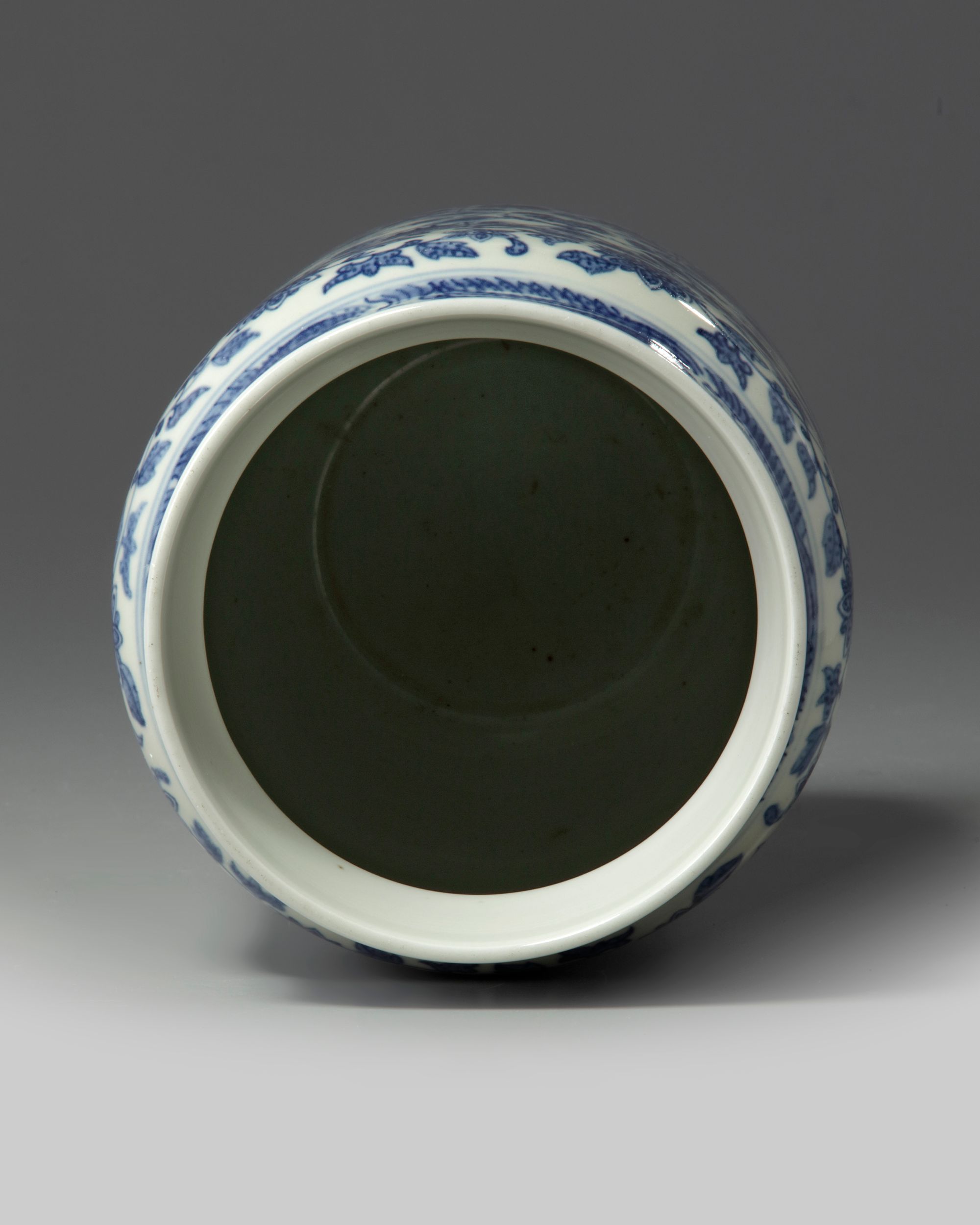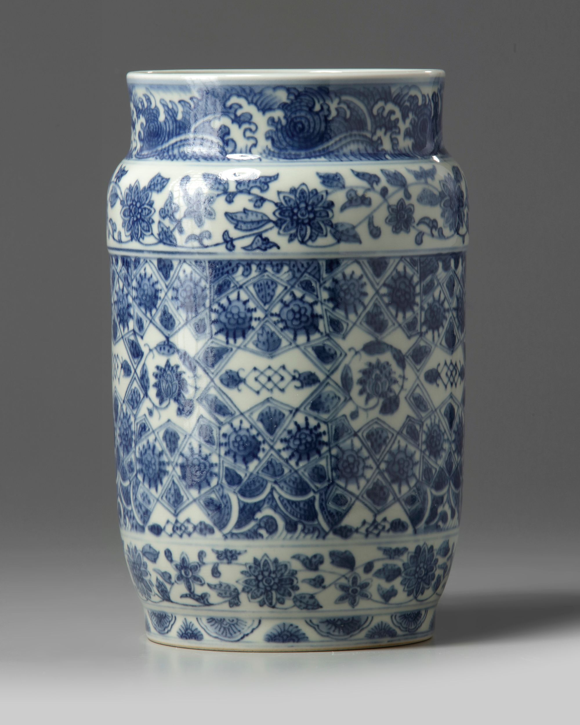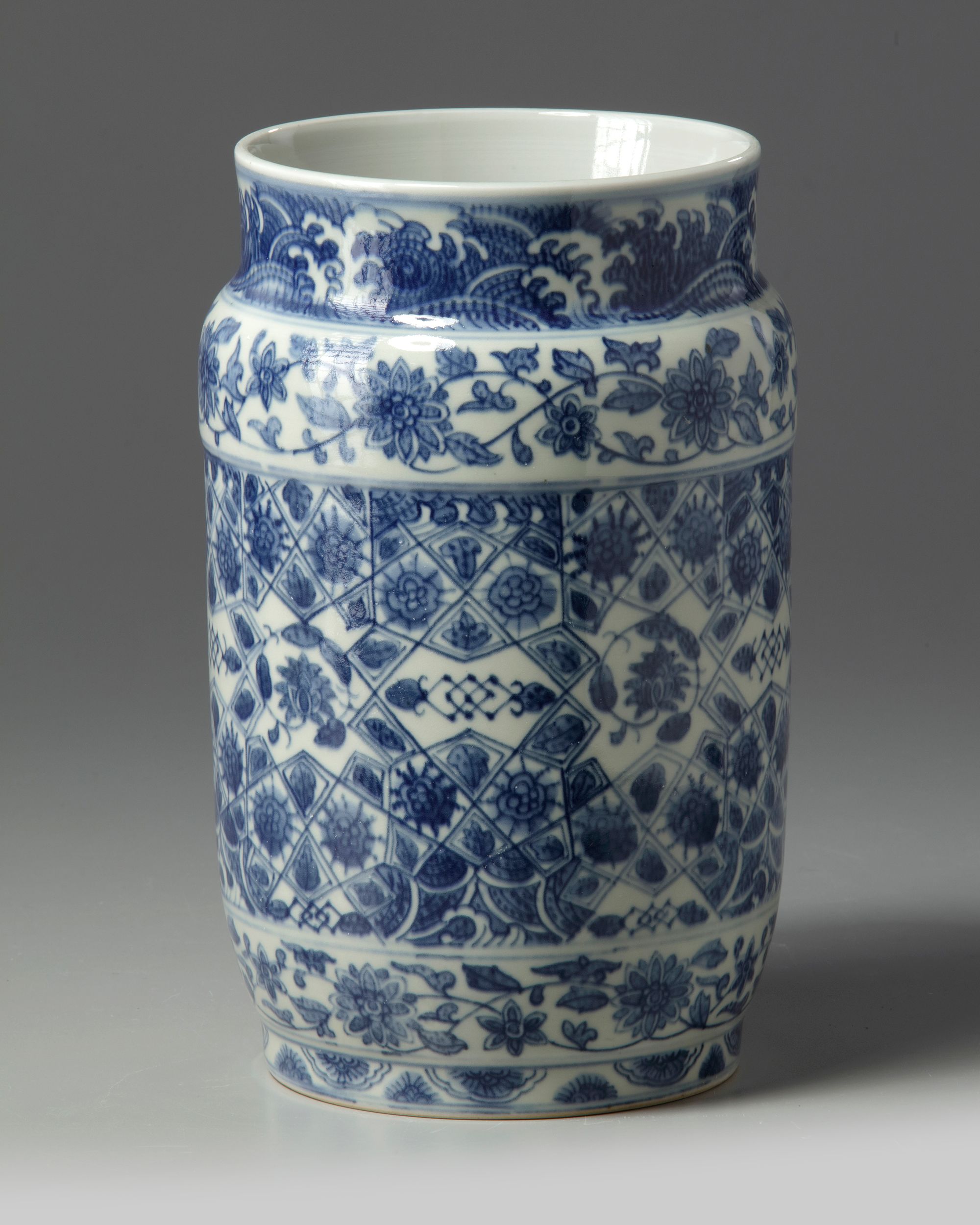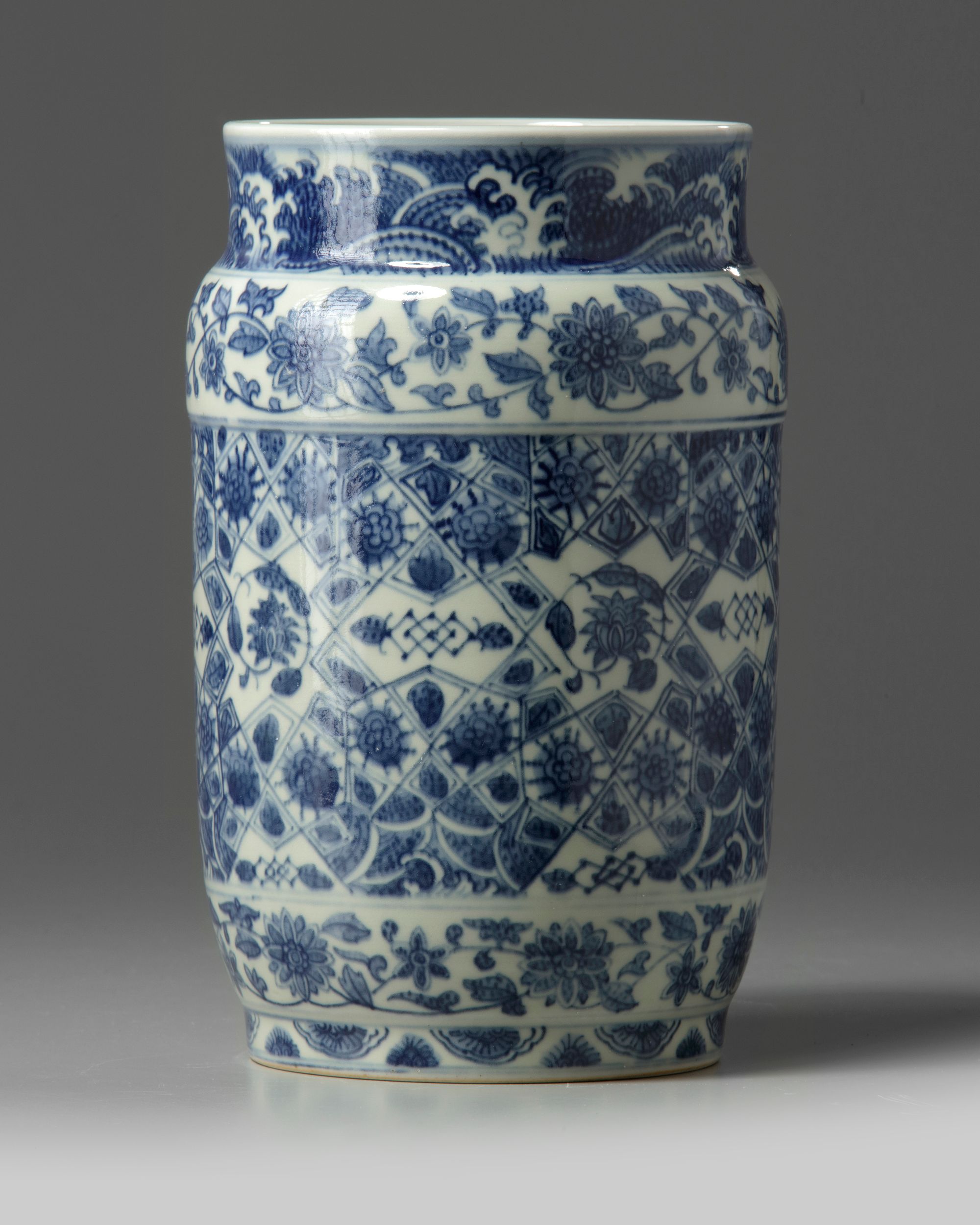 The vase is decorated to the exterior with a wide cracked geometric pattern enclosing various flowers, between bands of scrolling lotus. The rim is decorated with a band of cresting waves reserved on blue.The base and inside of the foot are unglazed.