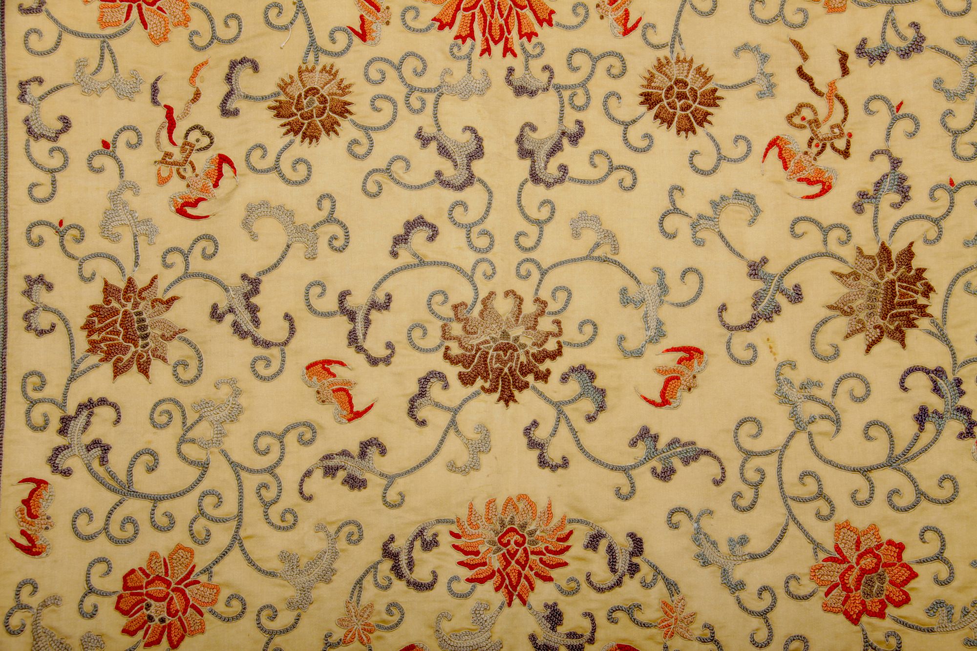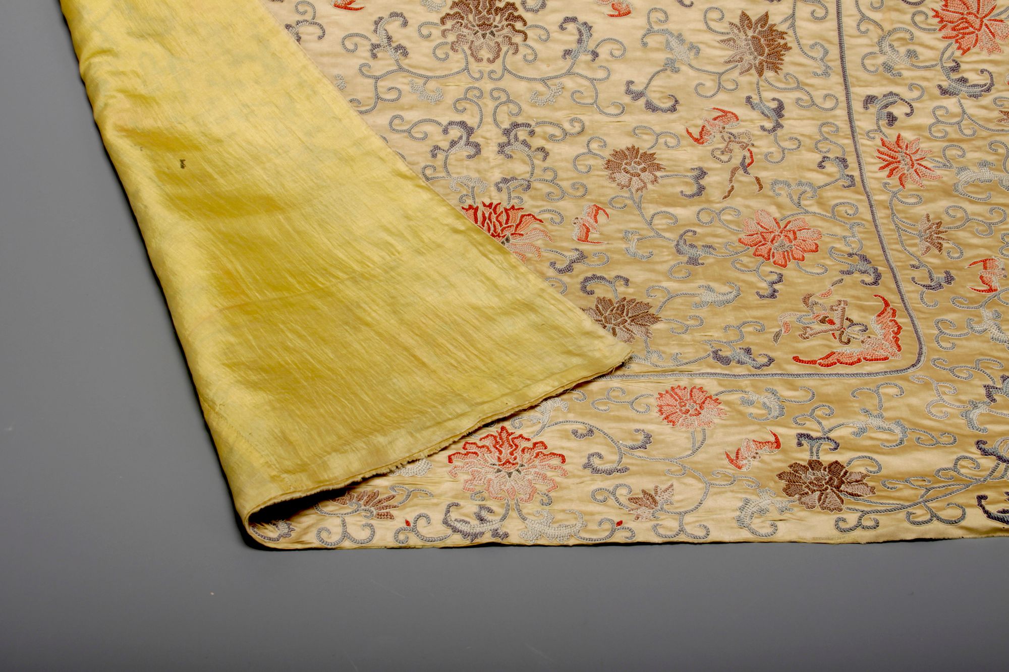 A rectangular silk kang cover (seat cover), the pale yellow ground embroidered in Peking knots with various stylised flowers, including lotus, chrysanthemum, peony, daisy and lily amongst trailing stems and foliage. The symmetrical design set around a medallion with an open lotus flowerhead to the centre and bordered with bats in flight, some carrying ruyi heads and musical stones tied with ribbons. The design worked in shade of red, pink, blue, cream and aubergine silks. Lined with pale yellow silk.
