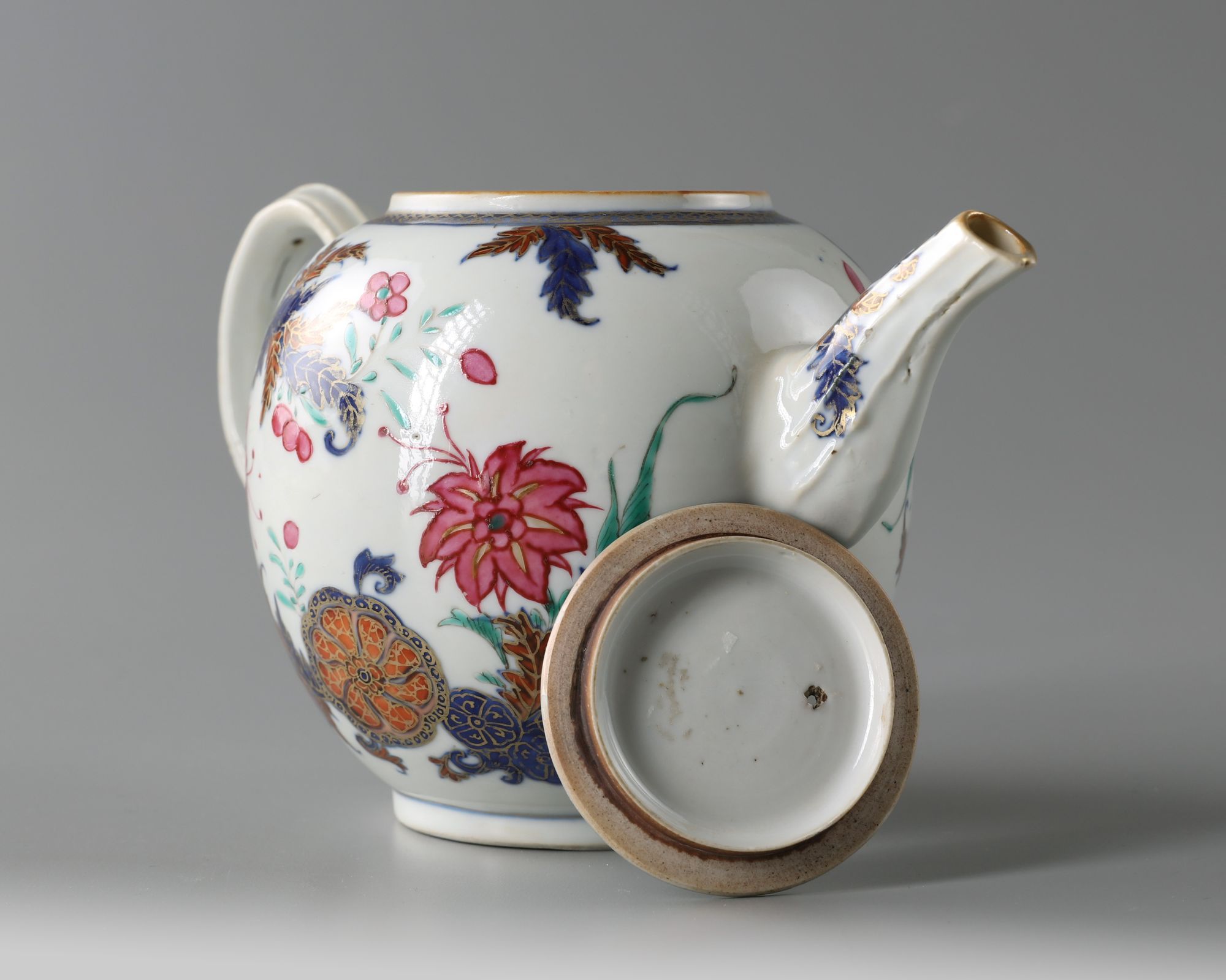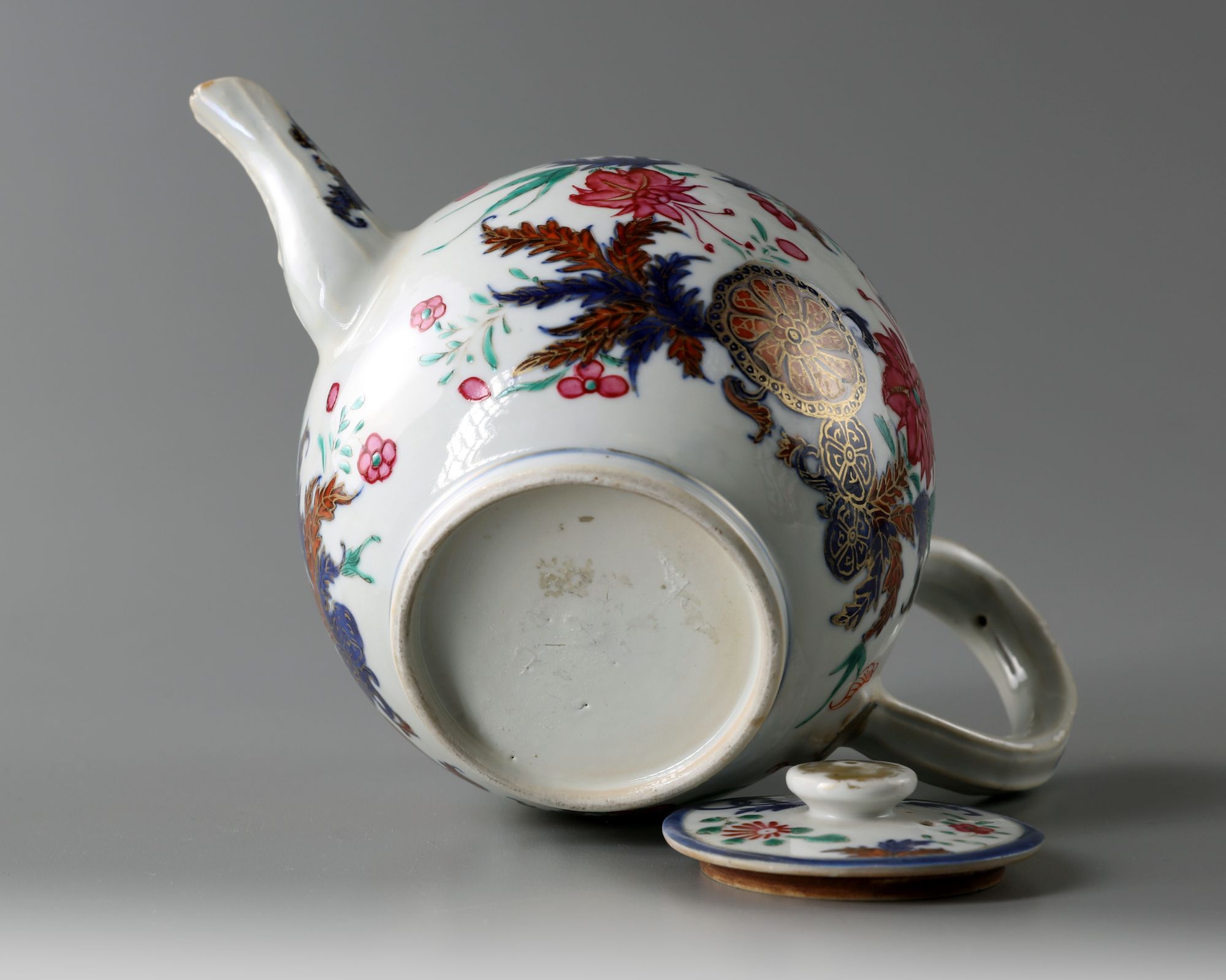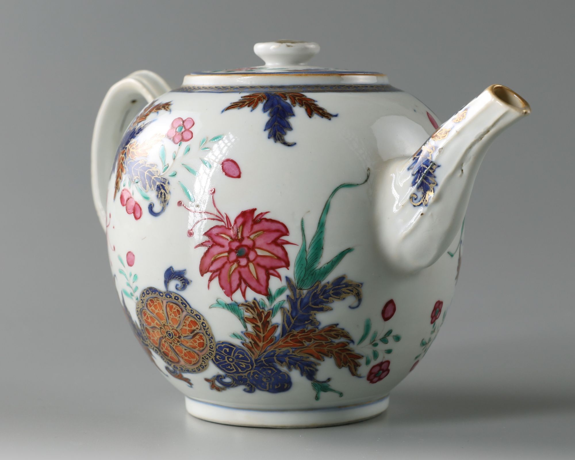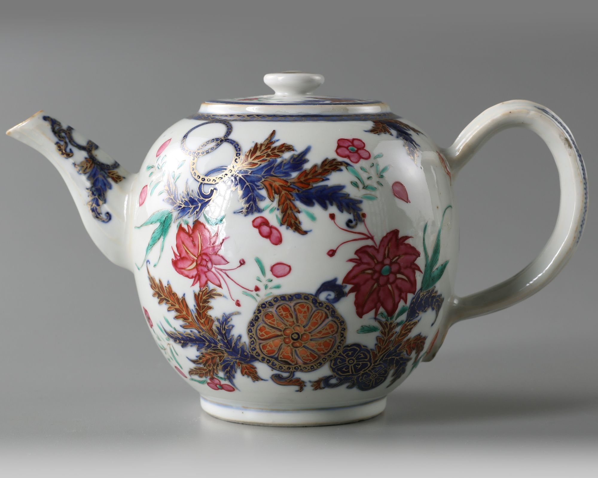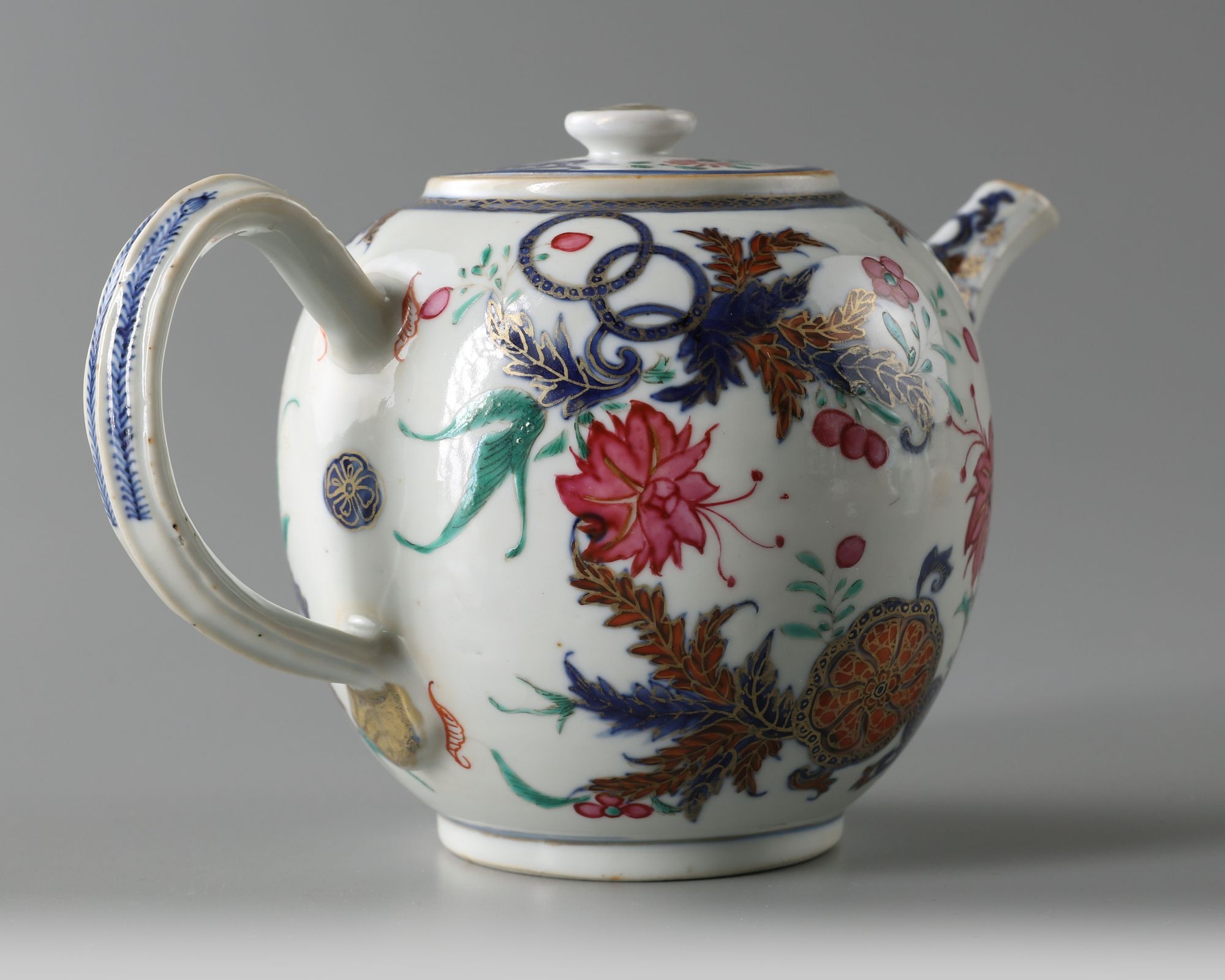 The teapot of globular form, handle and spout are moulded with ribbed decoration. It is decorated in famille rose enamels and gold with floral motifs in the pseudo tobacco leaf pattern.
