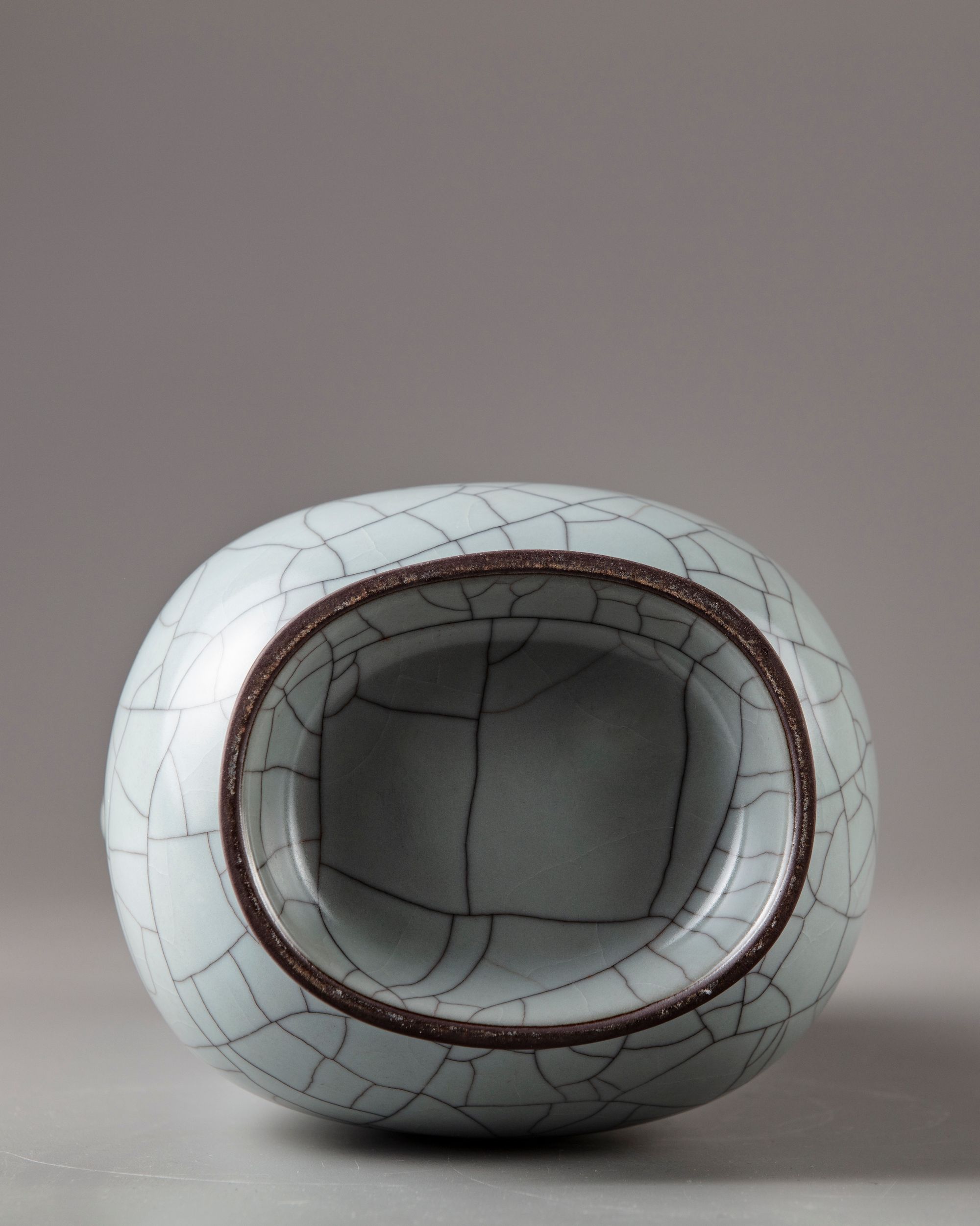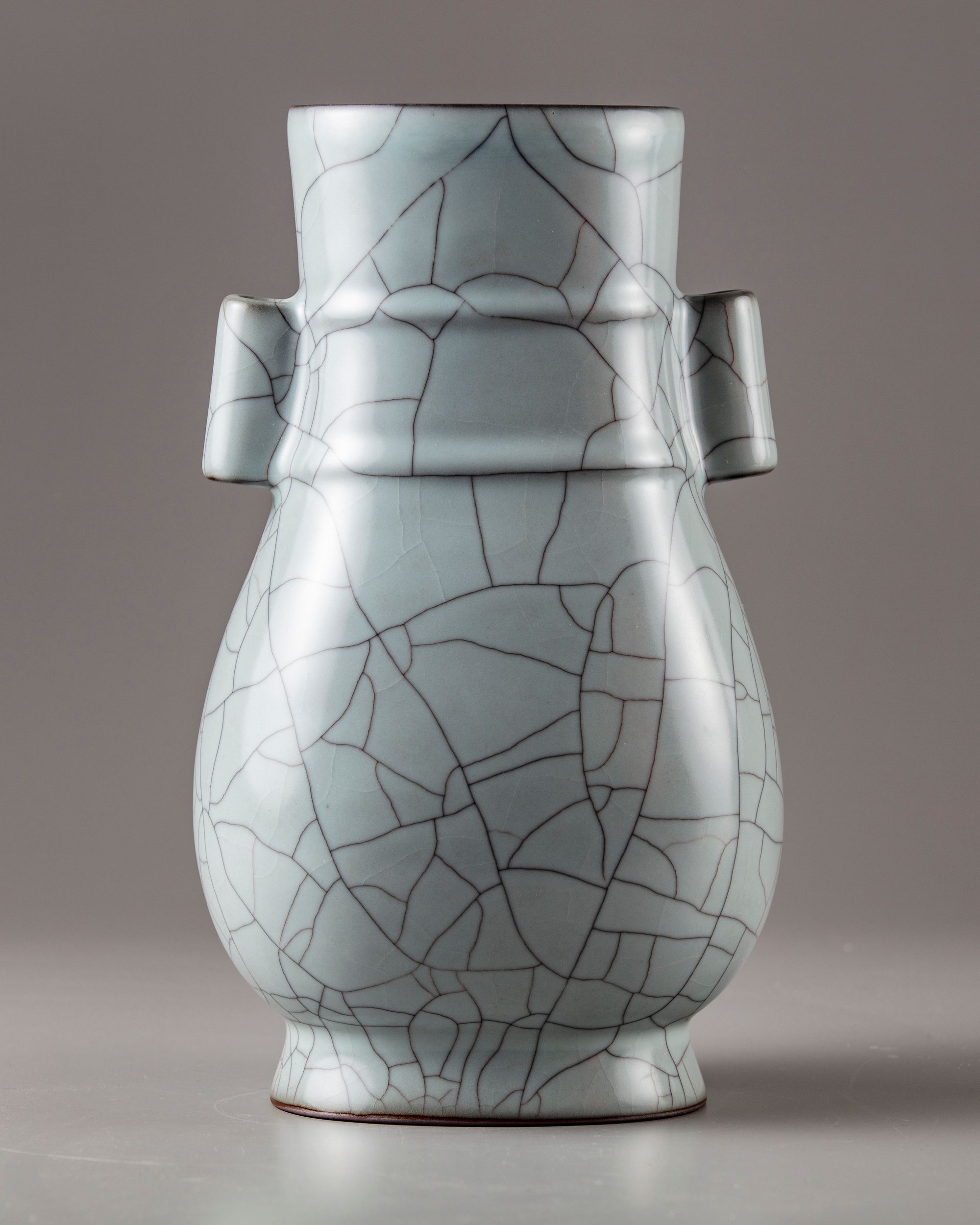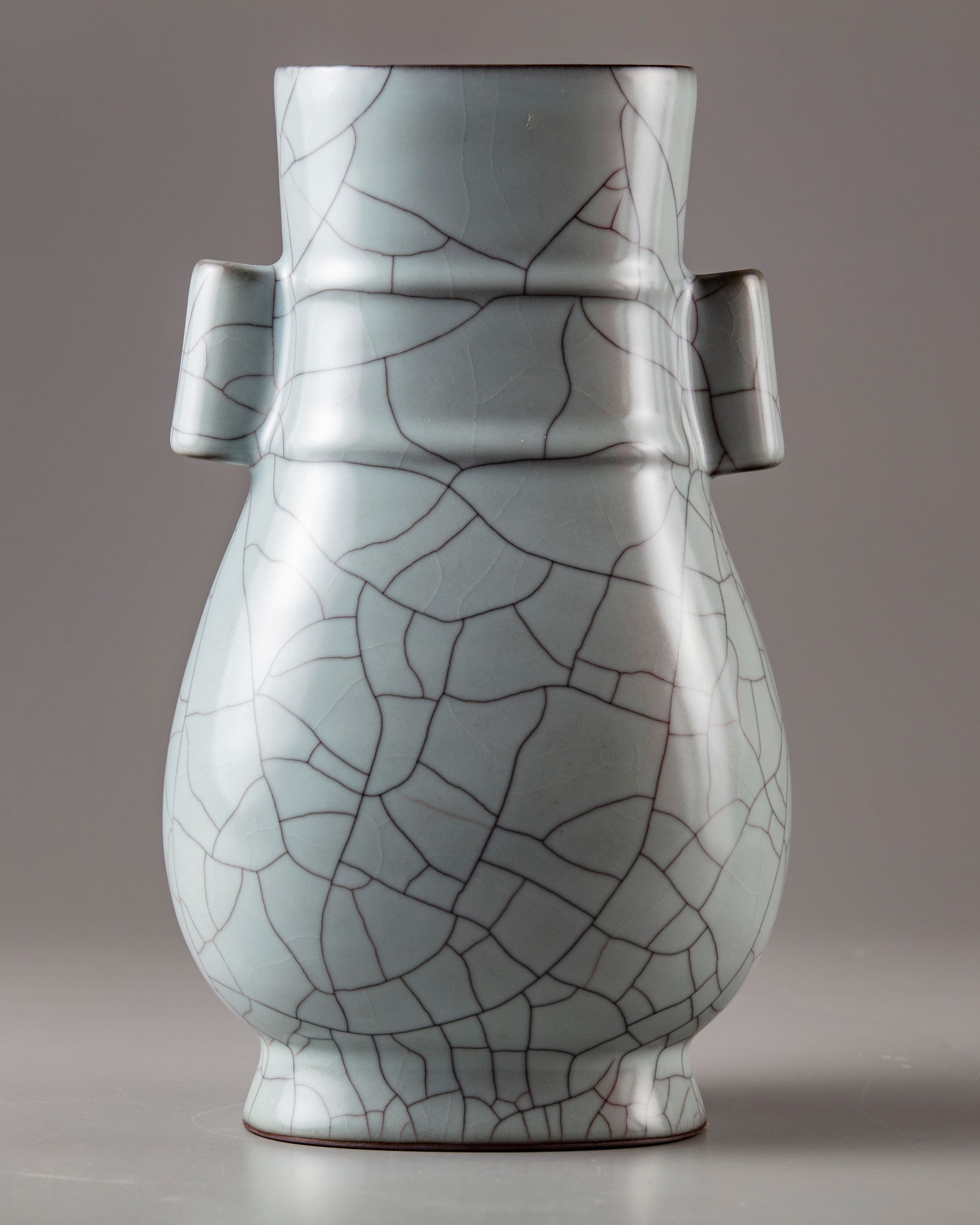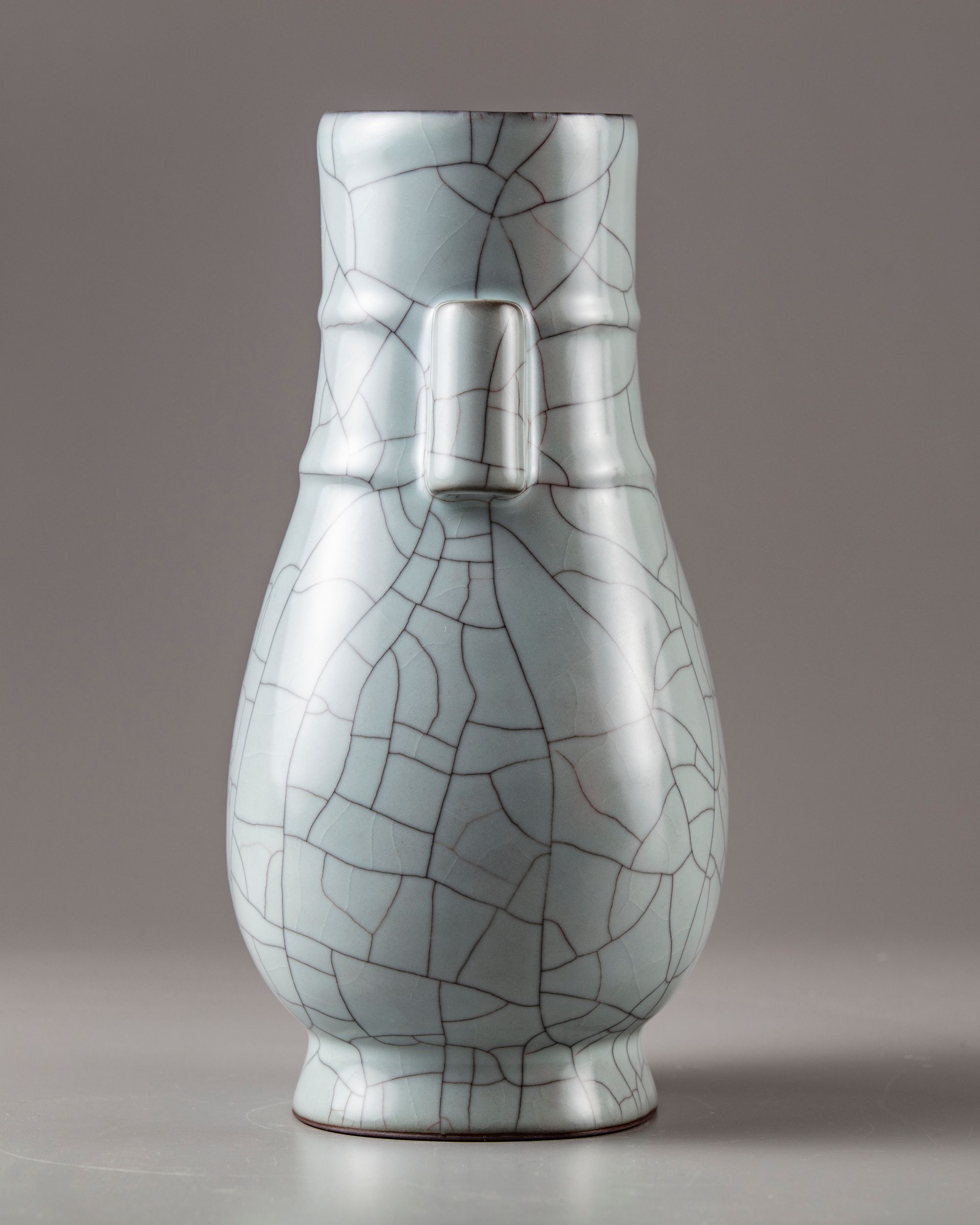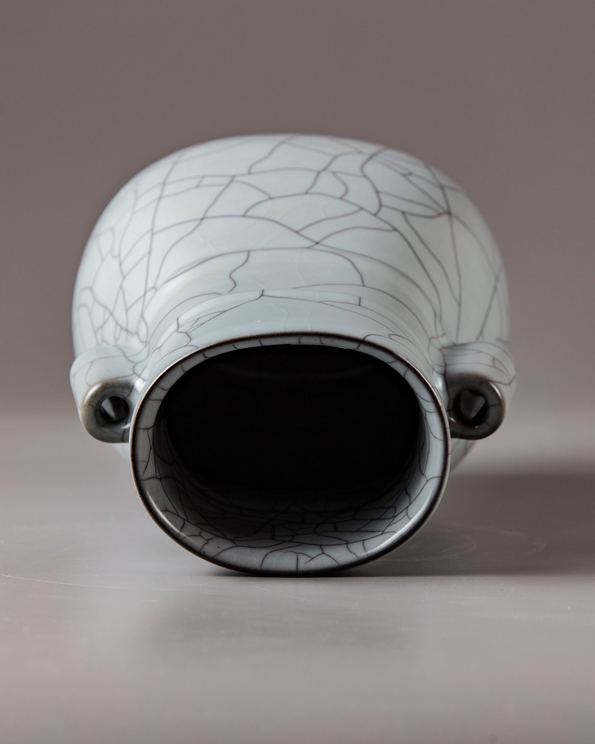Of pear shape, molded with two double bow-string bands below a pair of lug handles that flank the neck covered overall with a pale, very slightly greenish-grey glaze suffused with an irregular pattern of dark grey ('iron wire') crackle, the unglazed bottom of the foot covered with a brown dressing