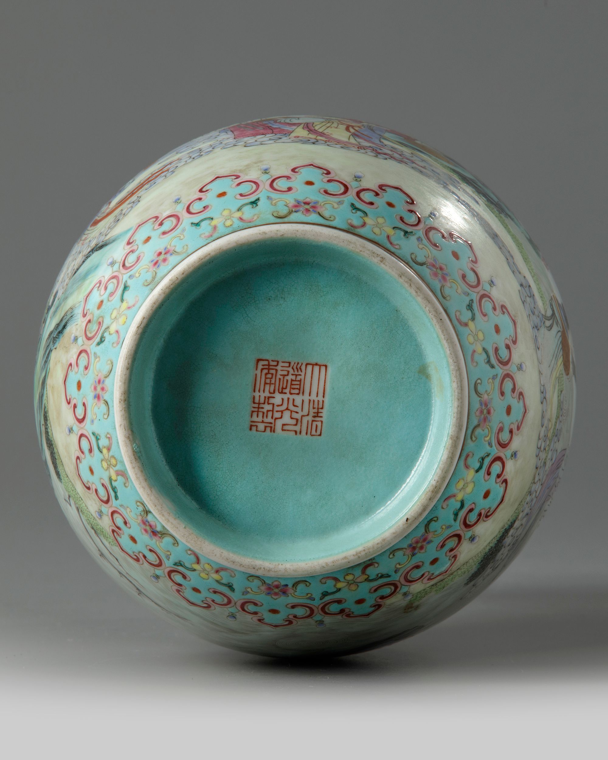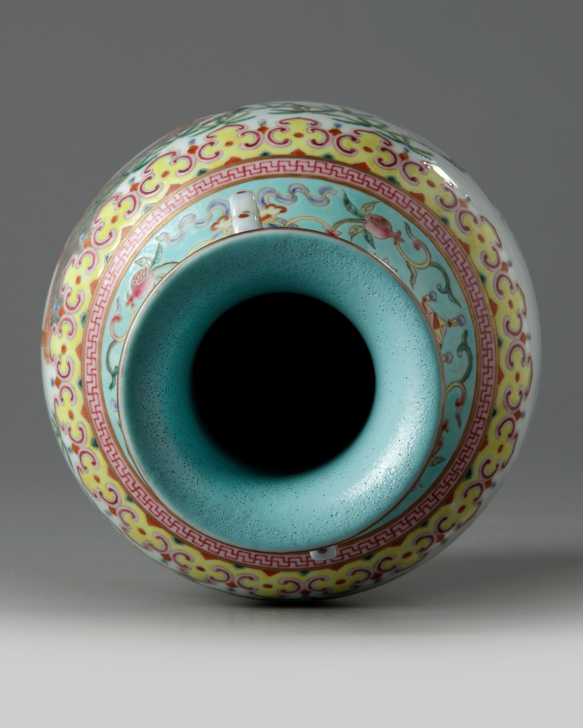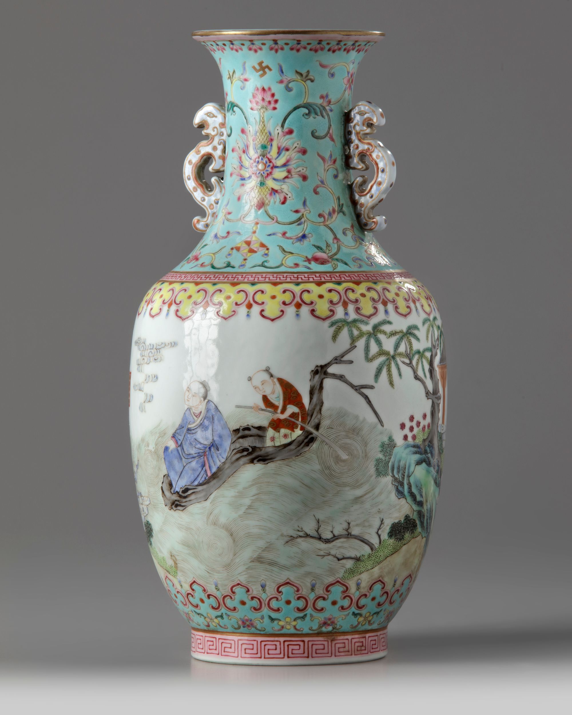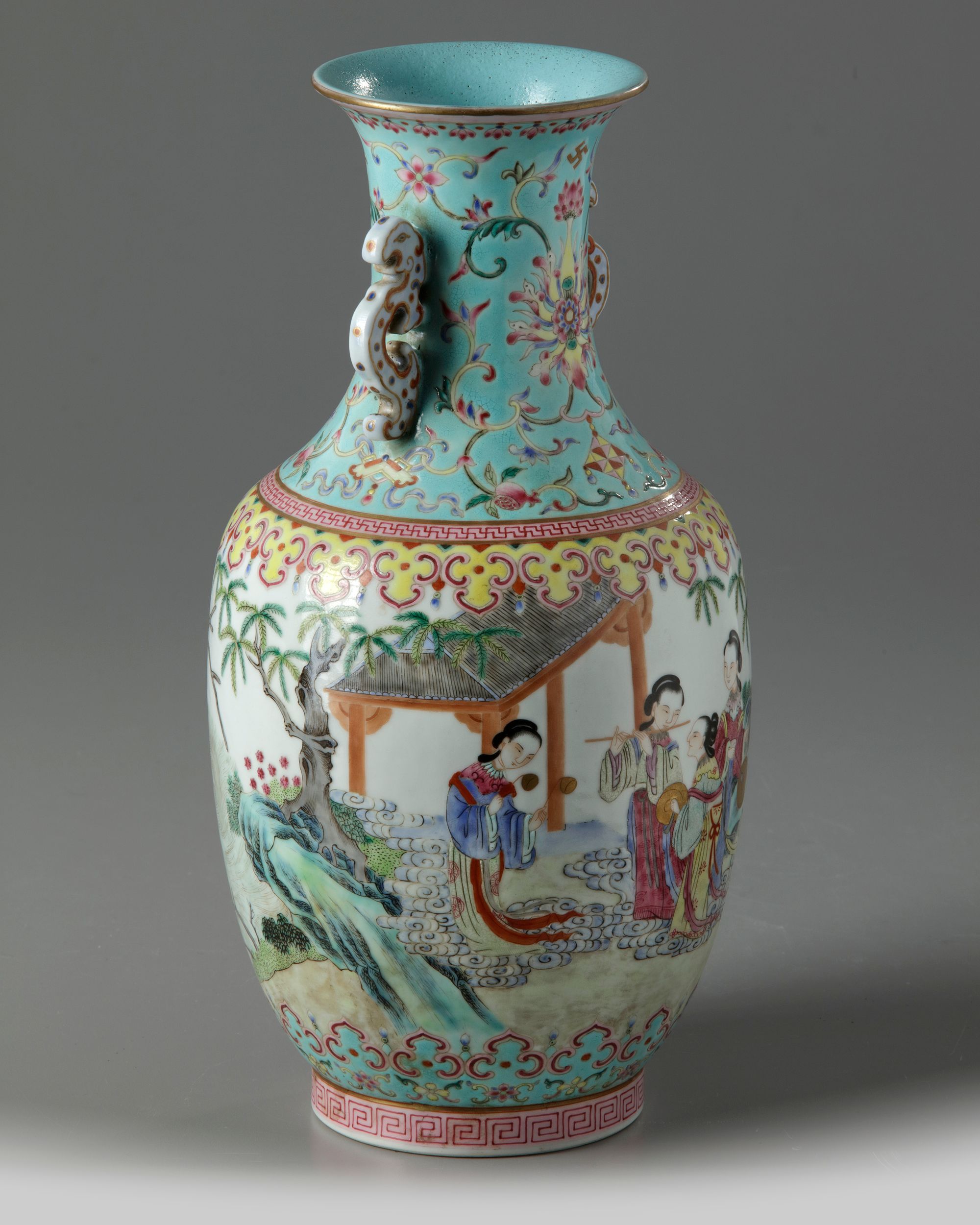 The vase is decorated and gilt with ladies at playing instruments before a gentleman seated on a boat, between two ruyi-head bands. The neck decorated with pomegranate and lotus on a turquoise ground and is affixed with two kui dragon handles. The interior and base are glazed turquoise with an apocryphal Daoguang mark.