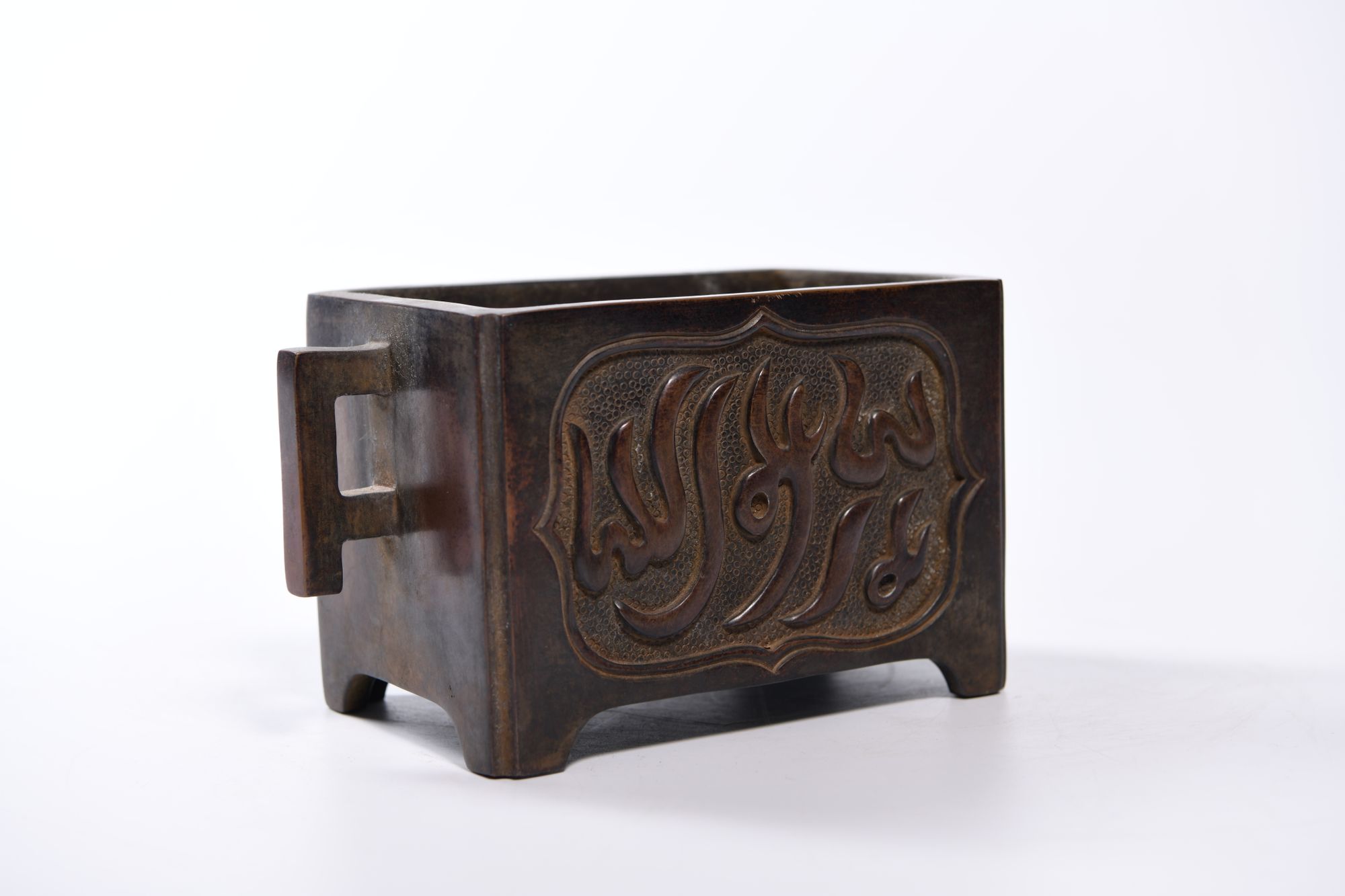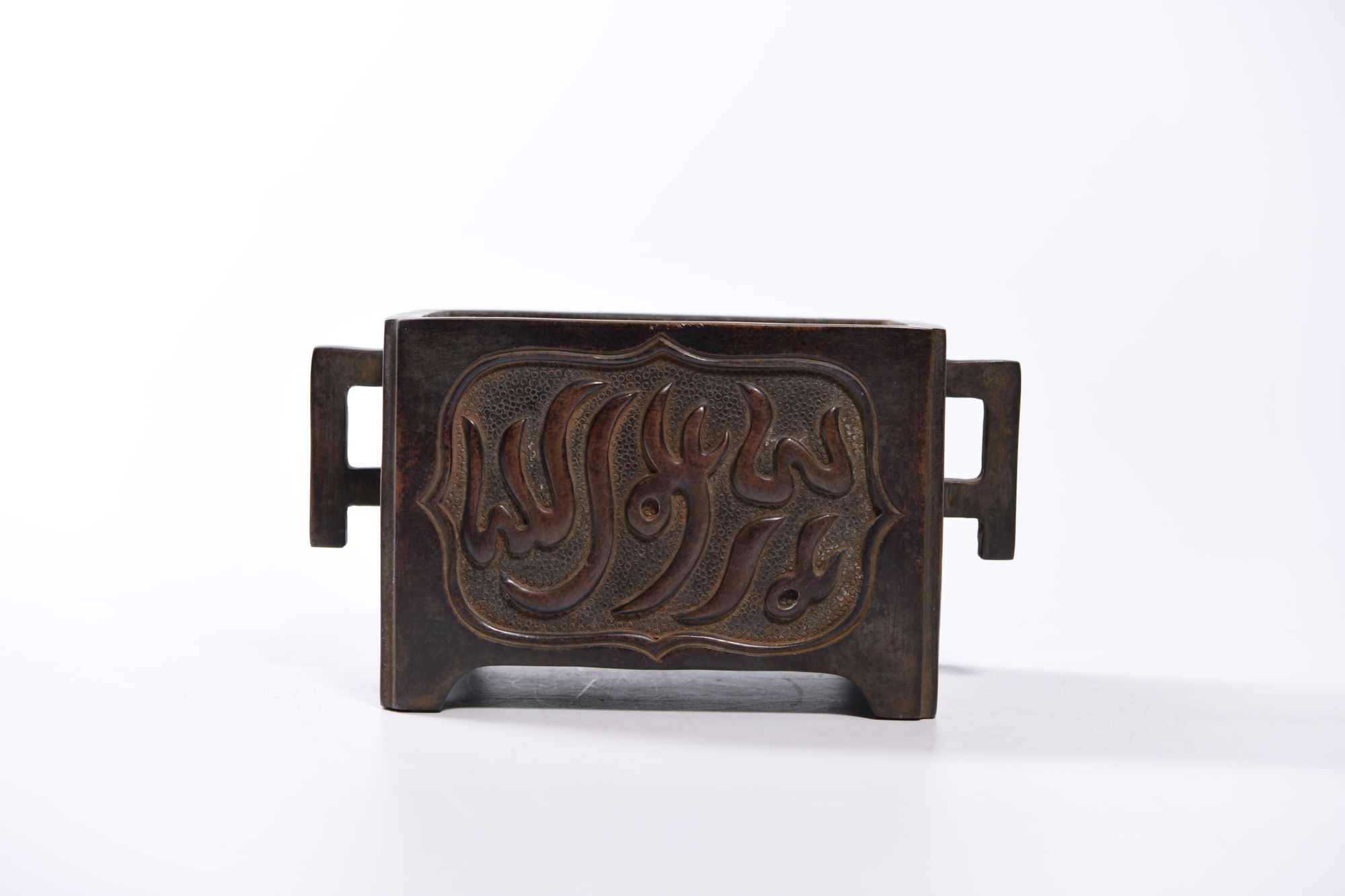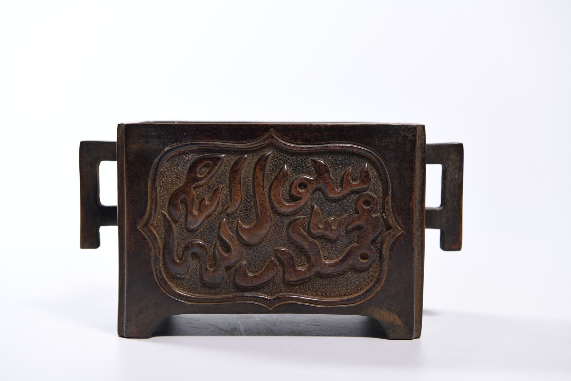 A Chinese bronze rectangular censer on four small feet and two handles, cast with two panels enclosing Arabic inscriptions.