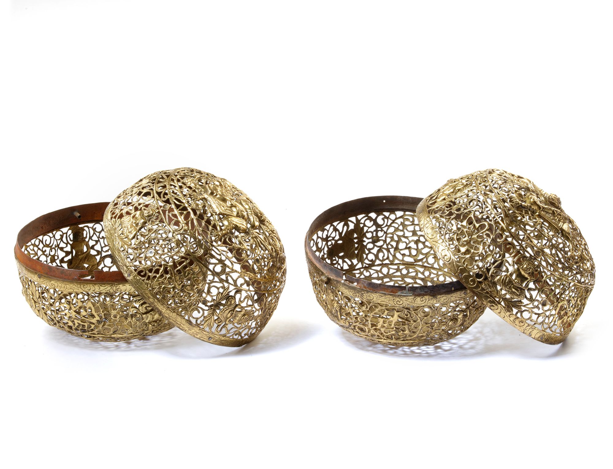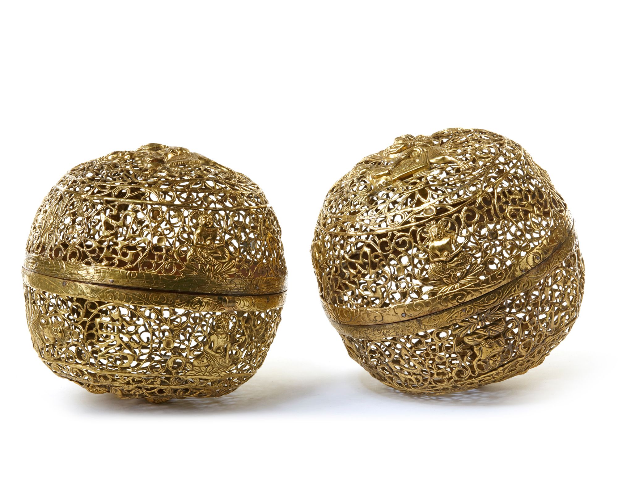 The burners decorated with the Tibetan auspicious symbols, Ashtamangala and figure of a seated Vajrasattva, 25 cm. diam.