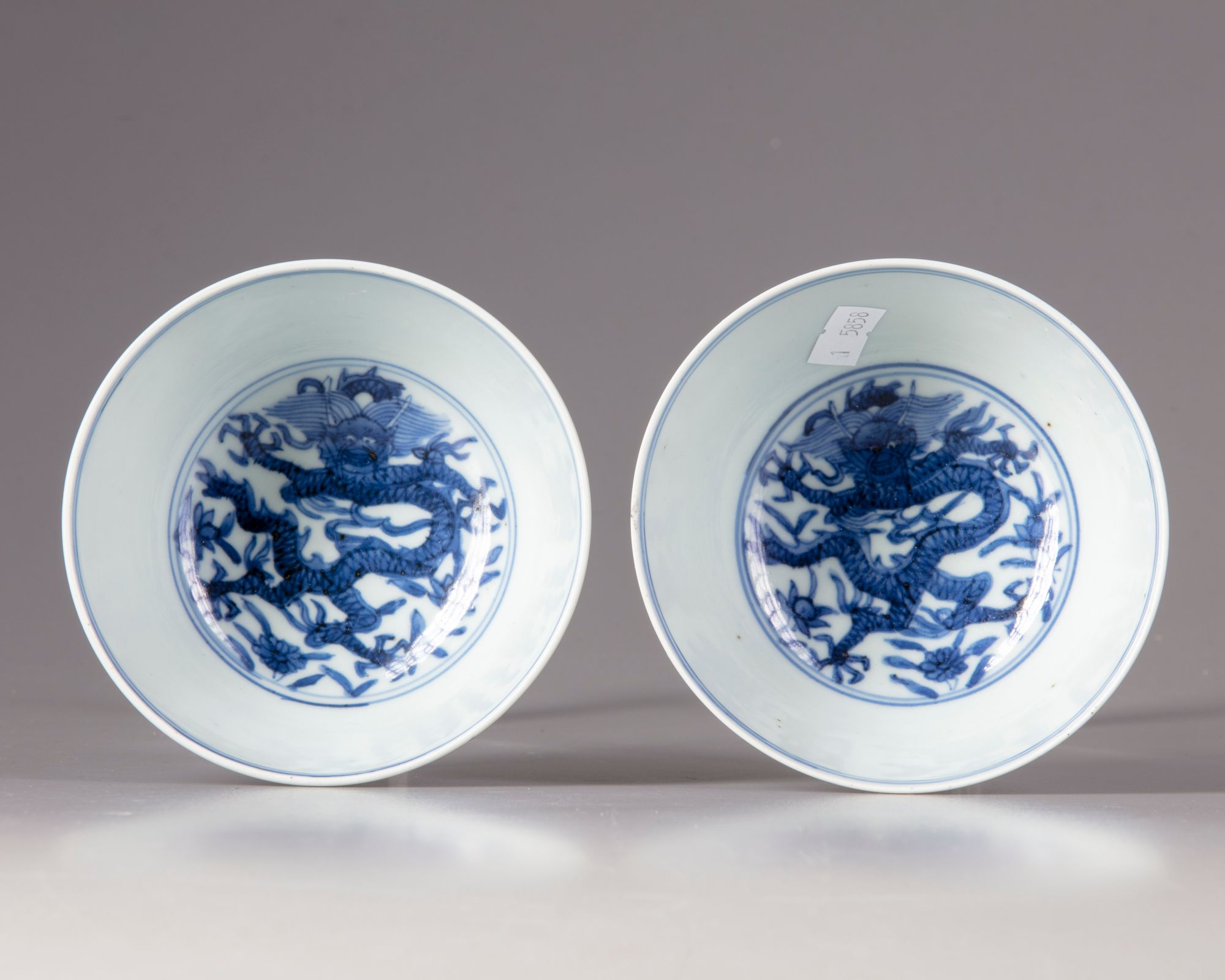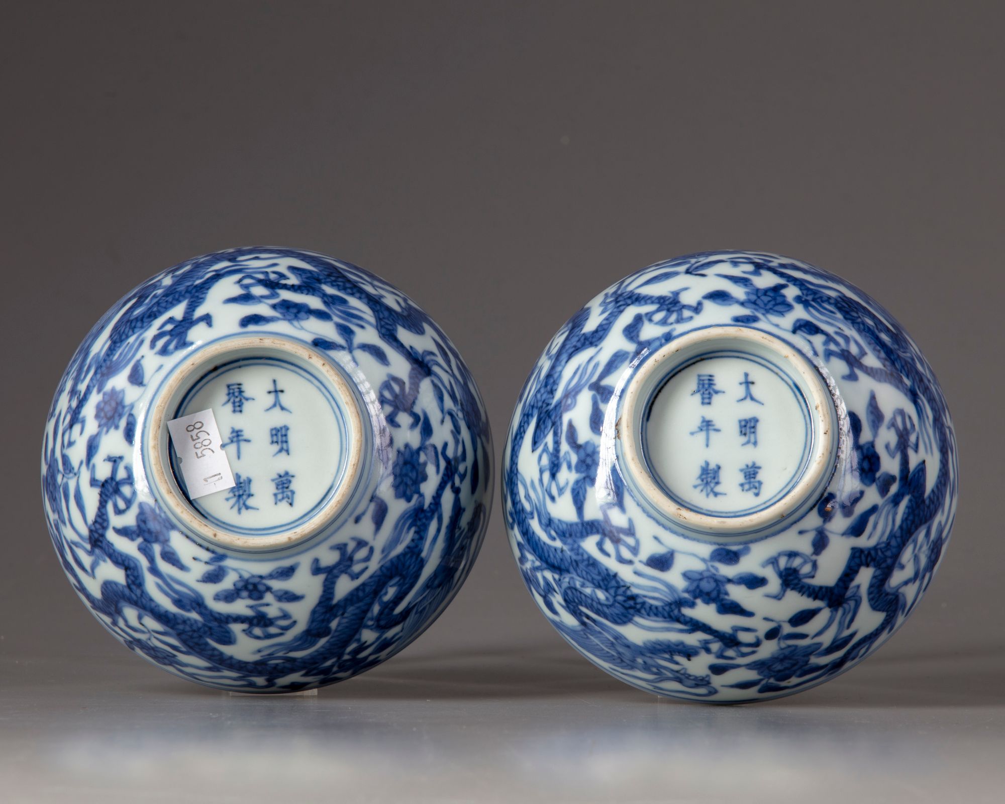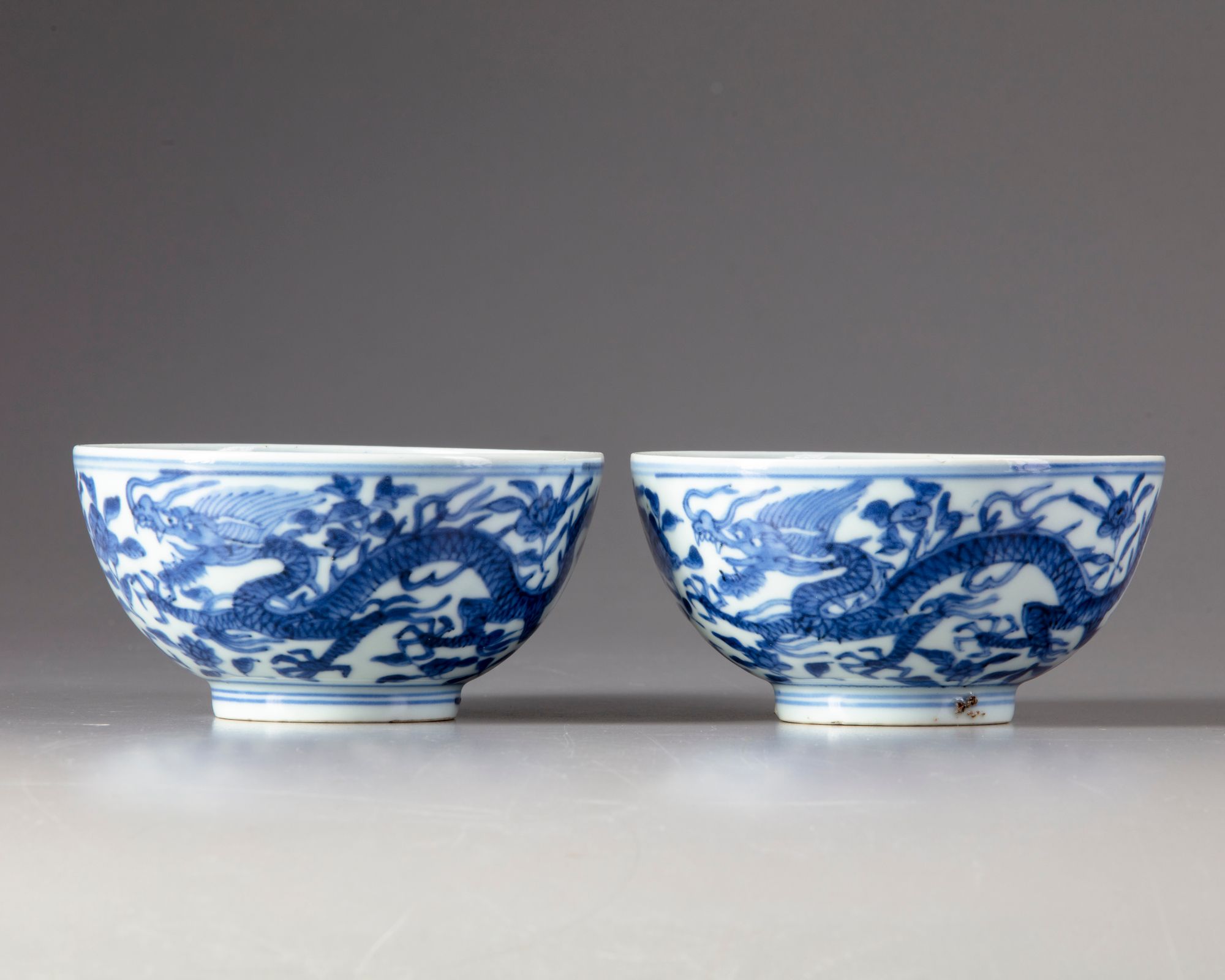 Two Chinese porcelain bowls, decorated to the interior with a roundel enclosing a dragon amongst flowers, to the exterior with two dragons amongst flowers with a Chinese Wanli six character mark within a double circle.